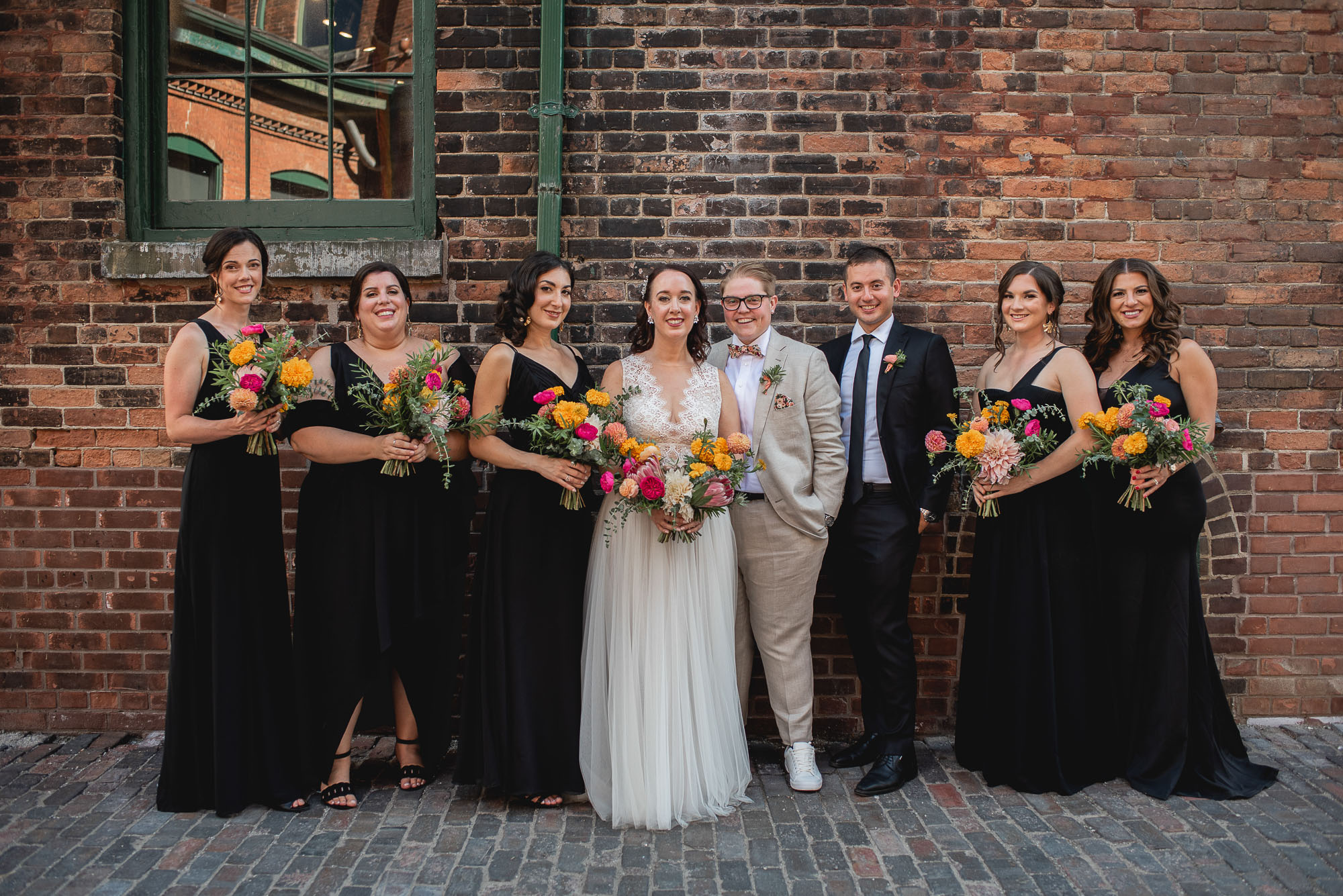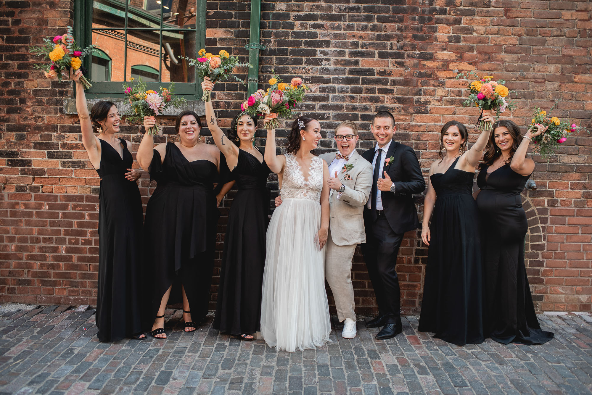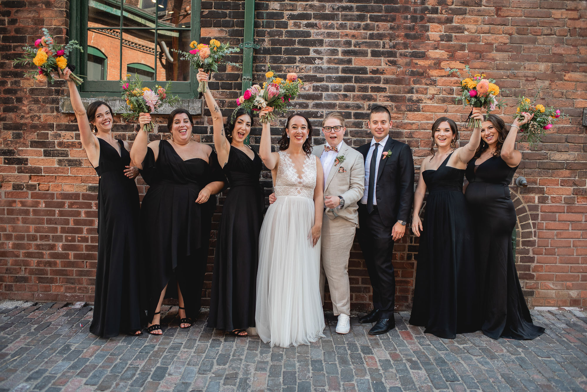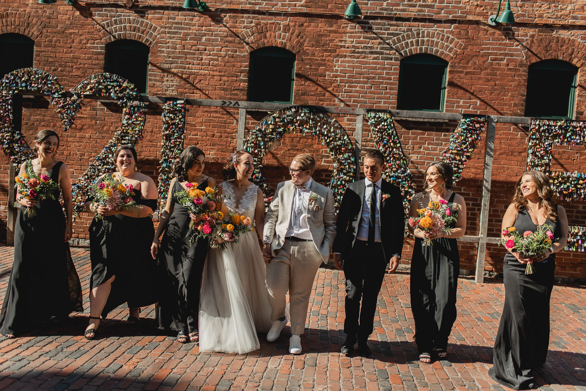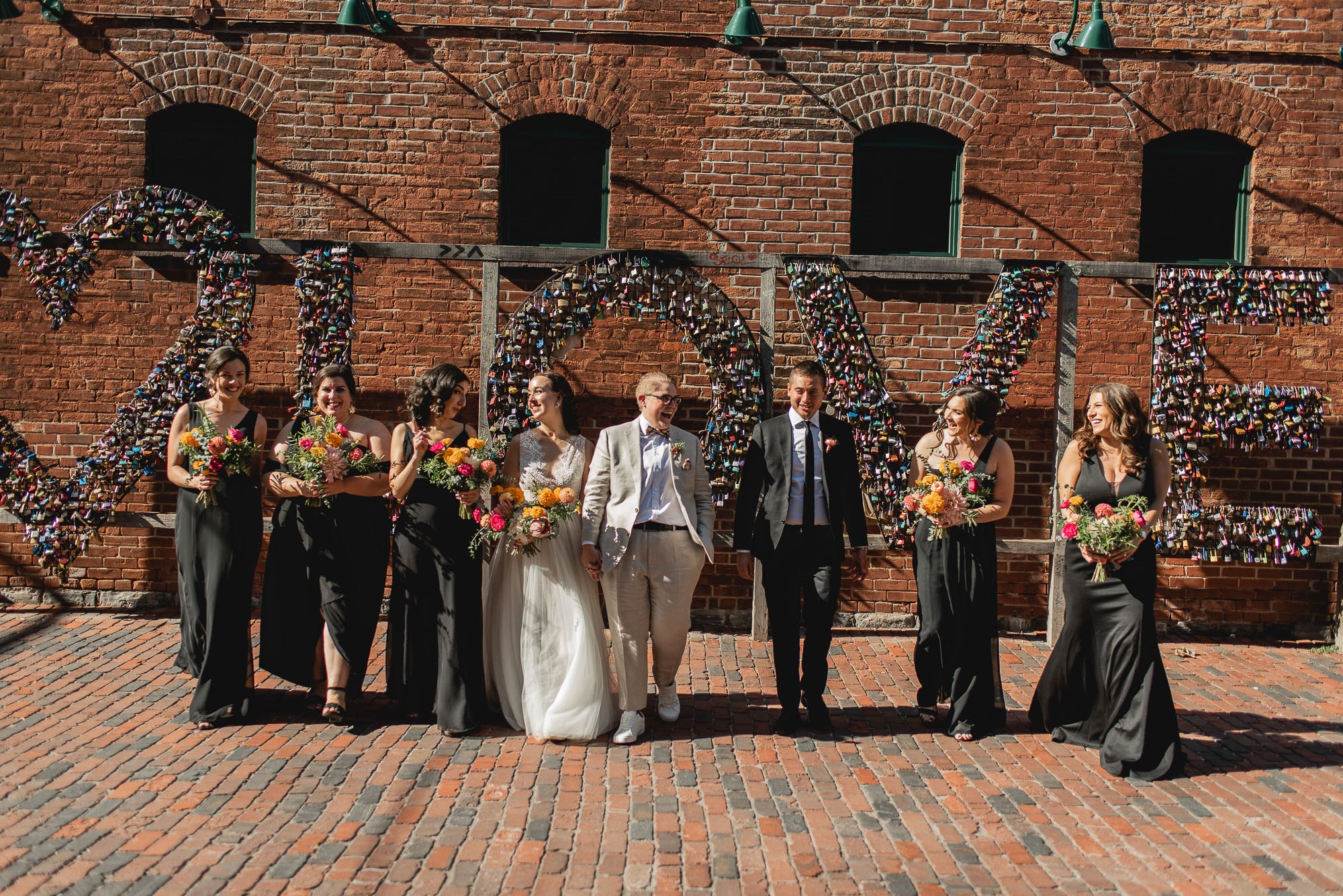 On their wedding day, we started the day with some candid getting-ready photos at their Toronto condo, followed by an emotional first look on the breezy rooftop. Sam didn’t hide her emotions seeing Laura in her wedding dress and I love the images that we captured. We then proceeded to the historic Distillery District for their bridal party portraits. It was a HOT September day so we stuck to the shade and had a great time! I love the goofy candids in particular!