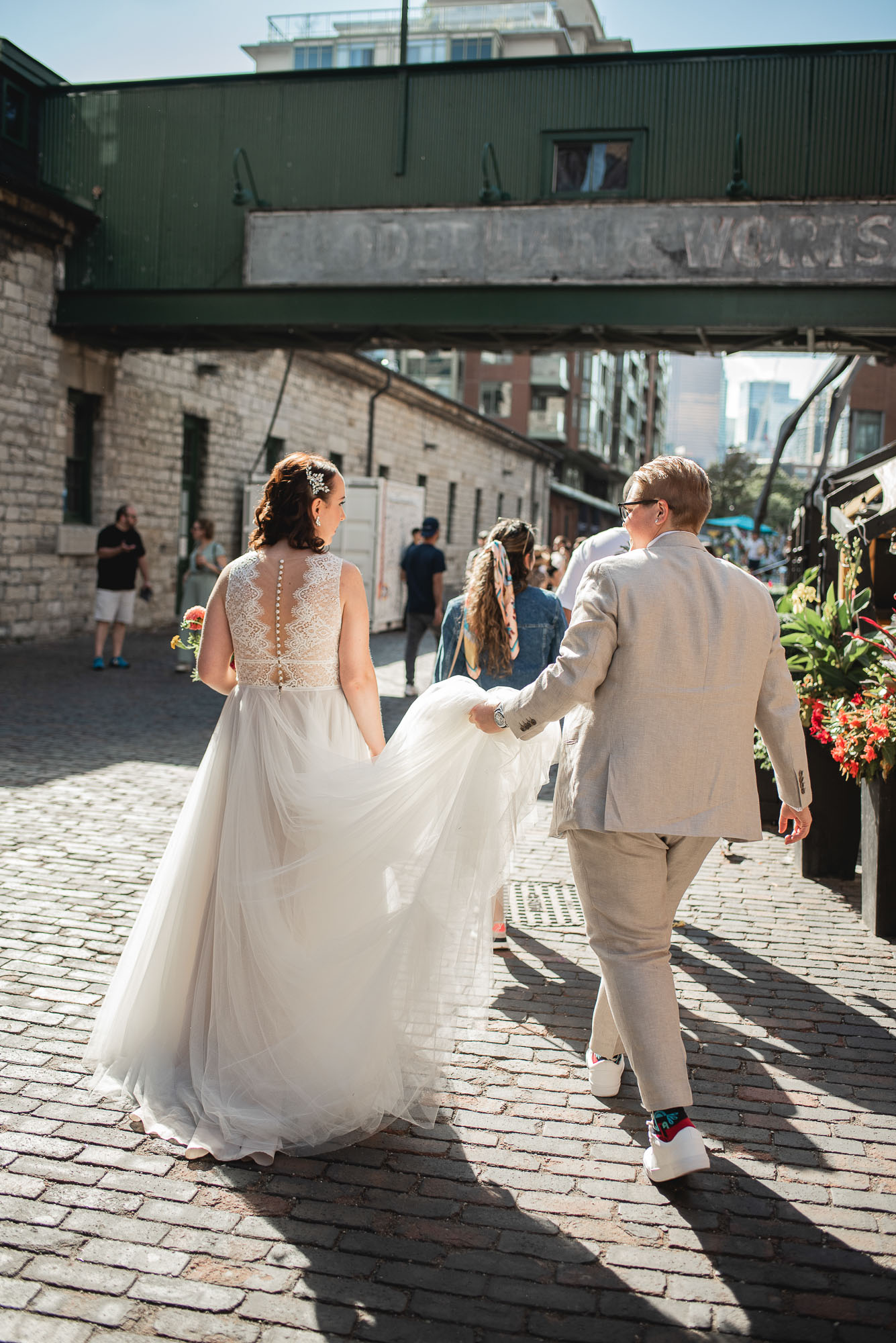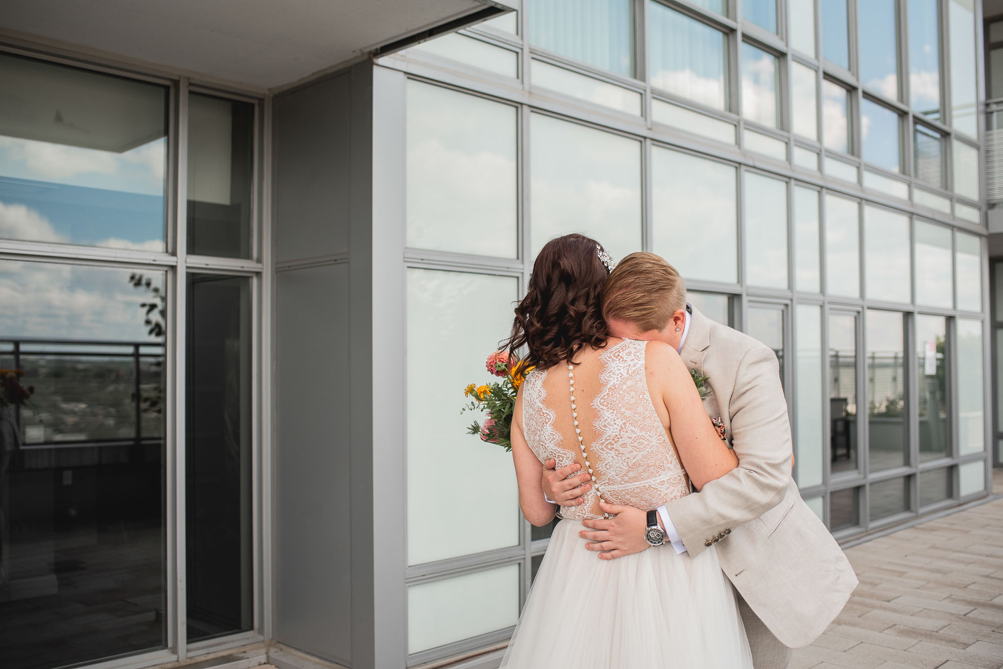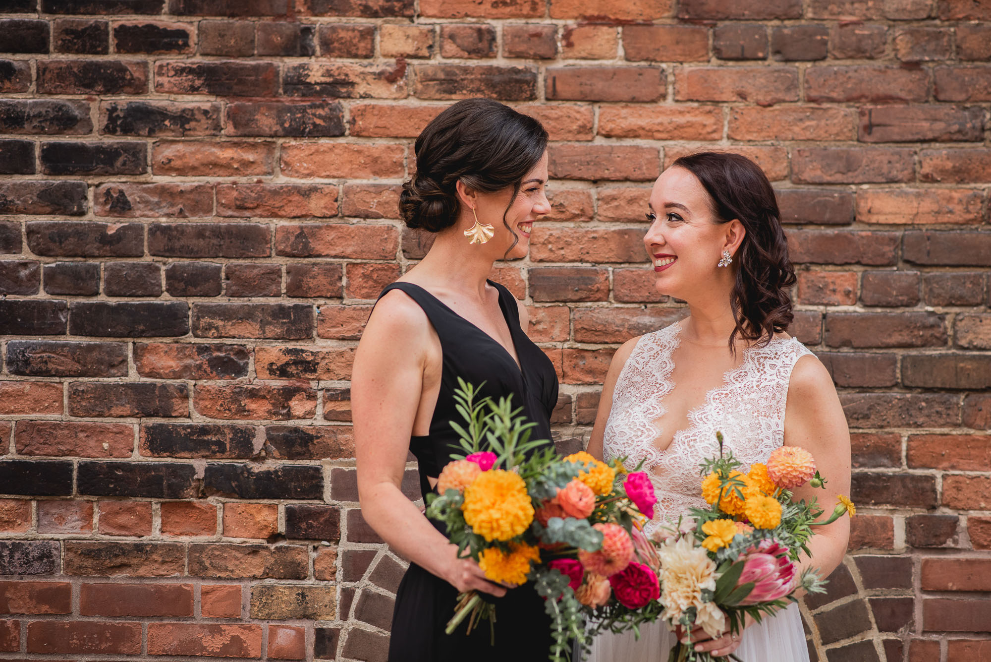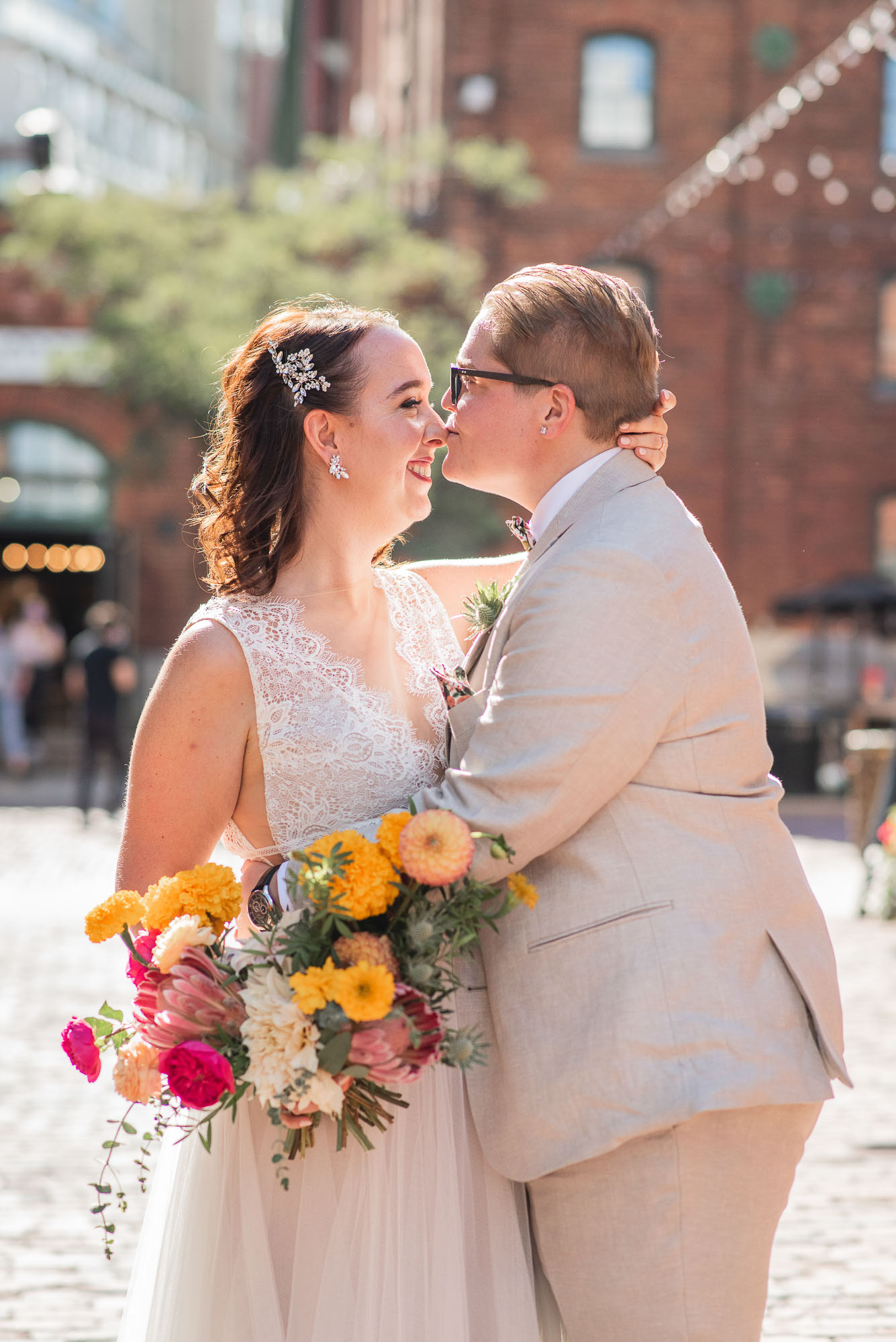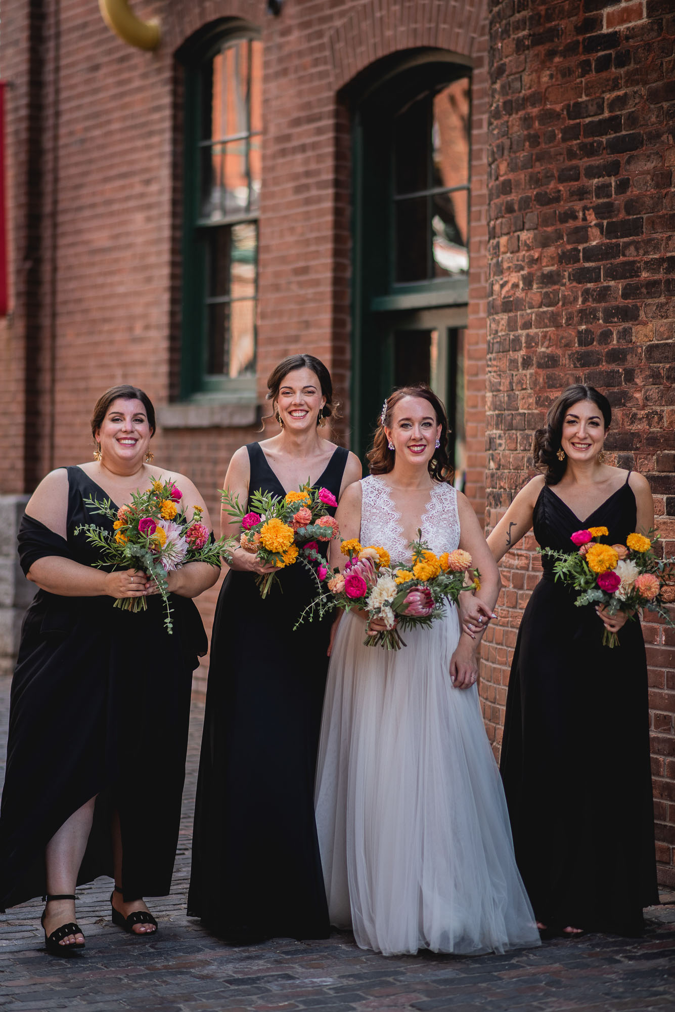 On their wedding day, we started the day with some candid getting-ready photos at their Toronto condo, followed by an emotional first look on the breezy rooftop. Sam didn’t hide her emotions seeing Laura in her wedding dress and I love the images that we captured. We then proceeded to the historic Distillery District for their bridal party portraits. It was a HOT September day so we stuck to the shade and had a great time! I love the goofy candids in particular!