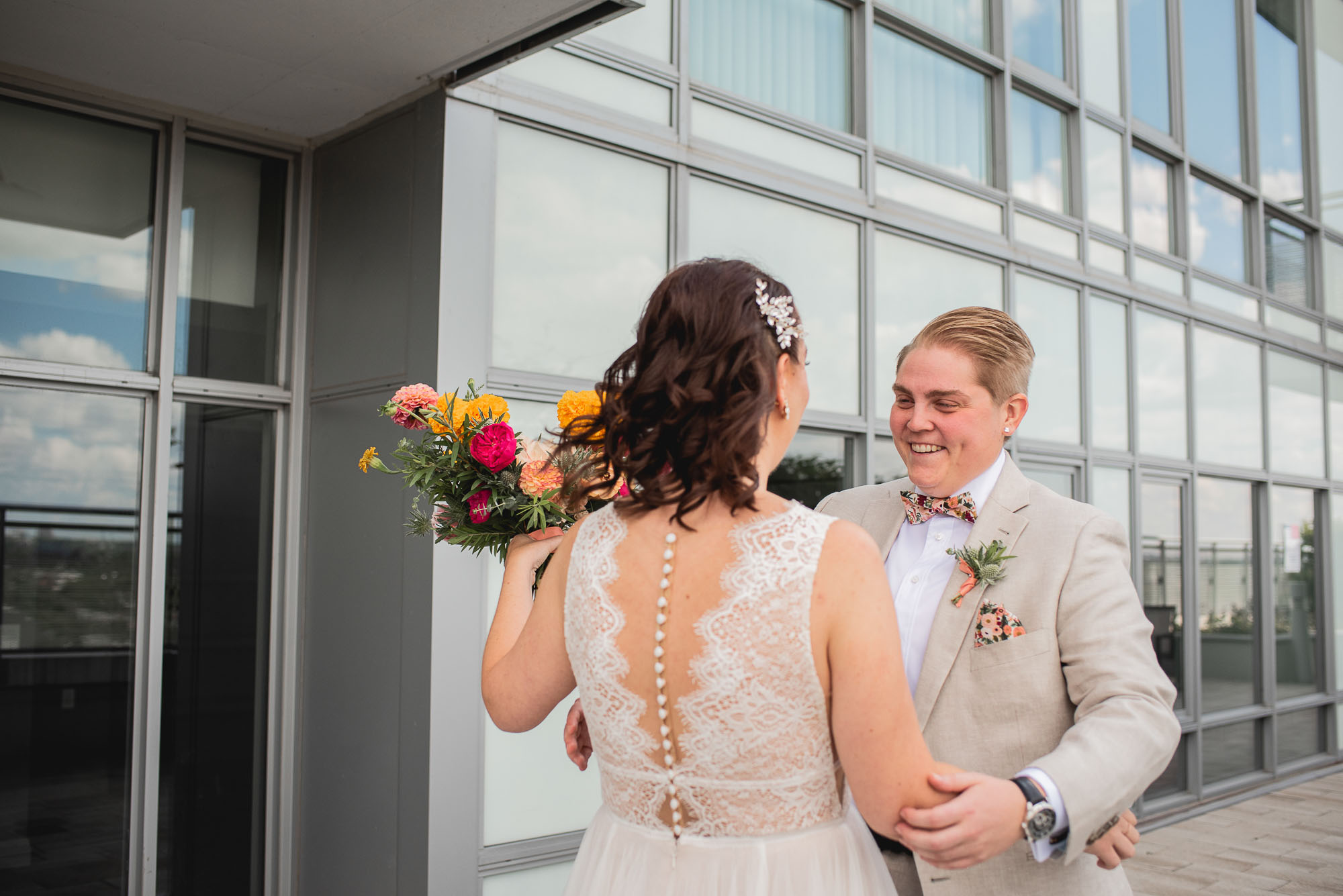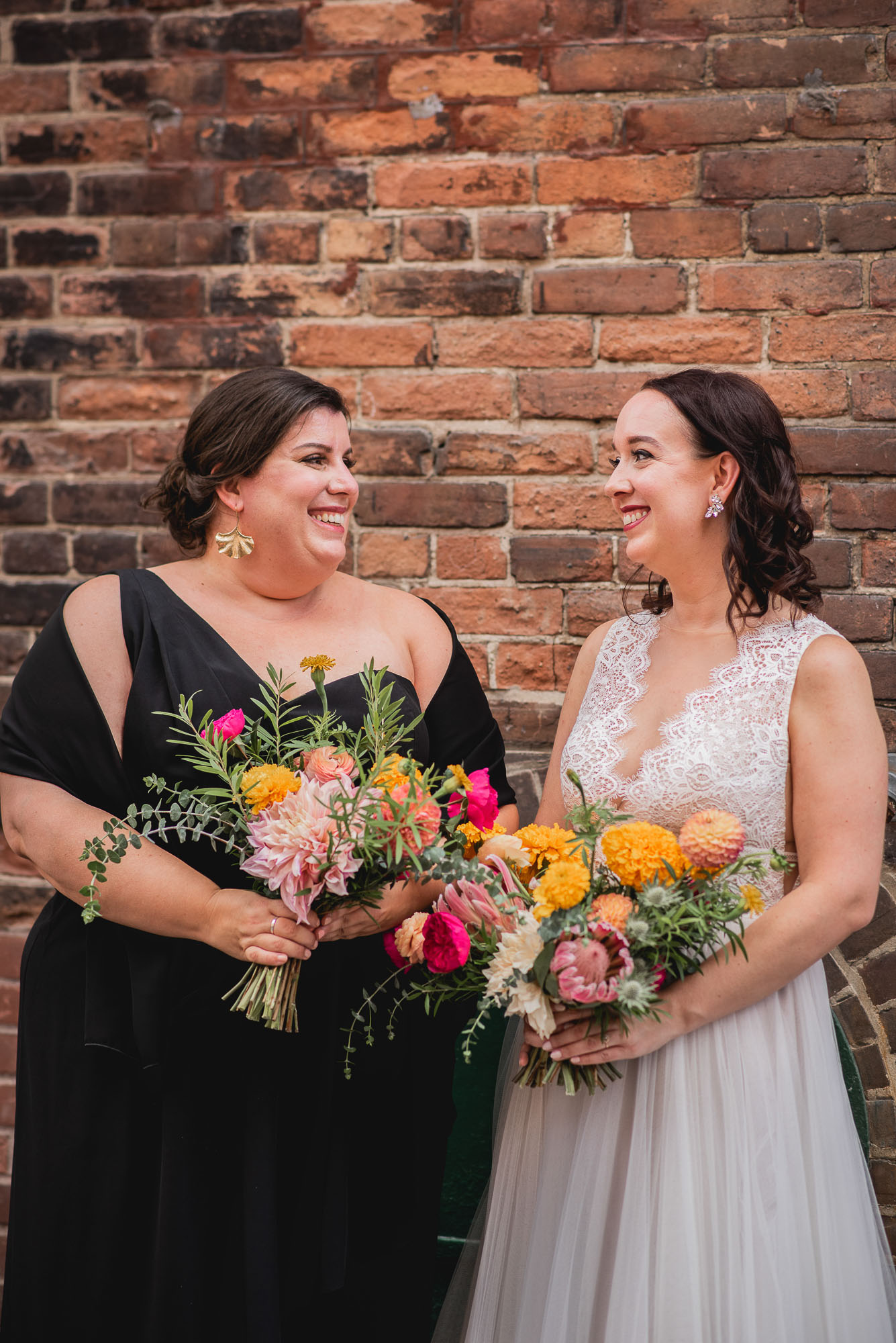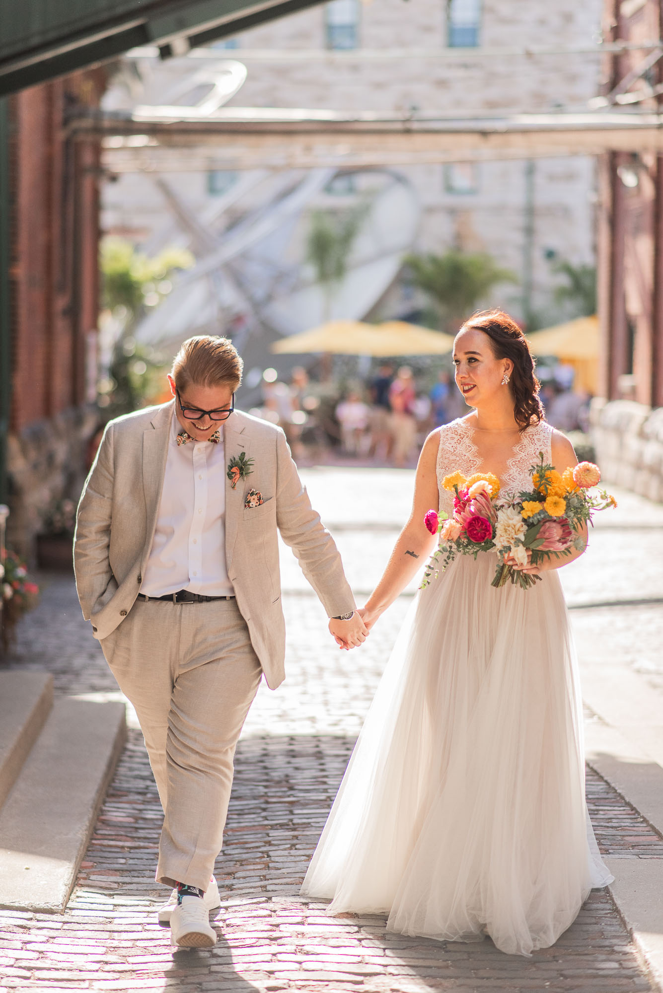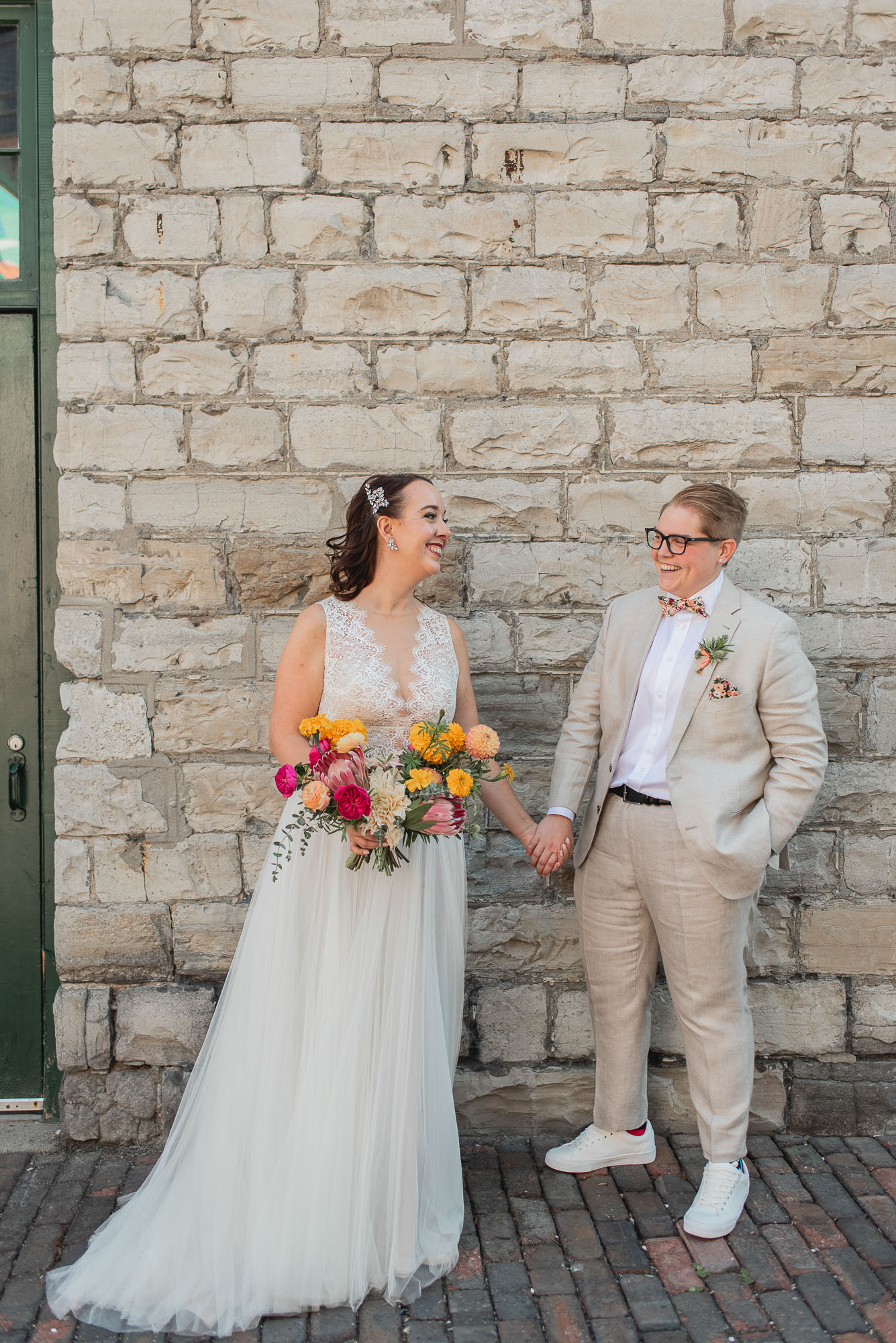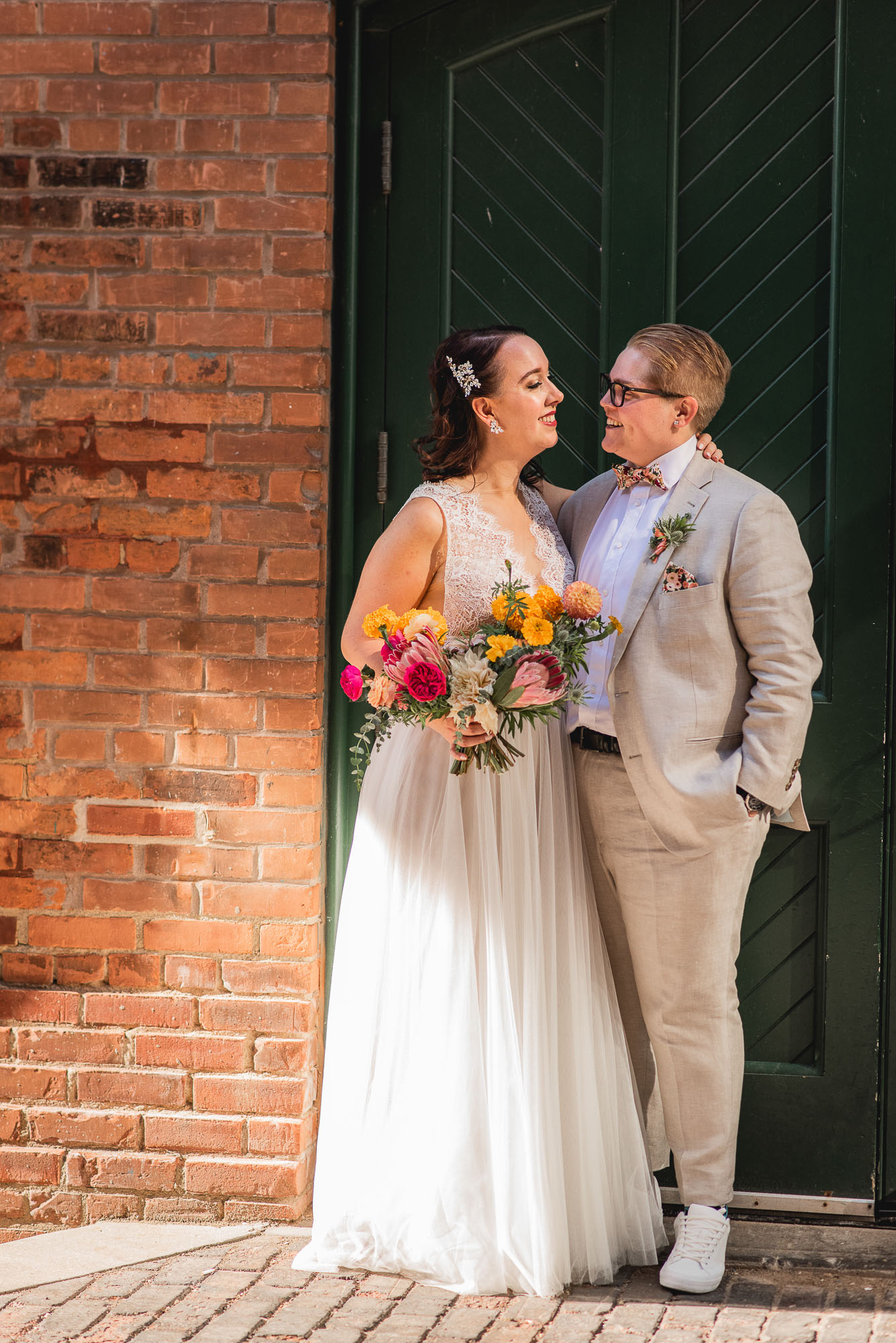 On their wedding day, we started the day with some candid getting-ready photos at their Toronto condo, followed by an emotional first look on the breezy rooftop. Sam didn’t hide her emotions seeing Laura in her wedding dress and I love the images that we captured. We then proceeded to the historic Distillery District for their bridal party portraits. It was a HOT September day so we stuck to the shade and had a great time! I love the goofy candids in particular!