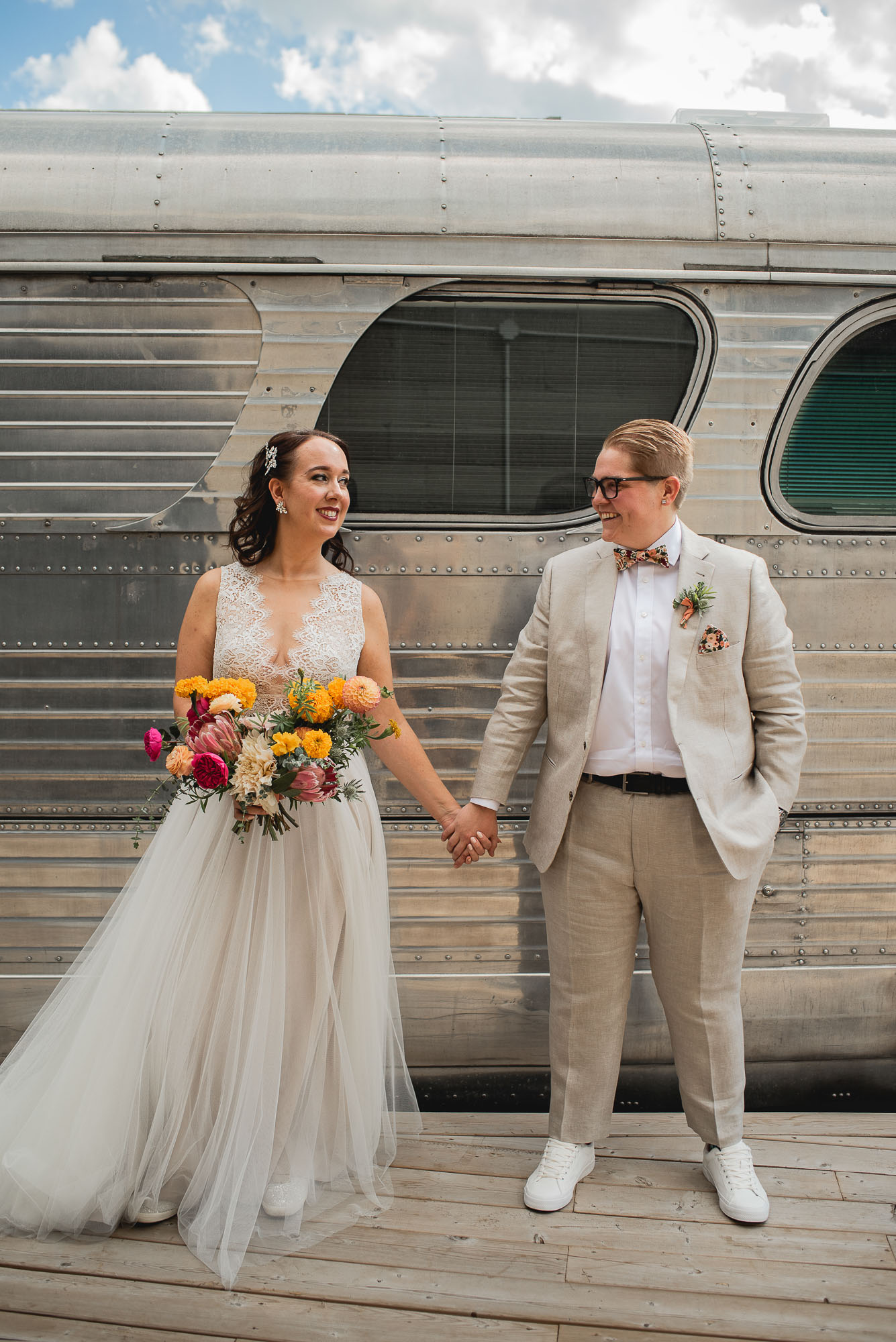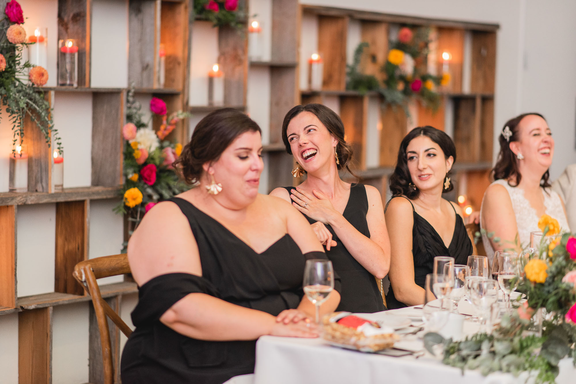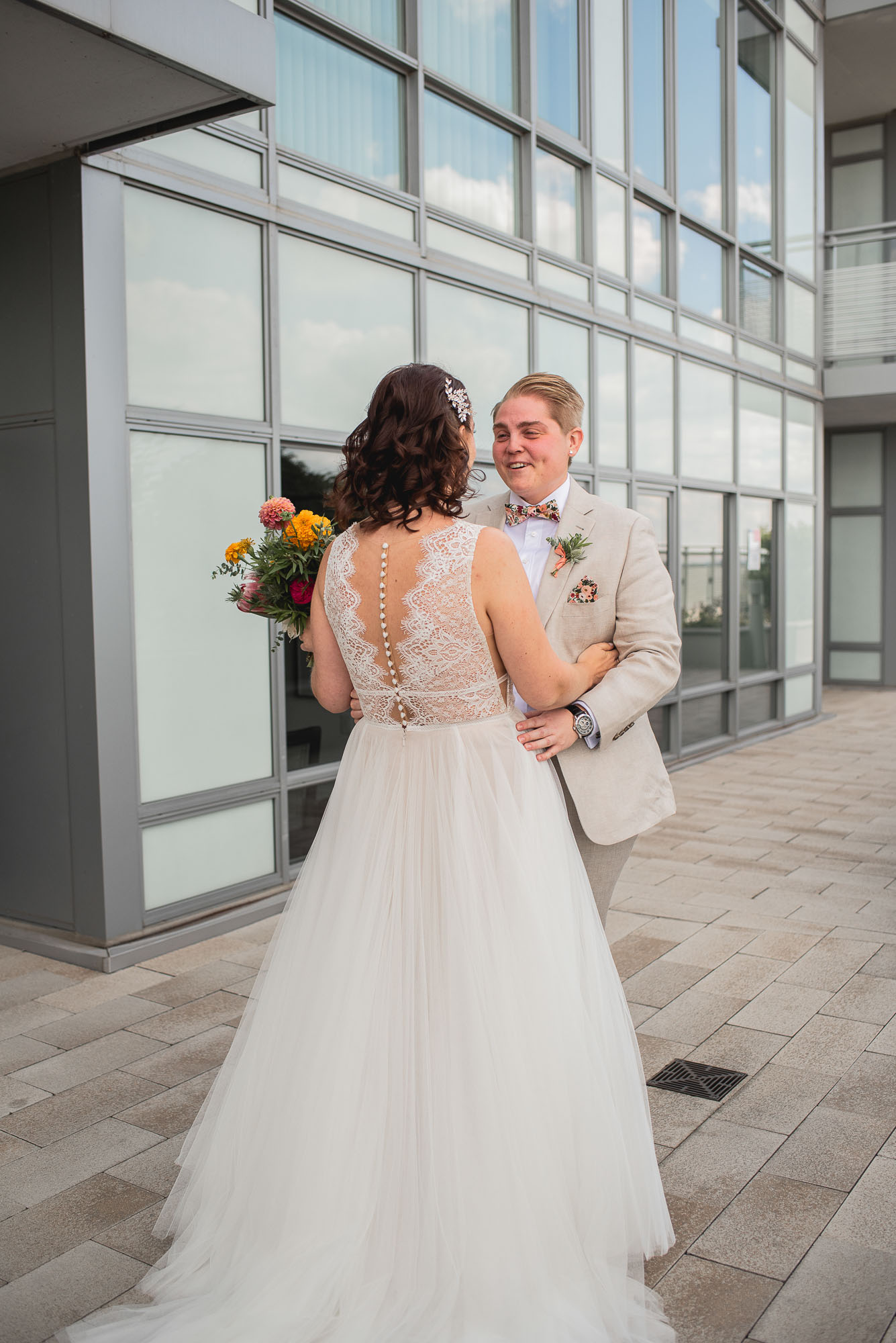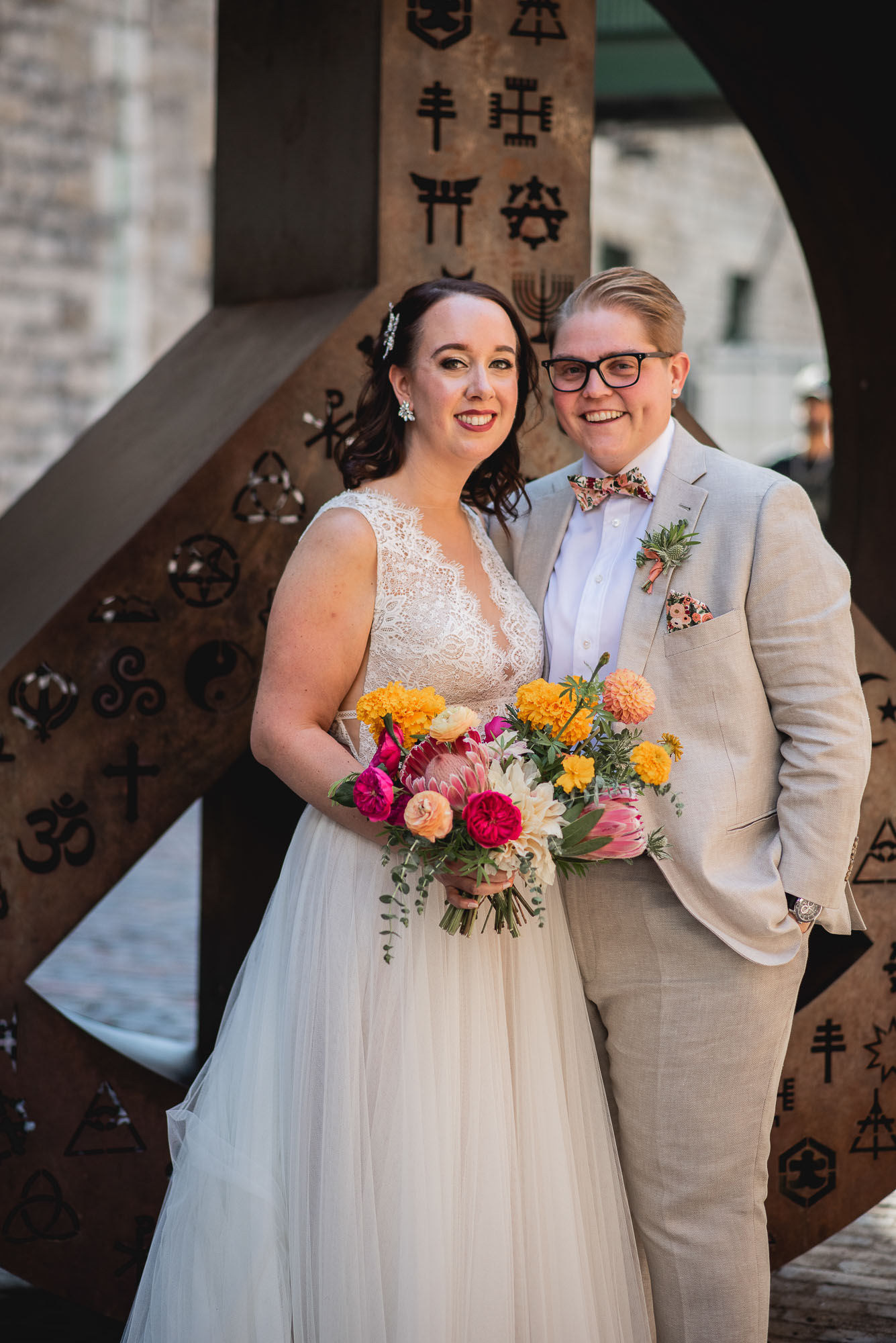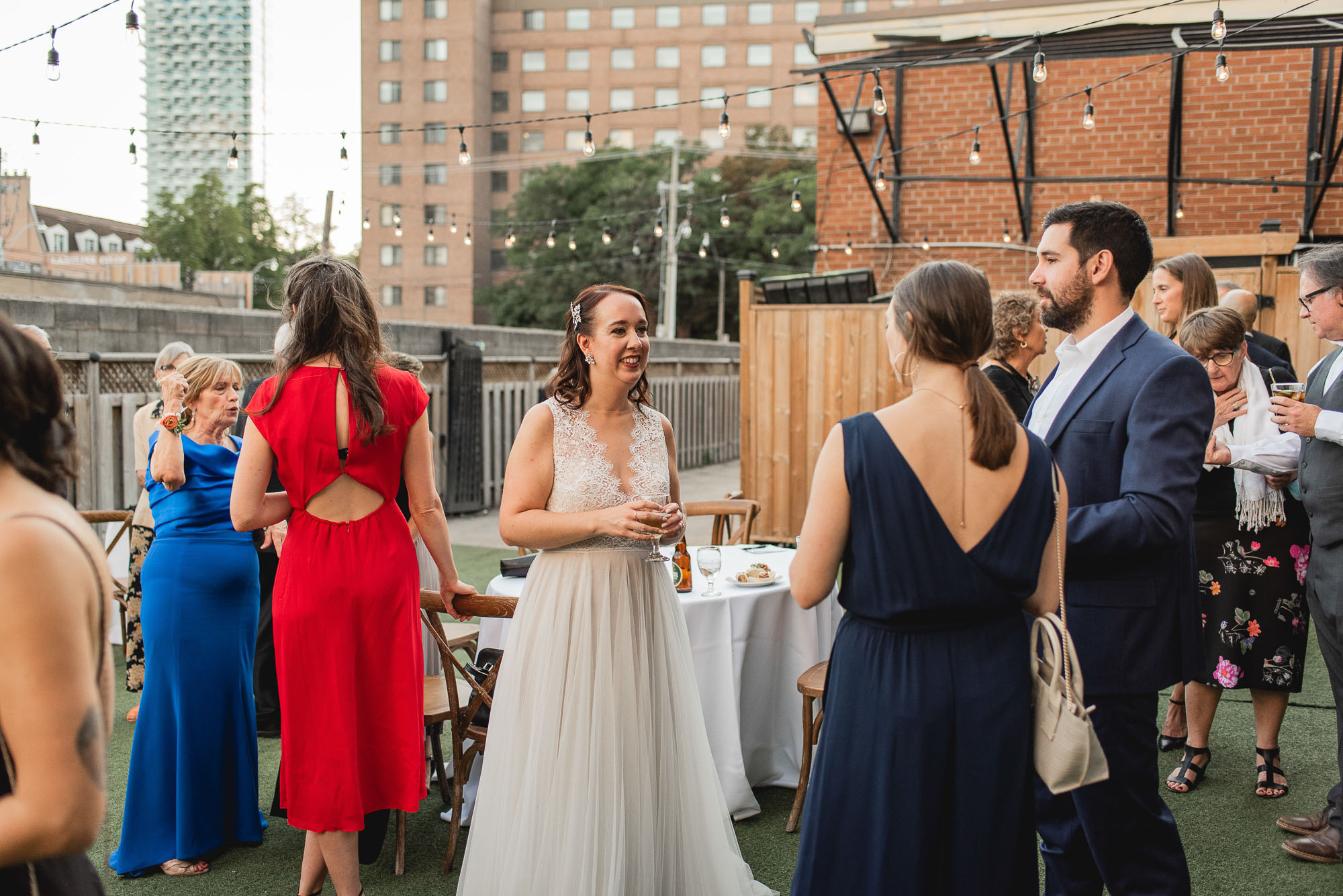 On their wedding day, we started the day with some candid getting-ready photos at their Toronto condo, followed by an emotional first look on the breezy rooftop. Sam didn’t hide her emotions seeing Laura in her wedding dress and I love the images that we captured. We then proceeded to the historic Distillery District for their bridal party portraits. It was a HOT September day so we stuck to the shade and had a great time! I love the goofy candids in particular!