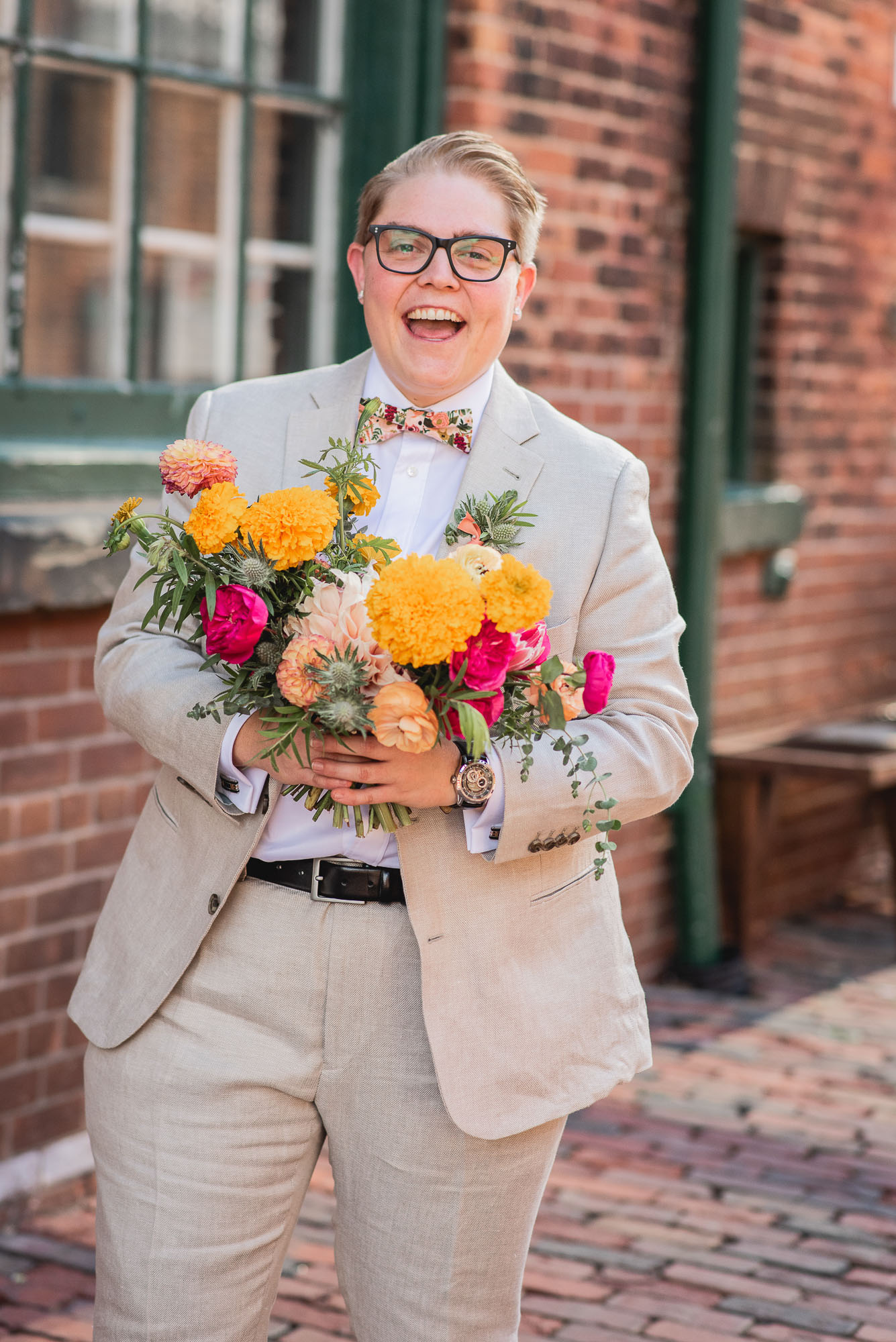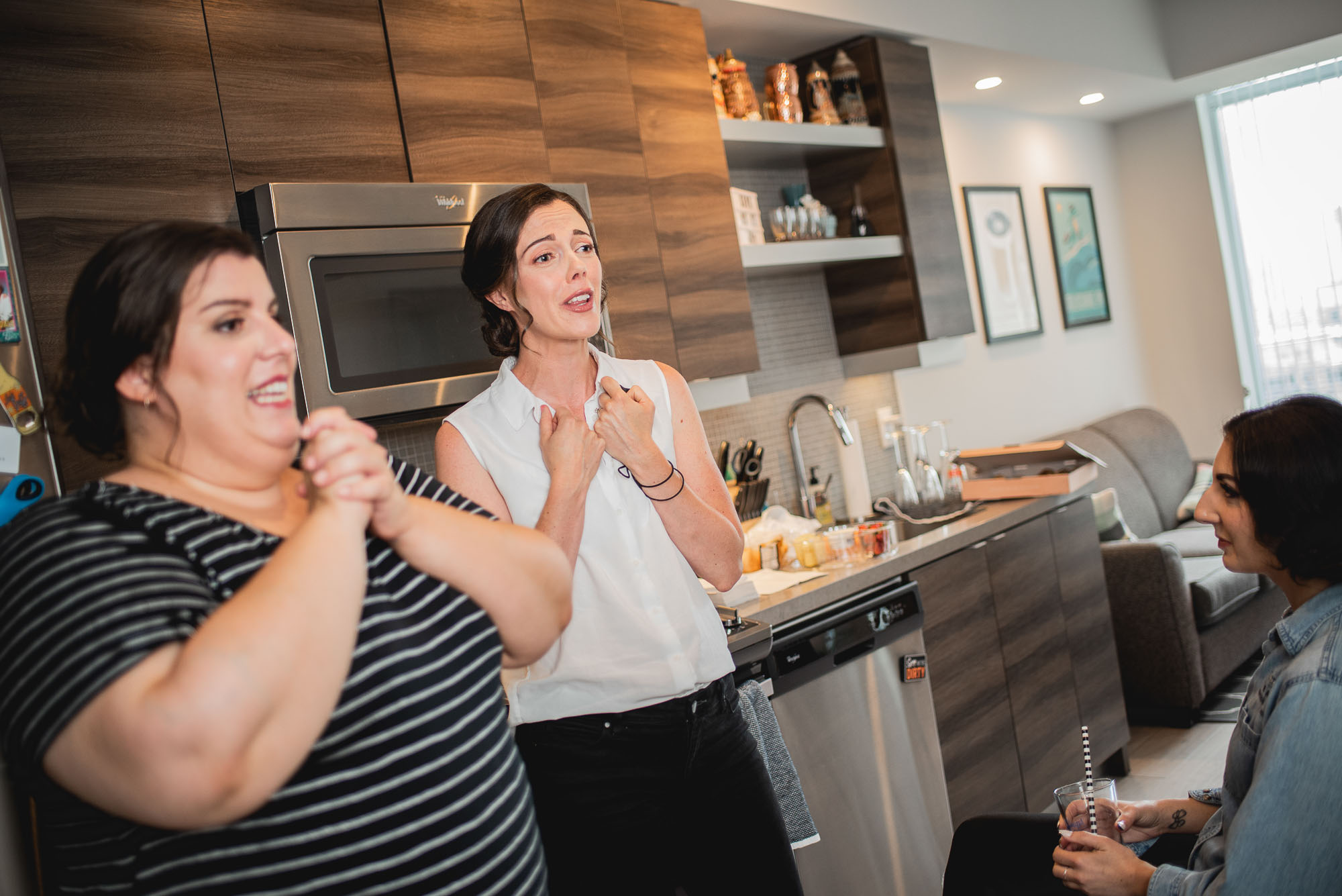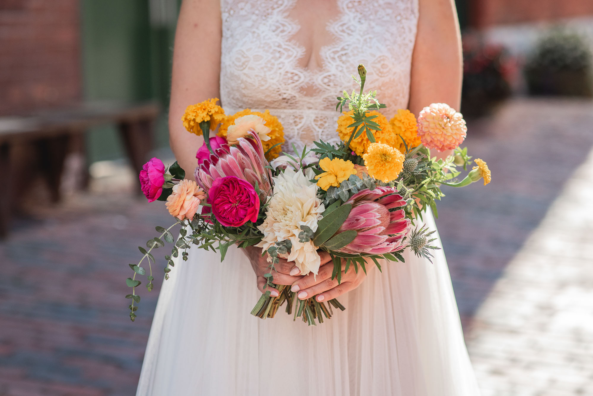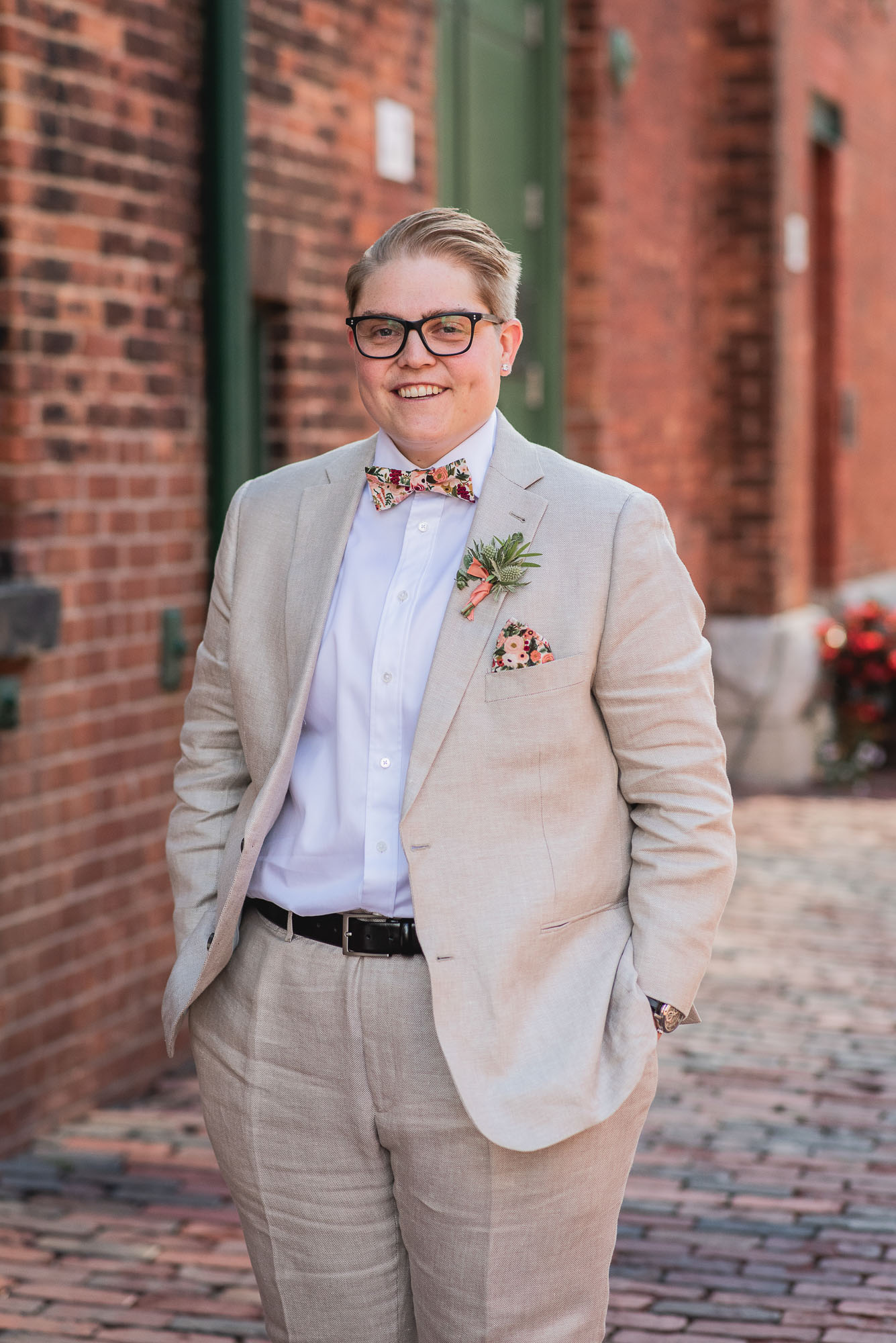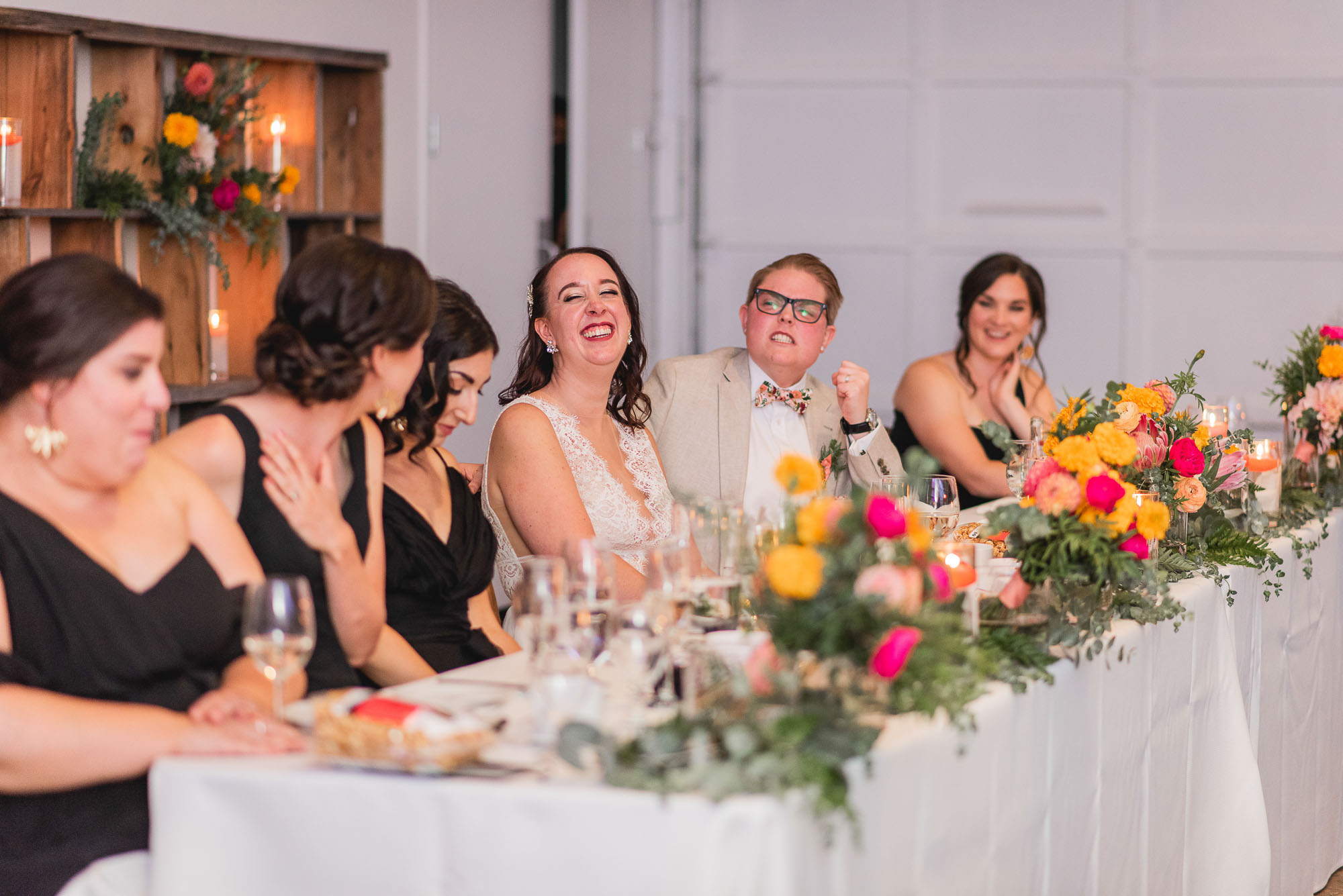 On their wedding day, we started the day with some candid getting-ready photos at their Toronto condo, followed by an emotional first look on the breezy rooftop. Sam didn’t hide her emotions seeing Laura in her wedding dress and I love the images that we captured. We then proceeded to the historic Distillery District for their bridal party portraits. It was a HOT September day so we stuck to the shade and had a great time! I love the goofy candids in particular!