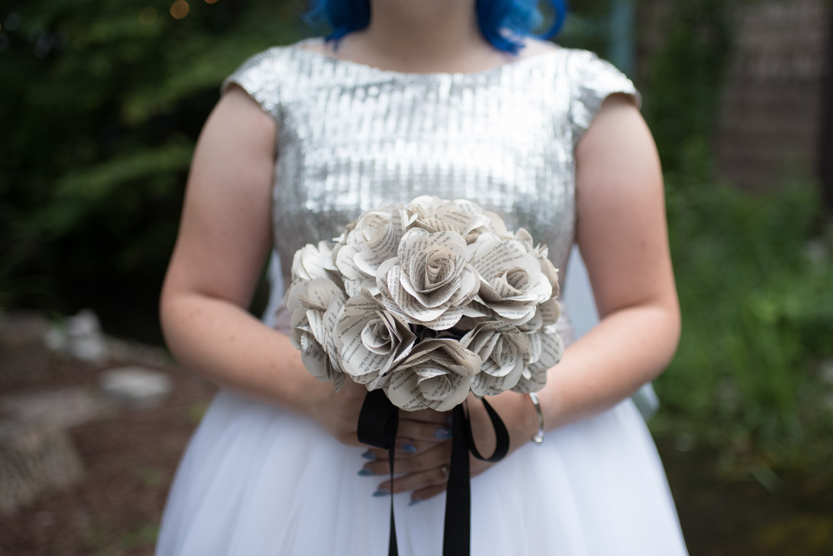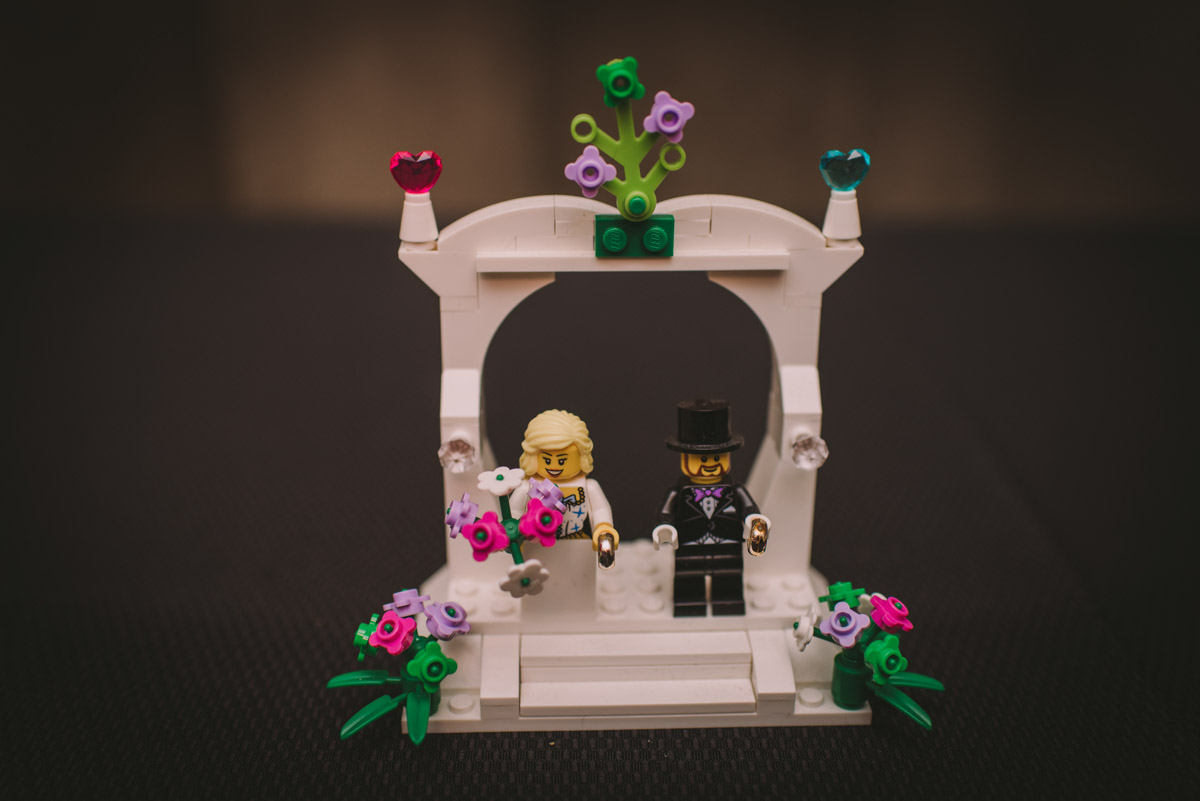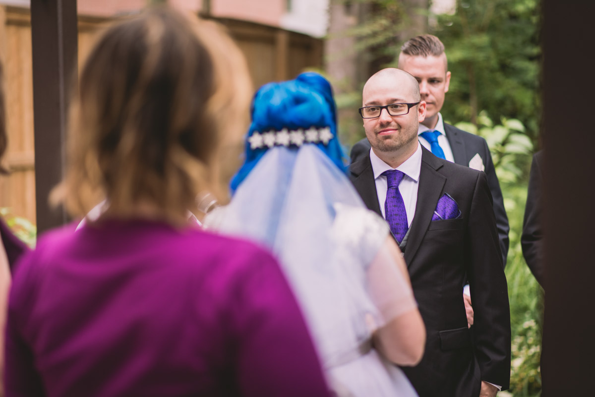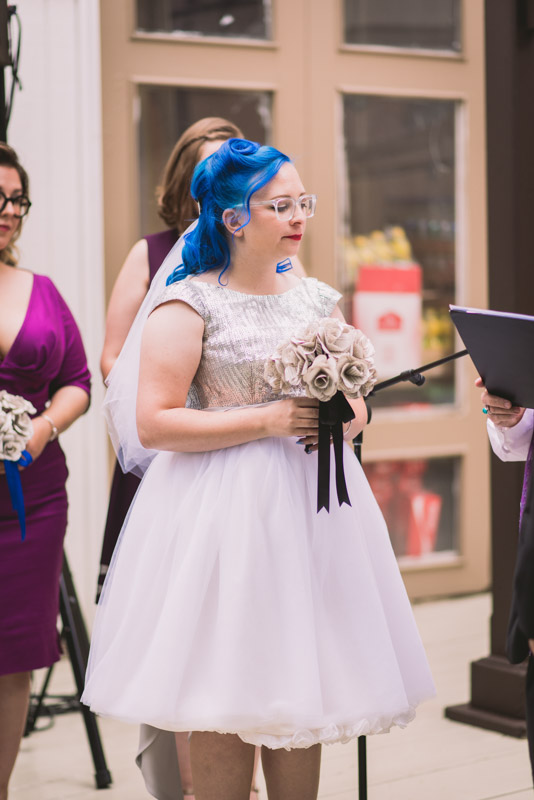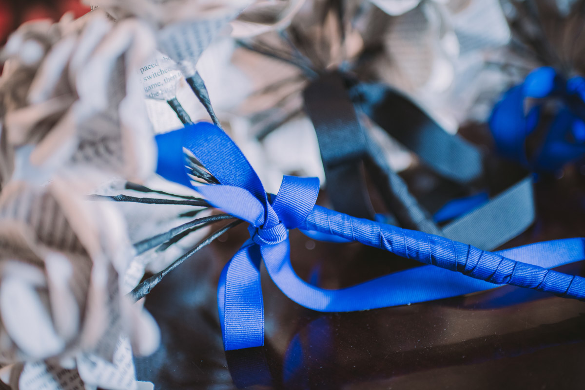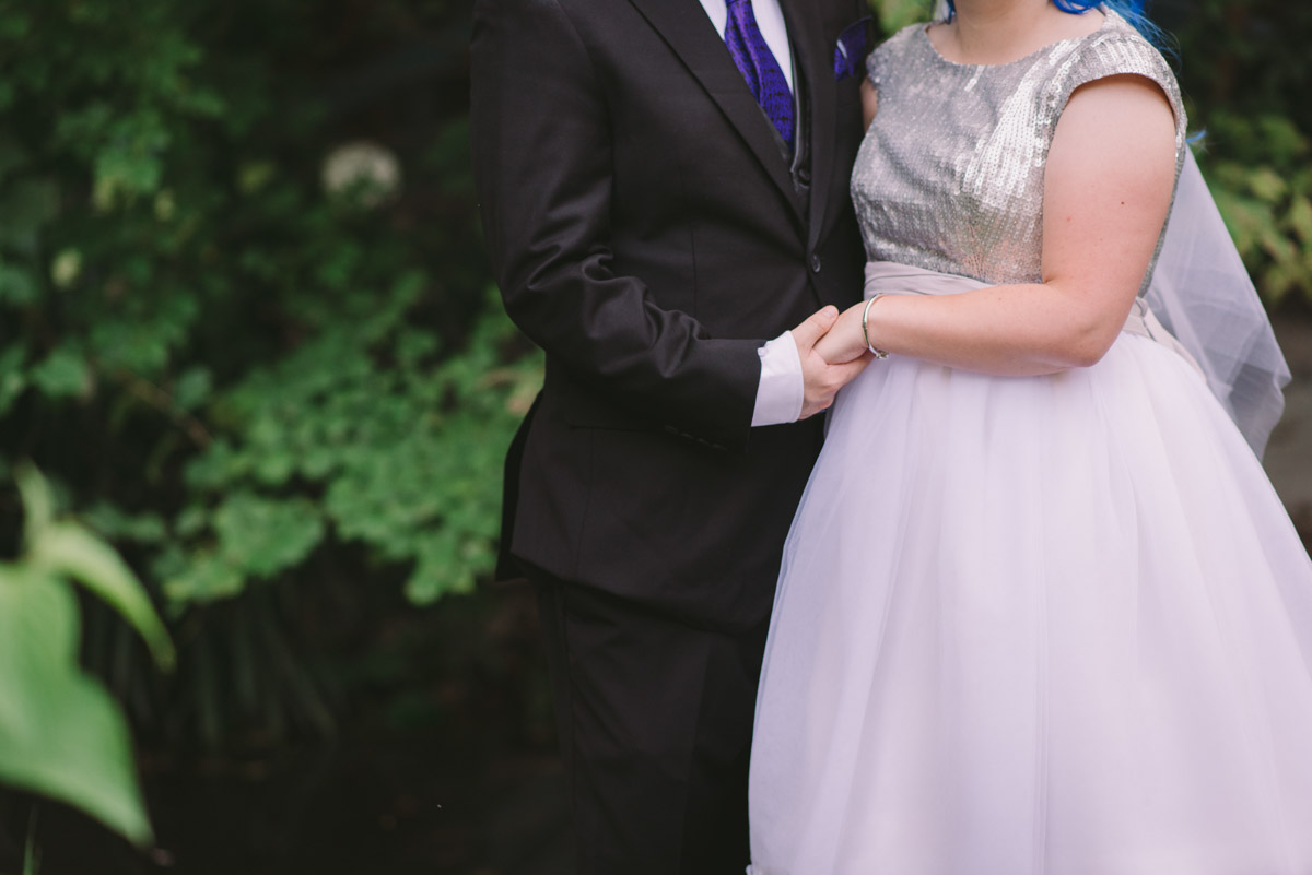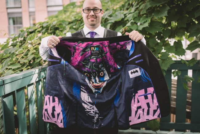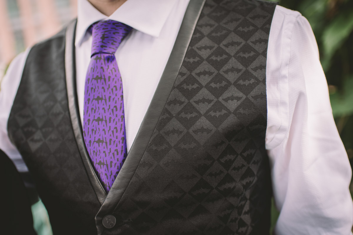 When I arrived on the day of the wedding, I took a look around the beautiful venue and sure enough, each table had a themed centrepiece featuring one of the aforementioned. SO MUCH FUN! Â Karyn’s vibrant blue hair was perfect with her beautiful sequined knee-length dress. Â Adrian’s suit, upon looking closely, was also themed! Take a look at the photos, below!