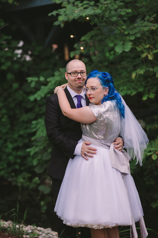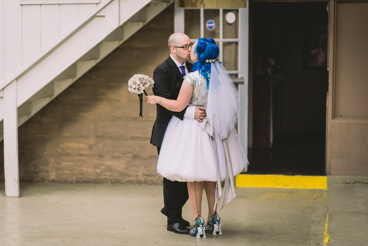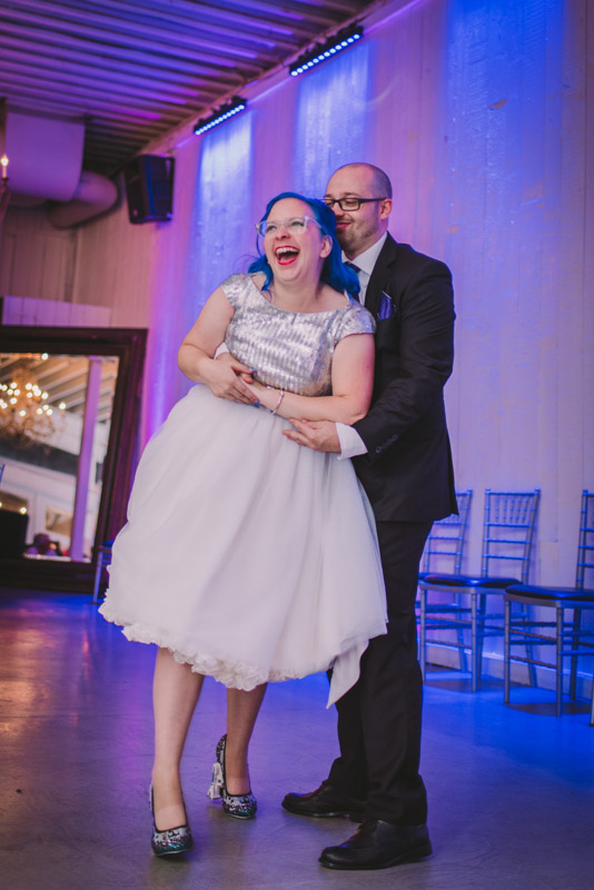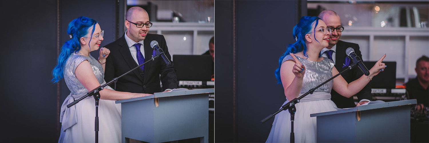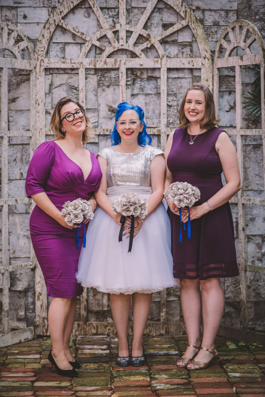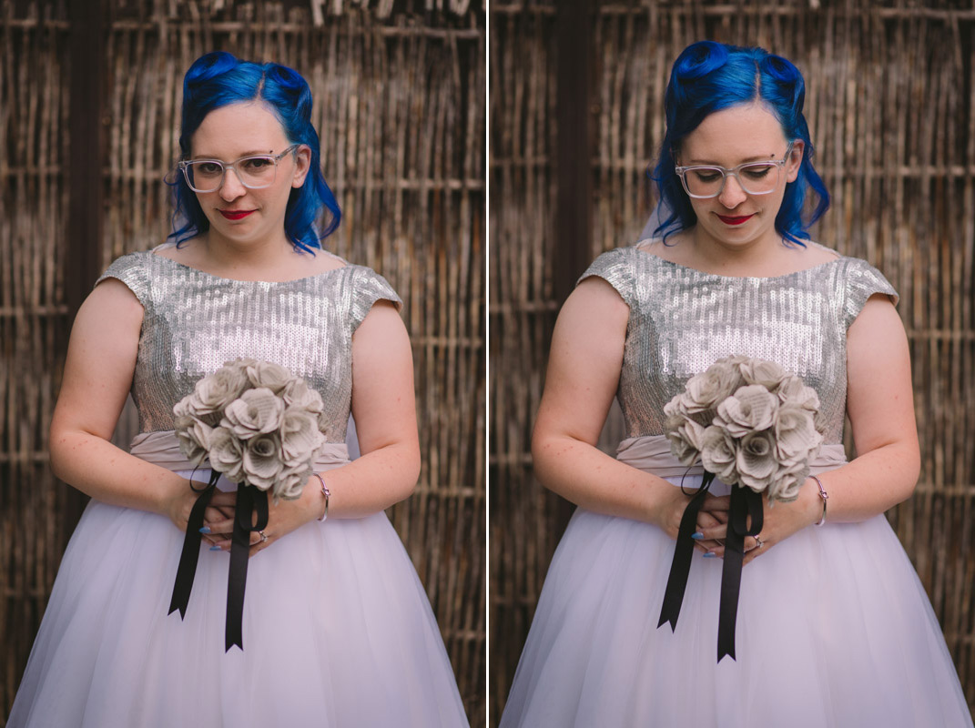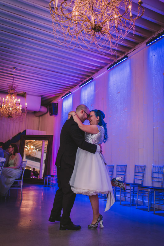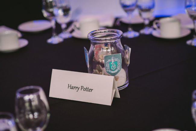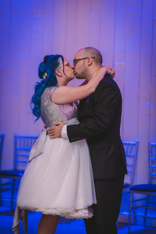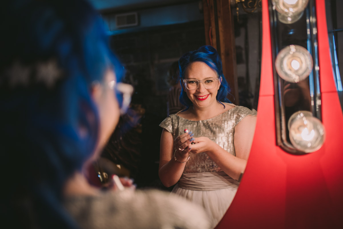 When I arrived on the day of the wedding, I took a look around the beautiful venue and sure enough, each table had a themed centrepiece featuring one of the aforementioned. SO MUCH FUN! Â Karyn’s vibrant blue hair was perfect with her beautiful sequined knee-length dress. Â Adrian’s suit, upon looking closely, was also themed! Take a look at the photos, below!