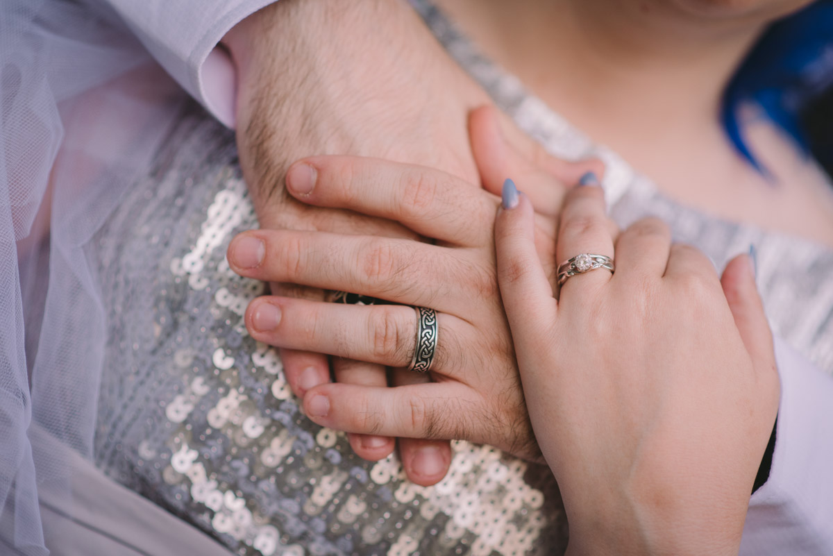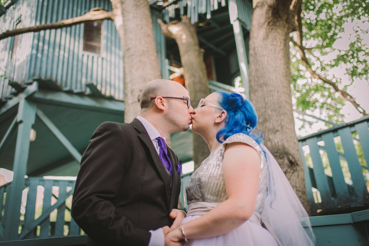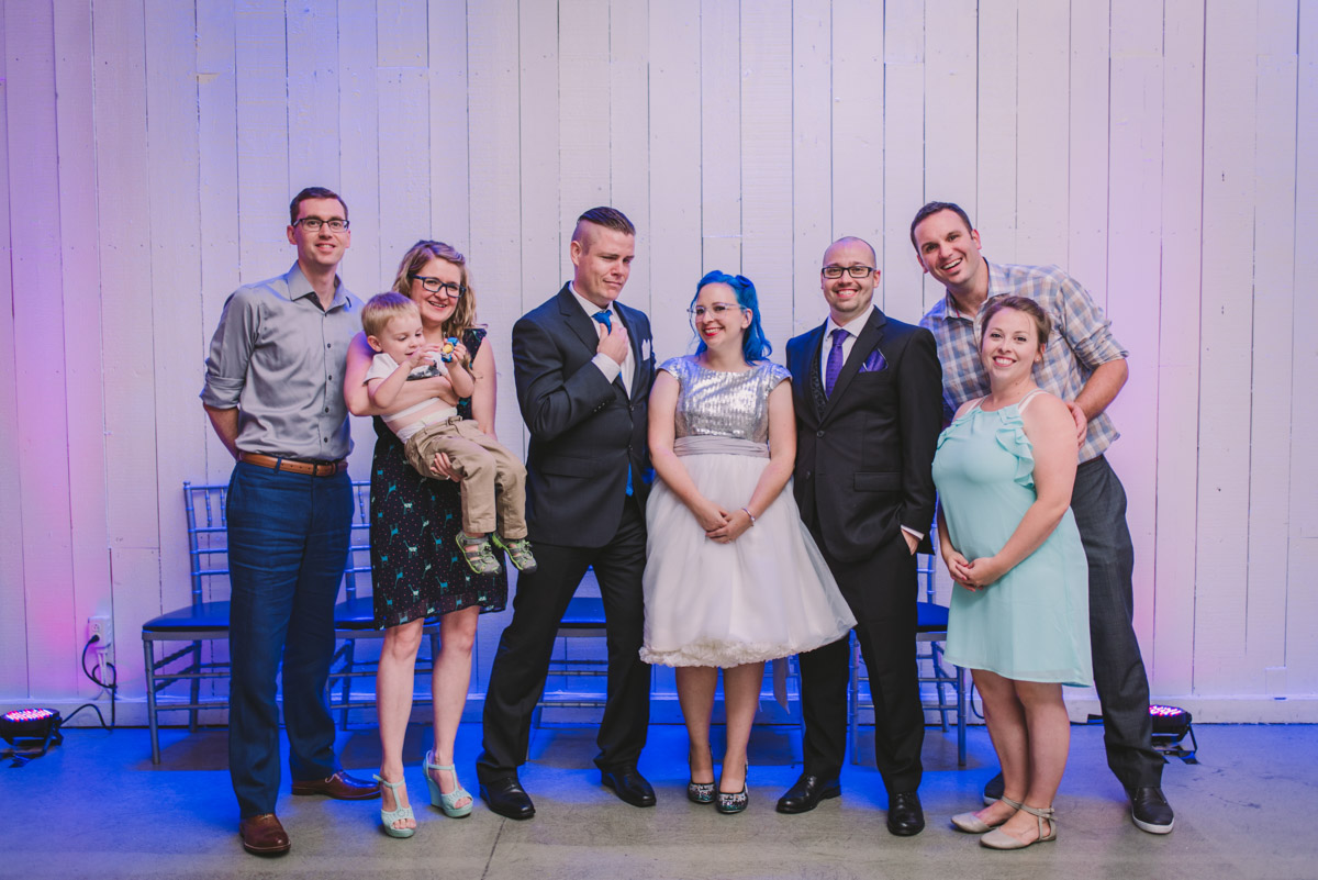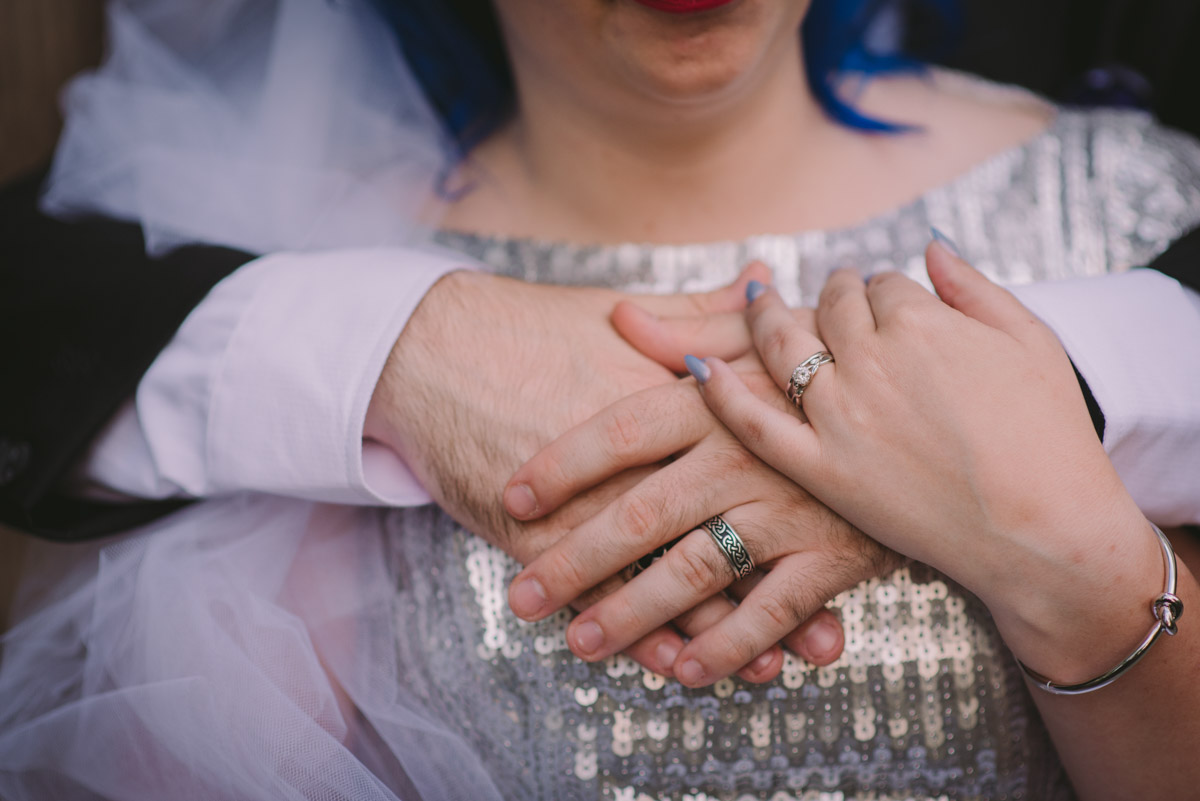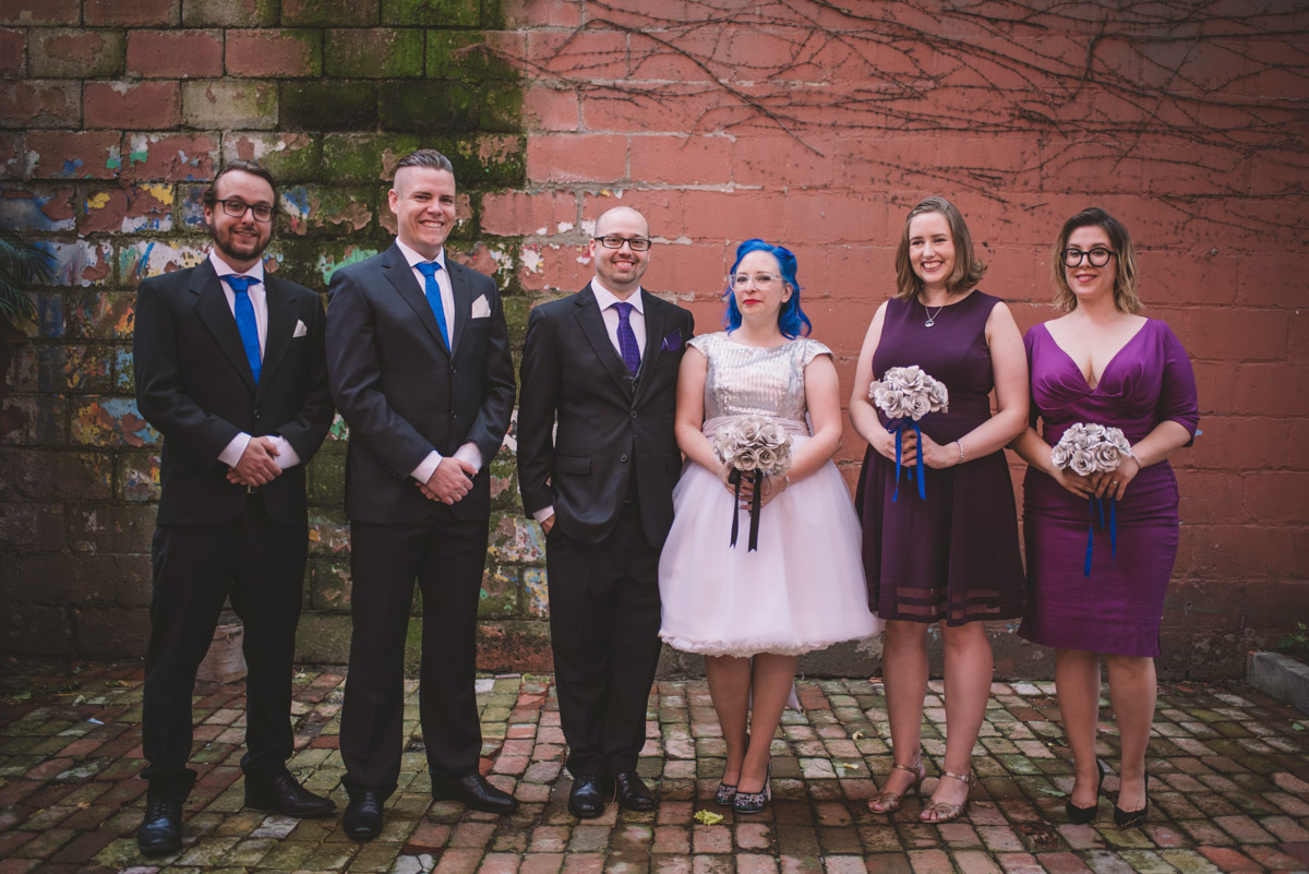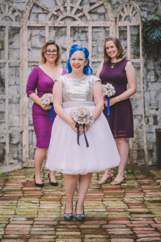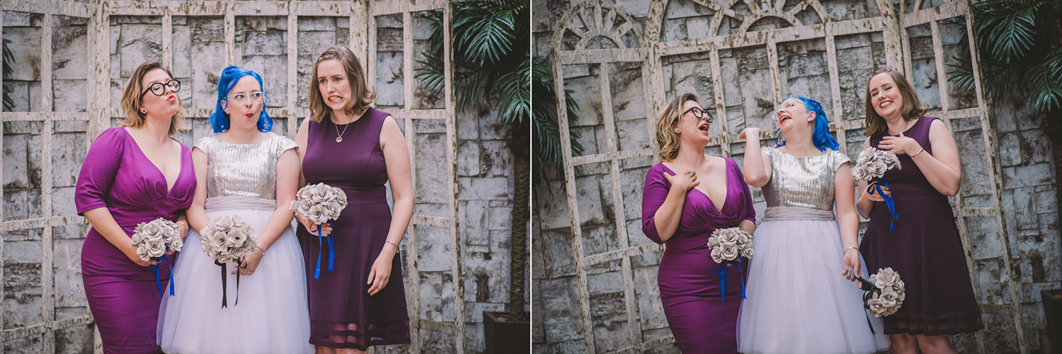 When I arrived on the day of the wedding, I took a look around the beautiful venue and sure enough, each table had a themed centrepiece featuring one of the aforementioned. SO MUCH FUN! Â Karyn’s vibrant blue hair was perfect with her beautiful sequined knee-length dress. Â Adrian’s suit, upon looking closely, was also themed! Take a look at the photos, below!