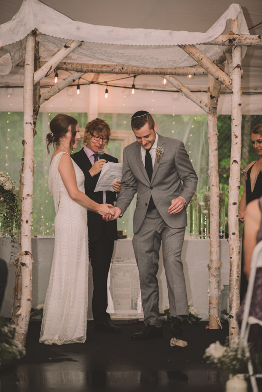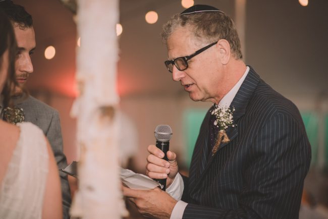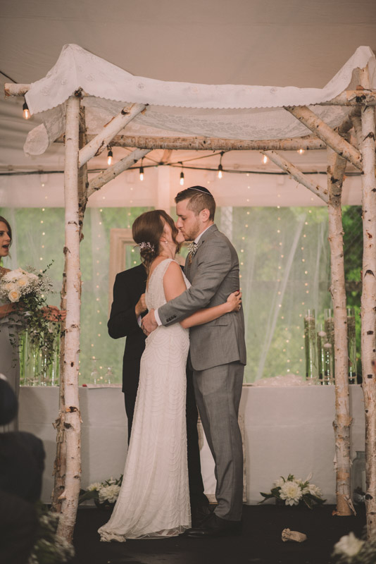 As we wrapped our first look photos the rain began to fall again, and heavily, so the ceremony was moved to the reception tent. It was quite romantic with the string lights and rain pitter-pattering above us! As their emotional ceremony wrapped up, so did the rain, and we were able to capture some beautiful family photos and bridal party photos.