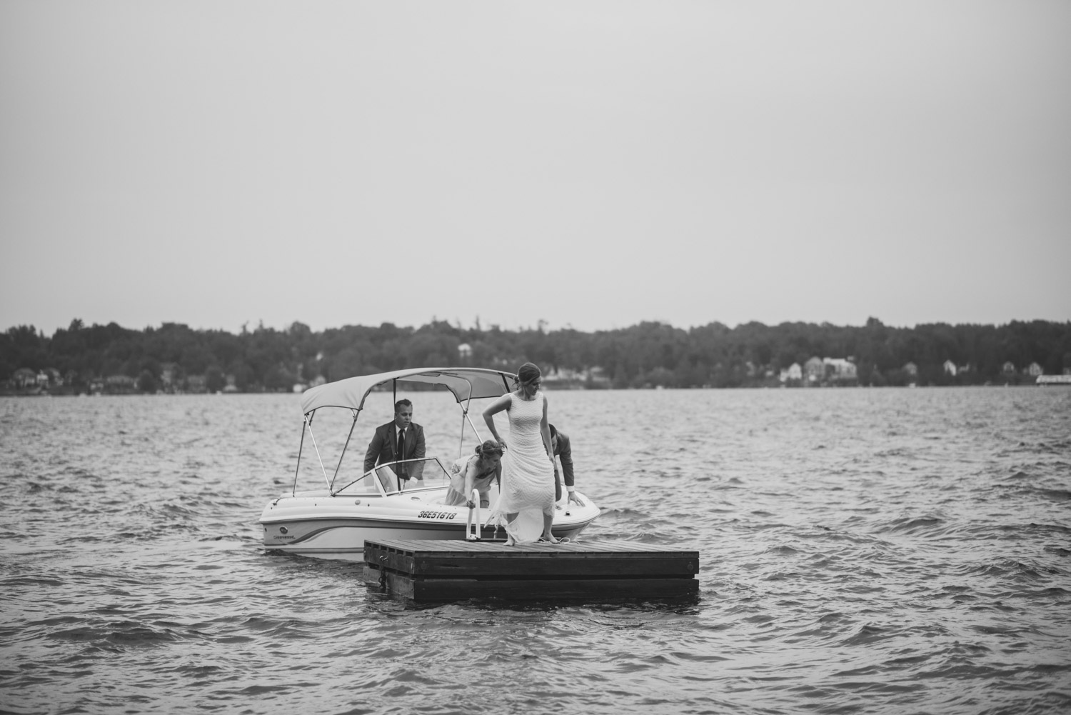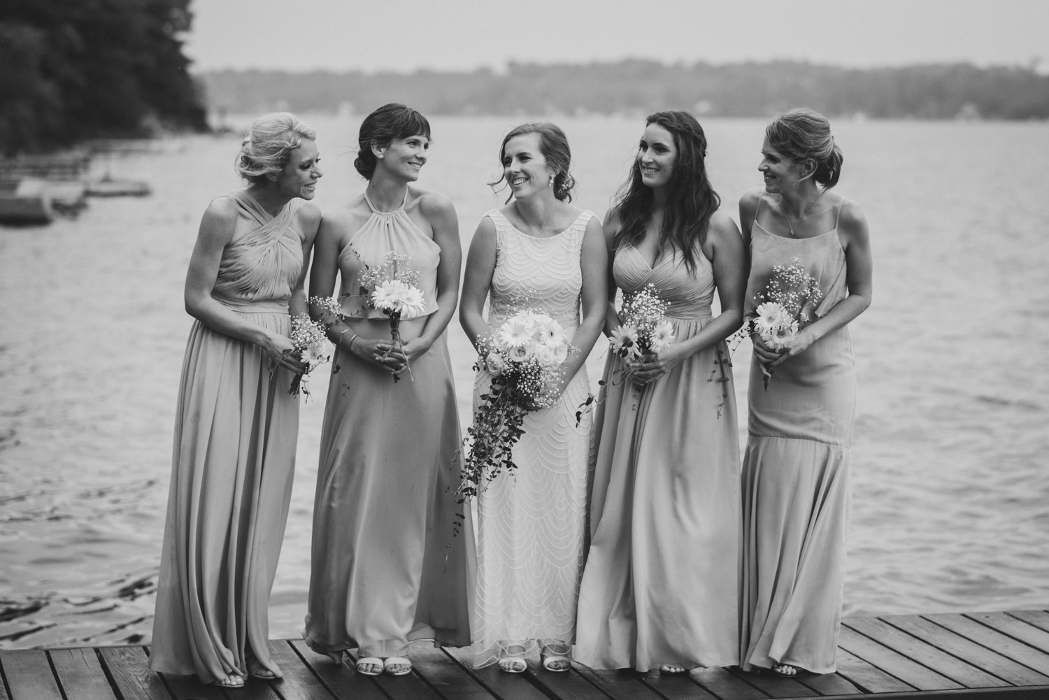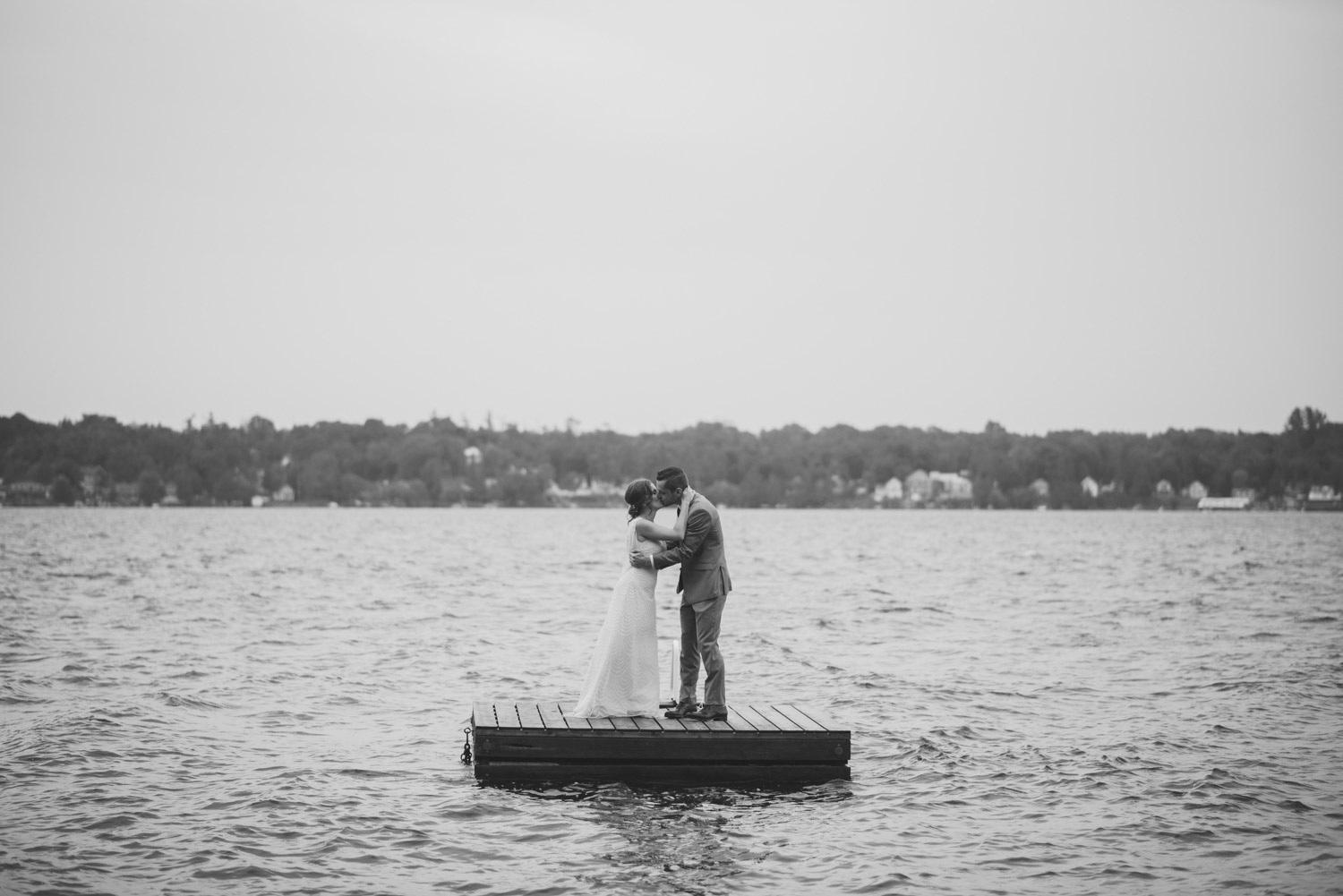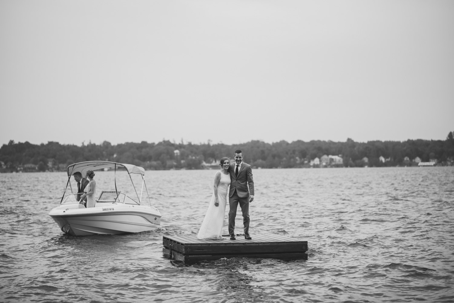When I arrived, I immediately took care of the detail photos in their enormous tent, as well as their preparation photos. The skies cleared just long enough for us to have a wonderful first look – I absolutely love seeing couples see each other for the first time on their wedding day! It always puts such a big smile on my face (and sometimes a few tears too!). We weren’t sure when the rain would start again, so this was a great opportunity to take care of some of Meredith and Dave’s photos together. They insisted on being boat-ed out to a floating dock in the lake – despite the incredibly choppy water – for some of the photos. I LOVED their adventurous spirit and we all had a good laugh at the balancing skills required to stay dry on that dock!