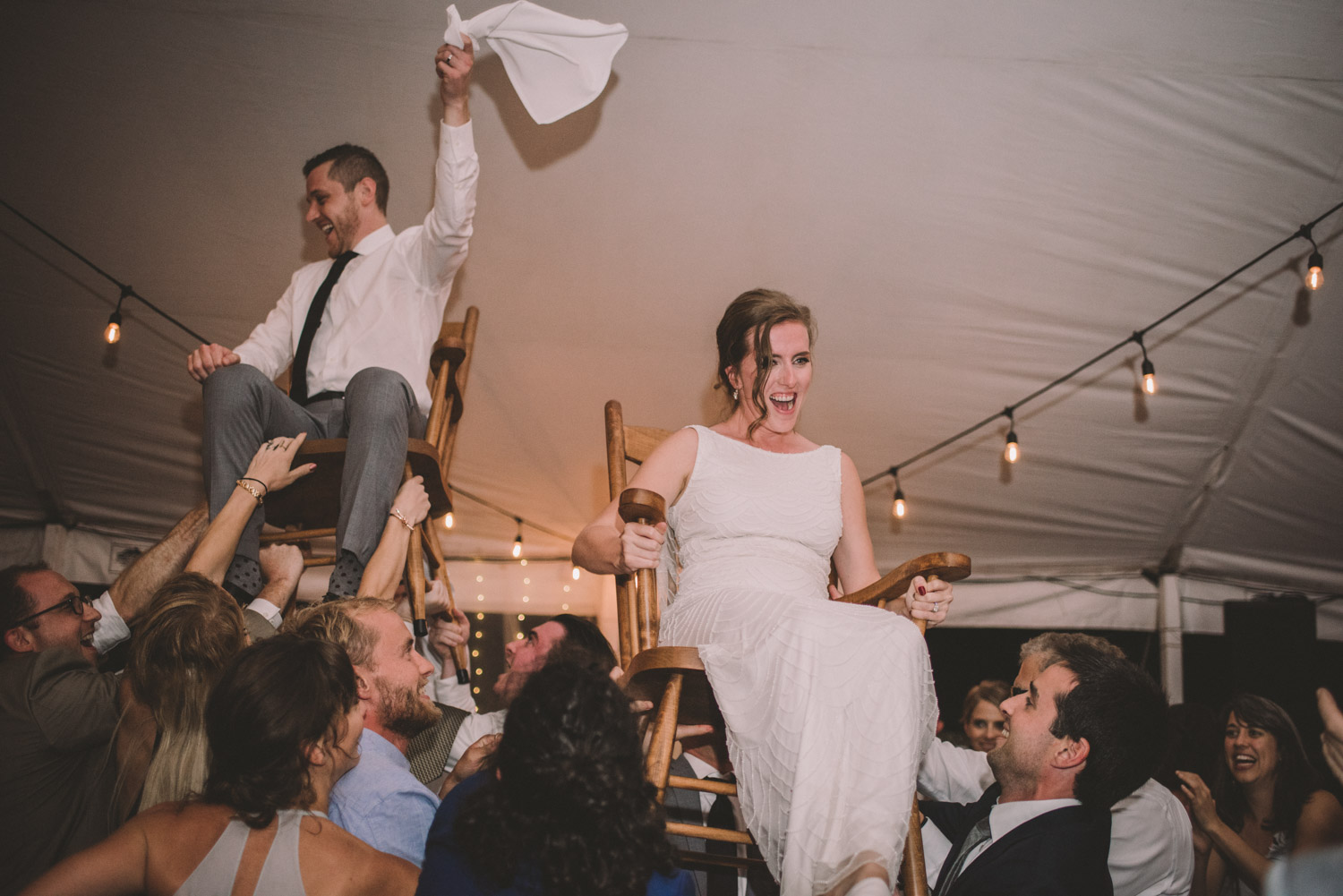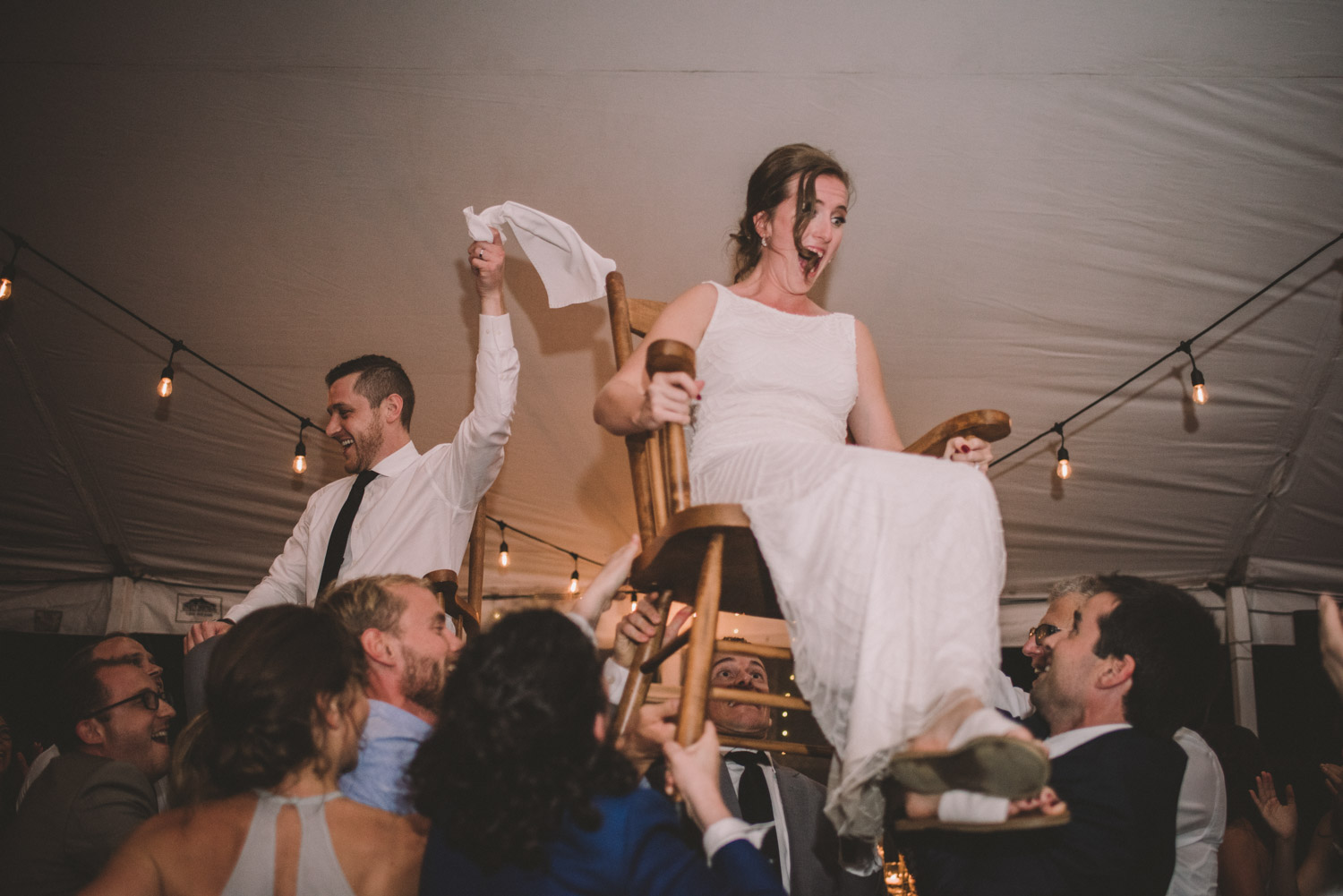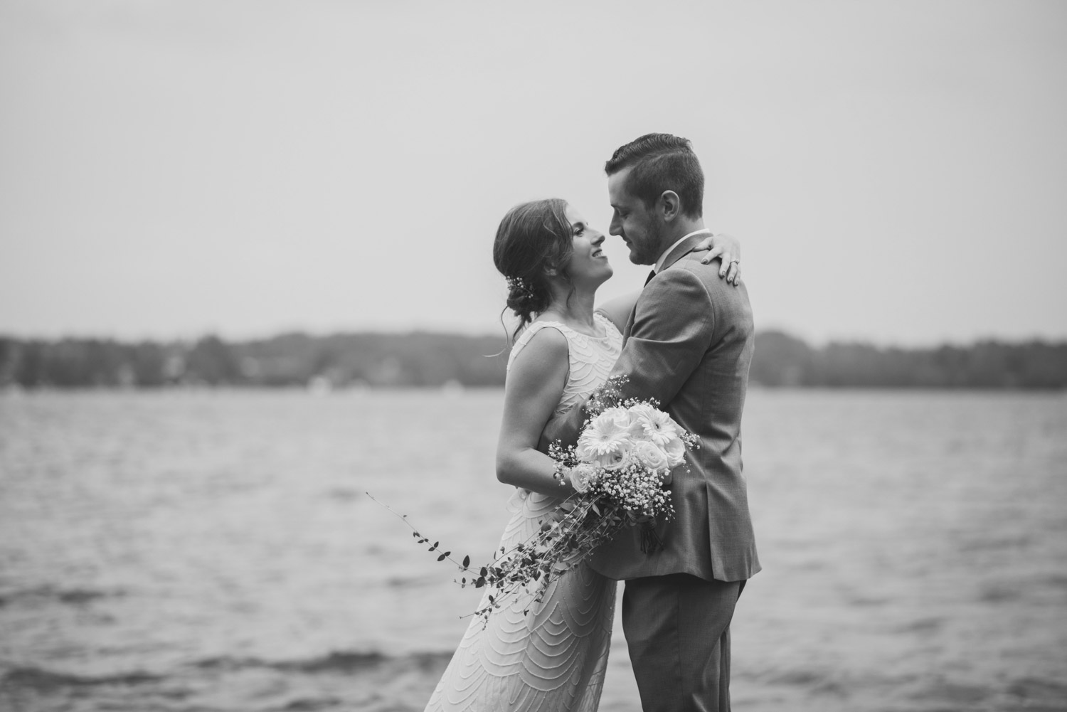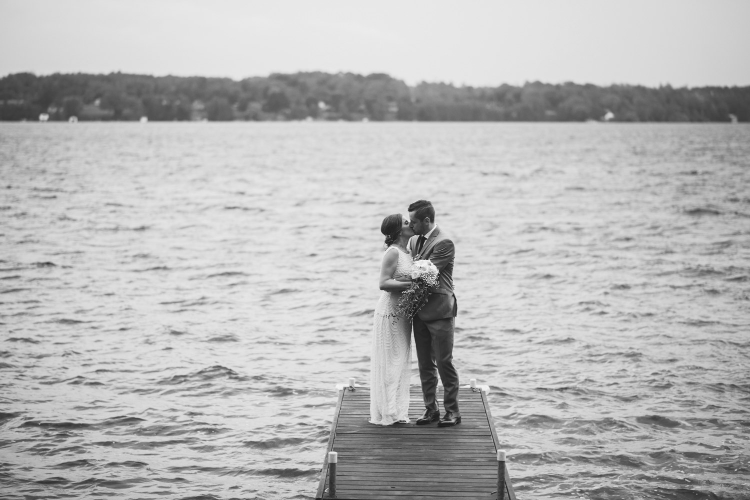 When I arrived, I immediately took care of the detail photos in their enormous tent, as well as their preparation photos. The skies cleared just long enough for us to have a wonderful first look – I absolutely love seeing couples see each other for the first time on their wedding day! It always puts such a big smile on my face (and sometimes a few tears too!). We weren’t sure when the rain would start again, so this was a great opportunity to take care of some of Meredith and Dave’s photos together. They insisted on being boat-ed out to a floating dock in the lake – despite the incredibly choppy water – for some of the photos. I LOVED their adventurous spirit and we all had a good laugh at the balancing skills required to stay dry on that dock!