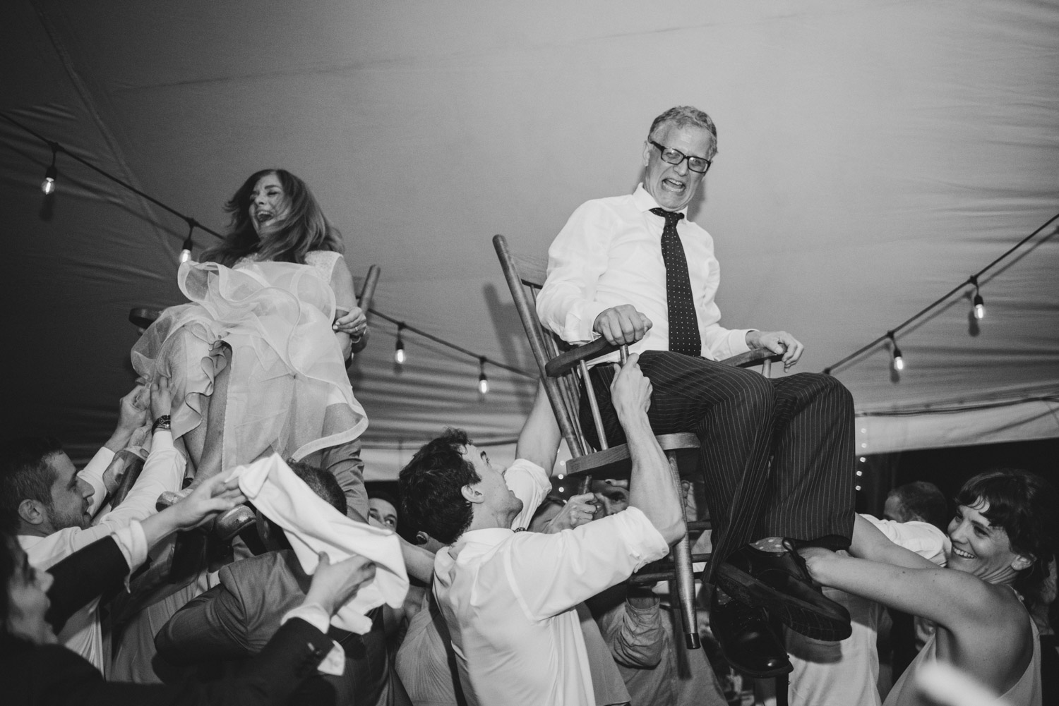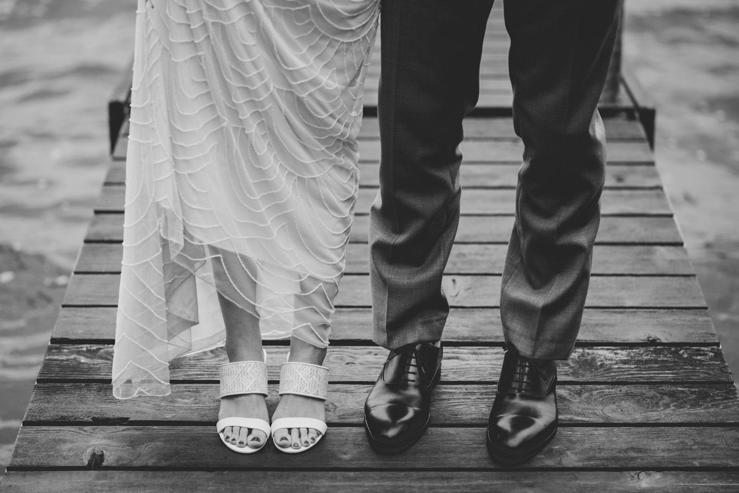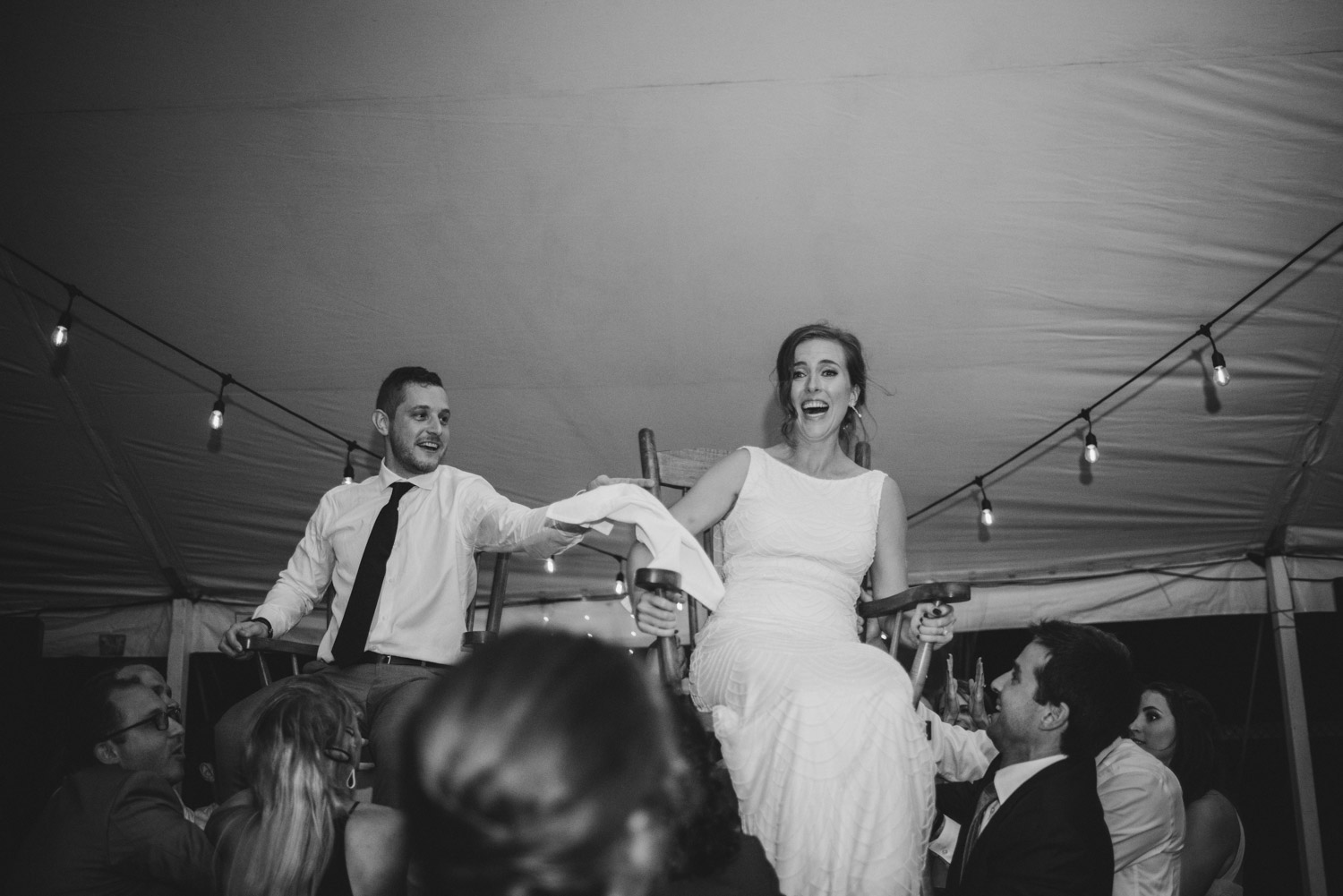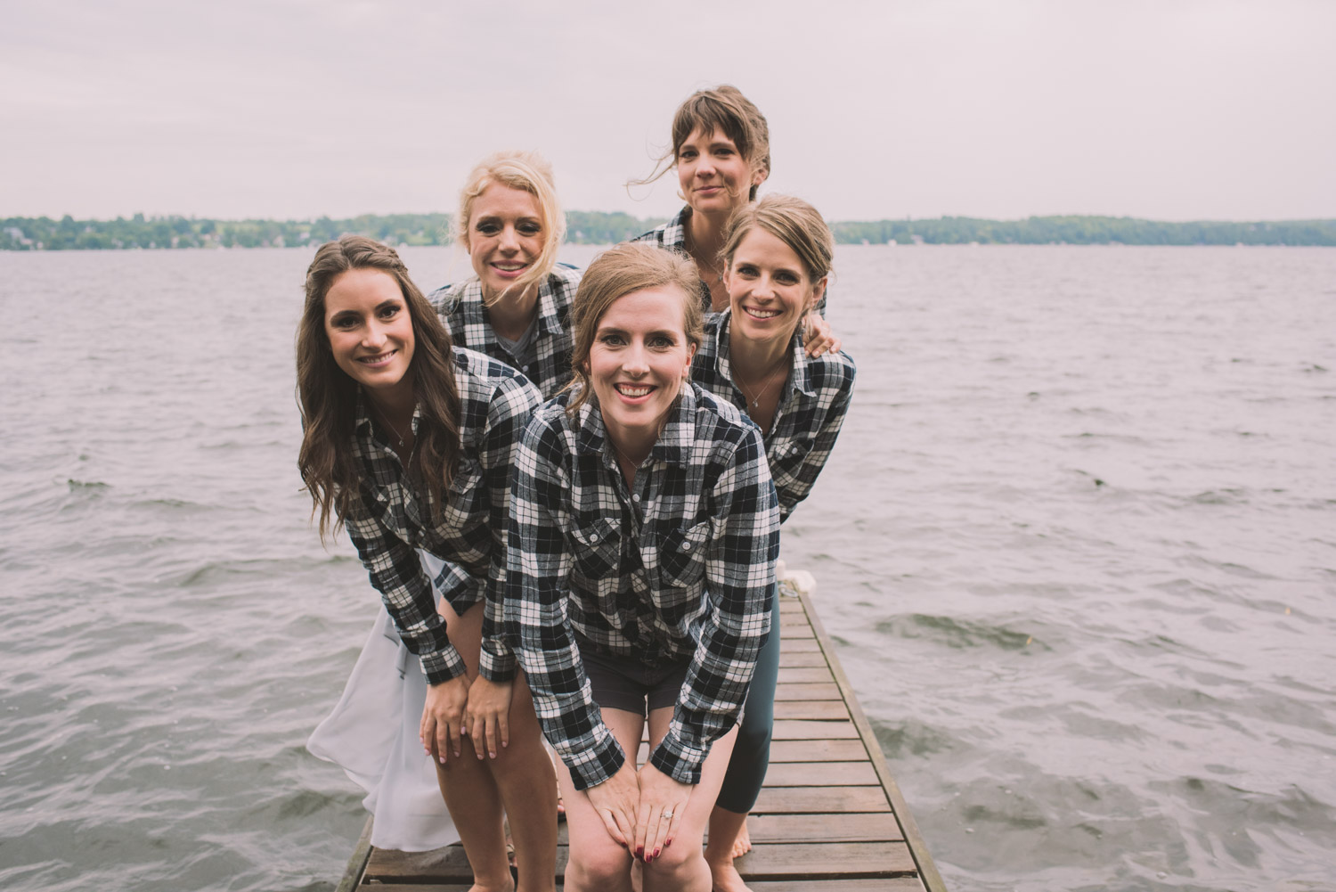 When I arrived, I immediately took care of the detail photos in their enormous tent, as well as their preparation photos. The skies cleared just long enough for us to have a wonderful first look – I absolutely love seeing couples see each other for the first time on their wedding day! It always puts such a big smile on my face (and sometimes a few tears too!). We weren’t sure when the rain would start again, so this was a great opportunity to take care of some of Meredith and Dave’s photos together. They insisted on being boat-ed out to a floating dock in the lake – despite the incredibly choppy water – for some of the photos. I LOVED their adventurous spirit and we all had a good laugh at the balancing skills required to stay dry on that dock!