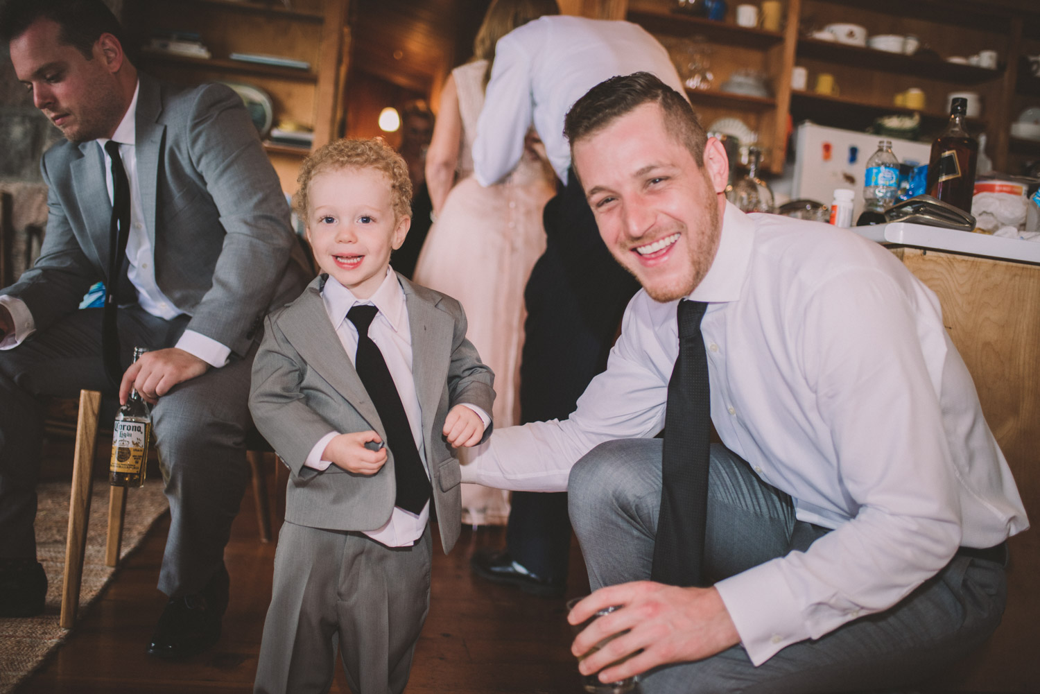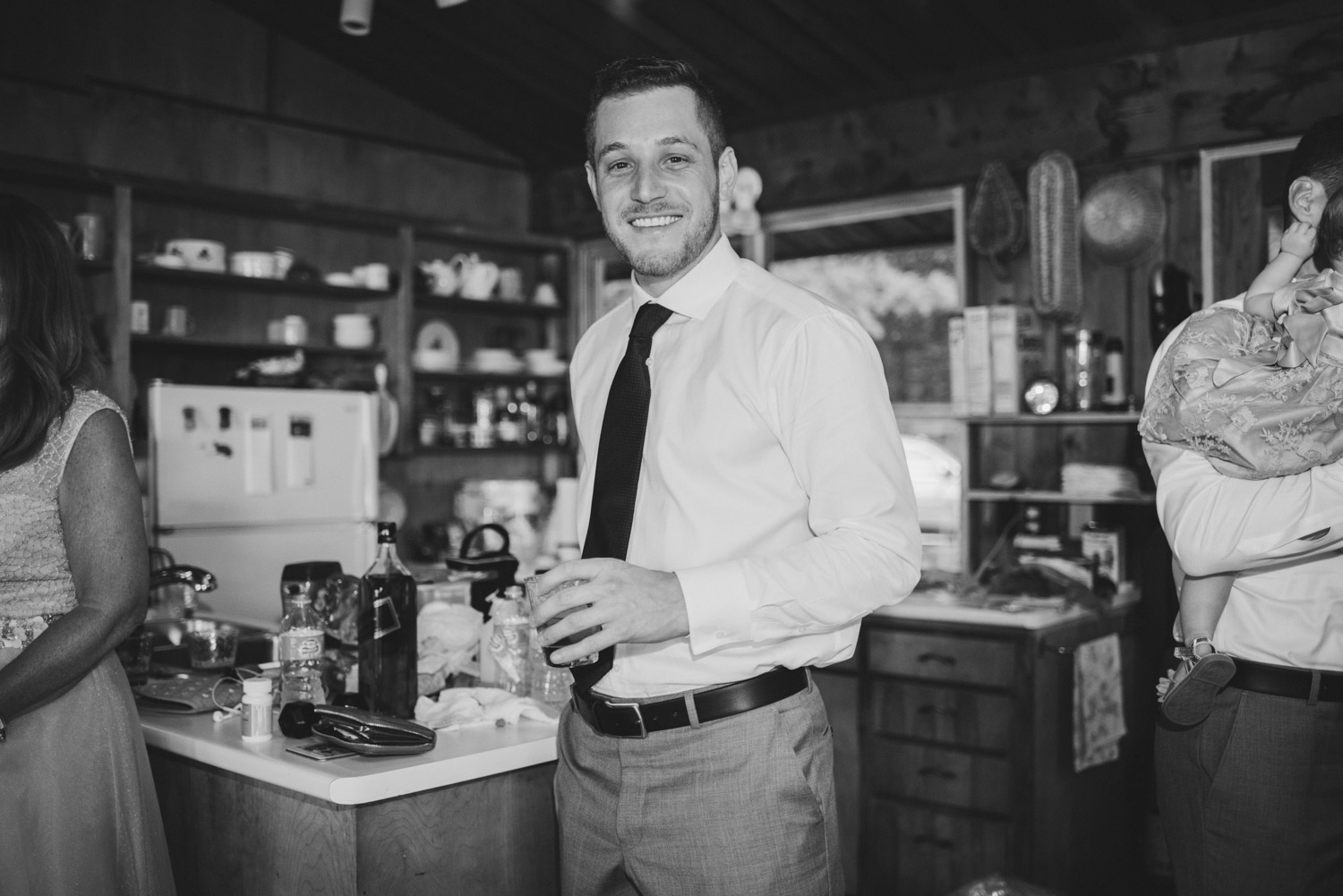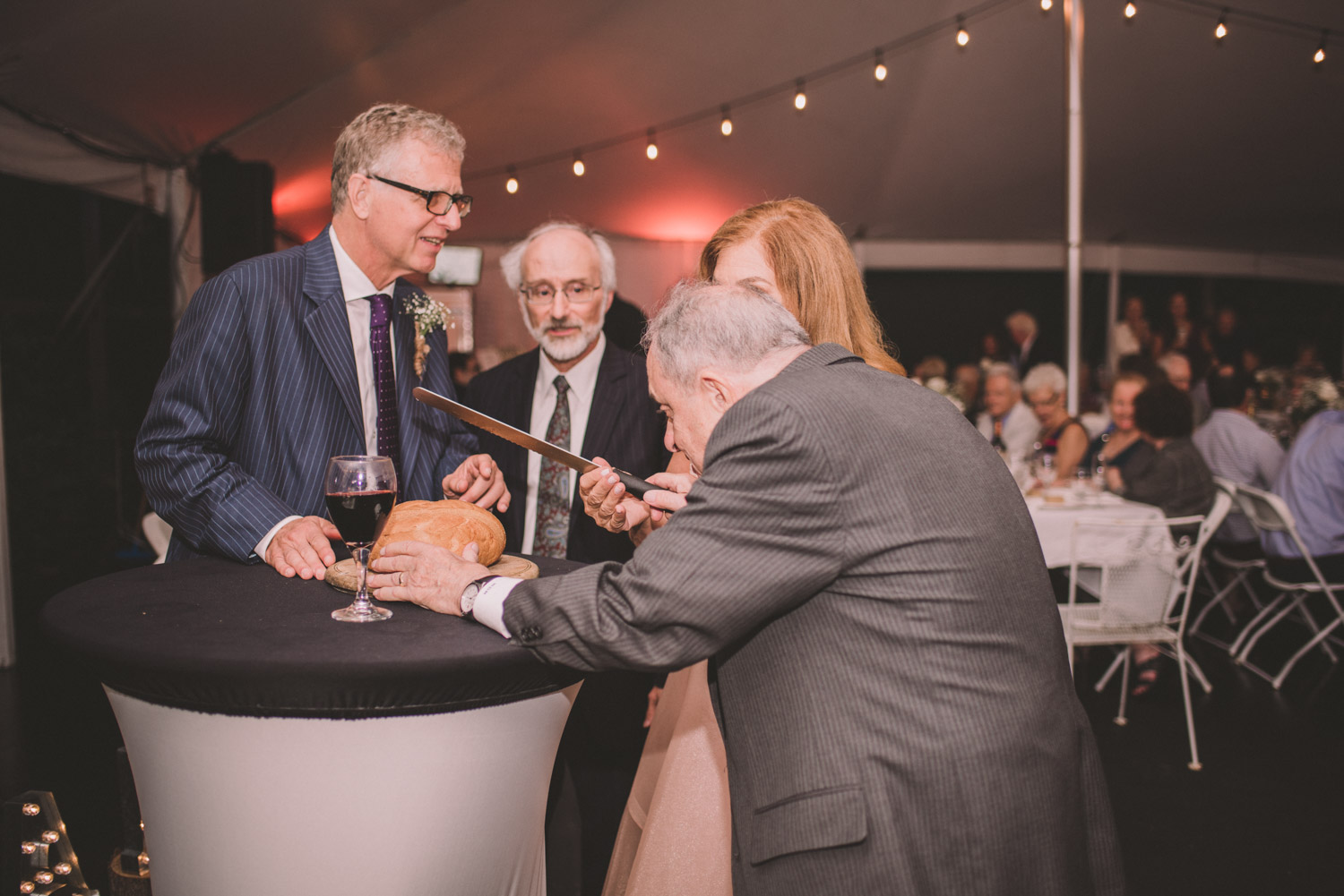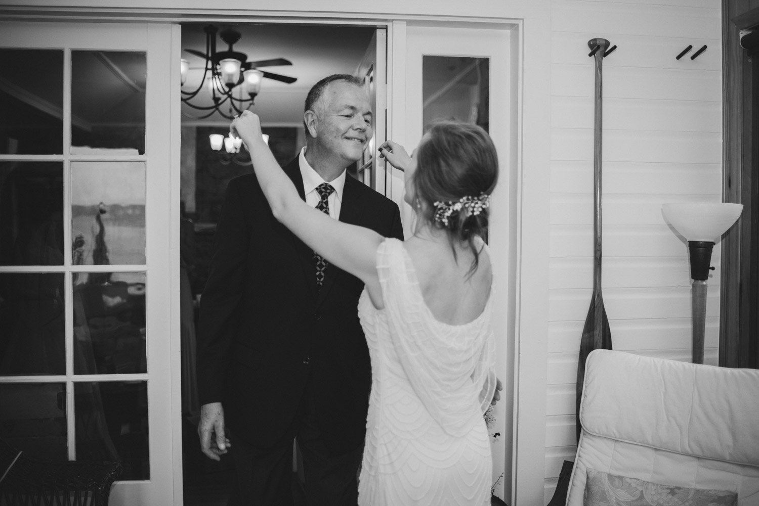 When I arrived, I immediately took care of the detail photos in their enormous tent, as well as their preparation photos. The skies cleared just long enough for us to have a wonderful first look – I absolutely love seeing couples see each other for the first time on their wedding day! It always puts such a big smile on my face (and sometimes a few tears too!). We weren’t sure when the rain would start again, so this was a great opportunity to take care of some of Meredith and Dave’s photos together. They insisted on being boat-ed out to a floating dock in the lake – despite the incredibly choppy water – for some of the photos. I LOVED their adventurous spirit and we all had a good laugh at the balancing skills required to stay dry on that dock!