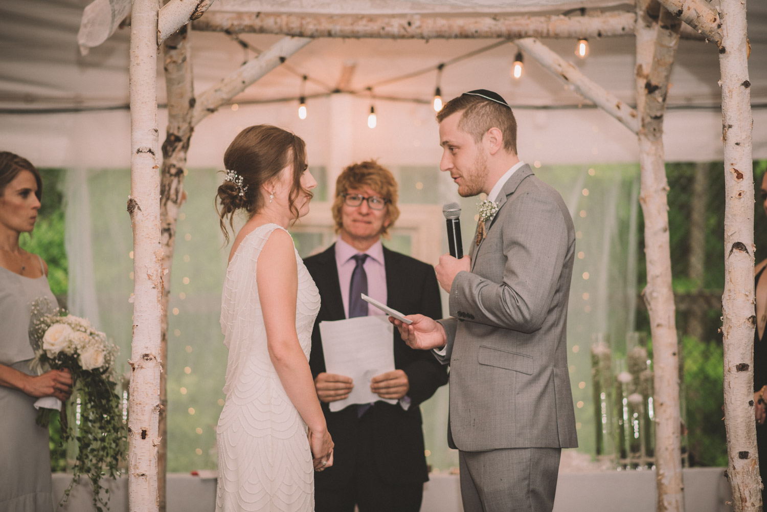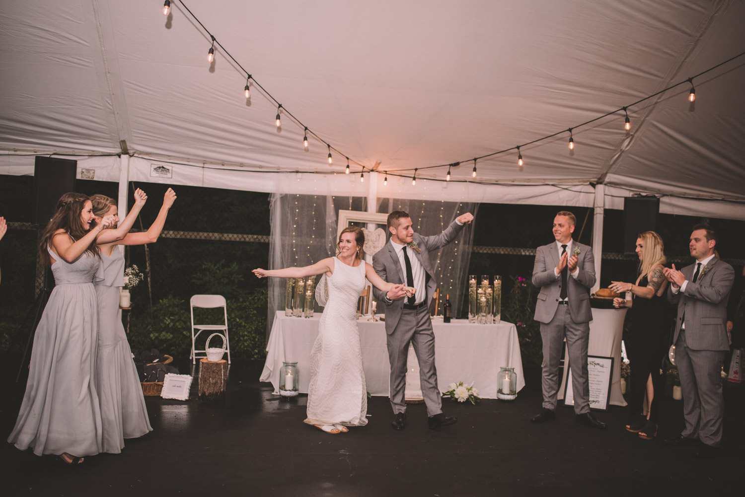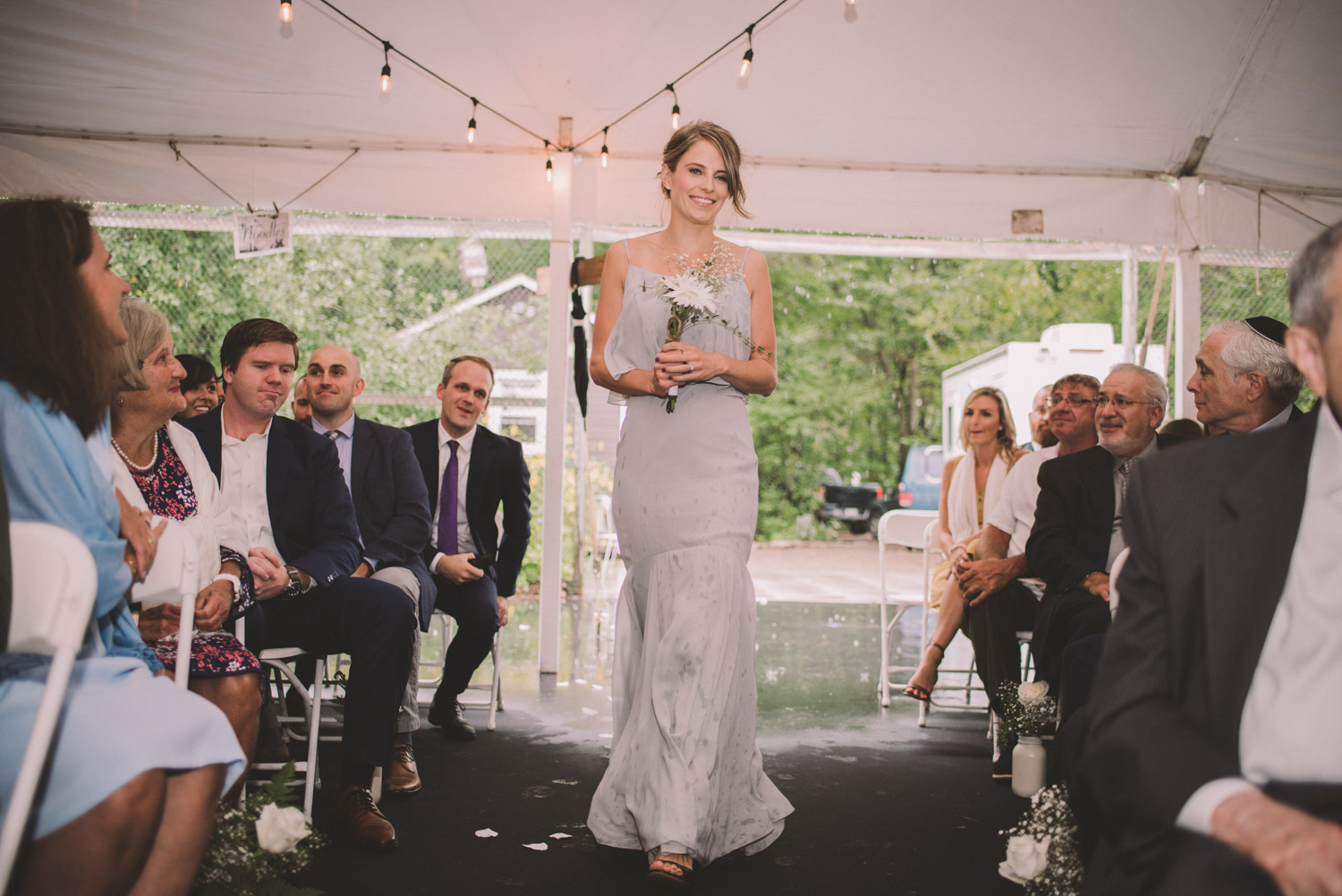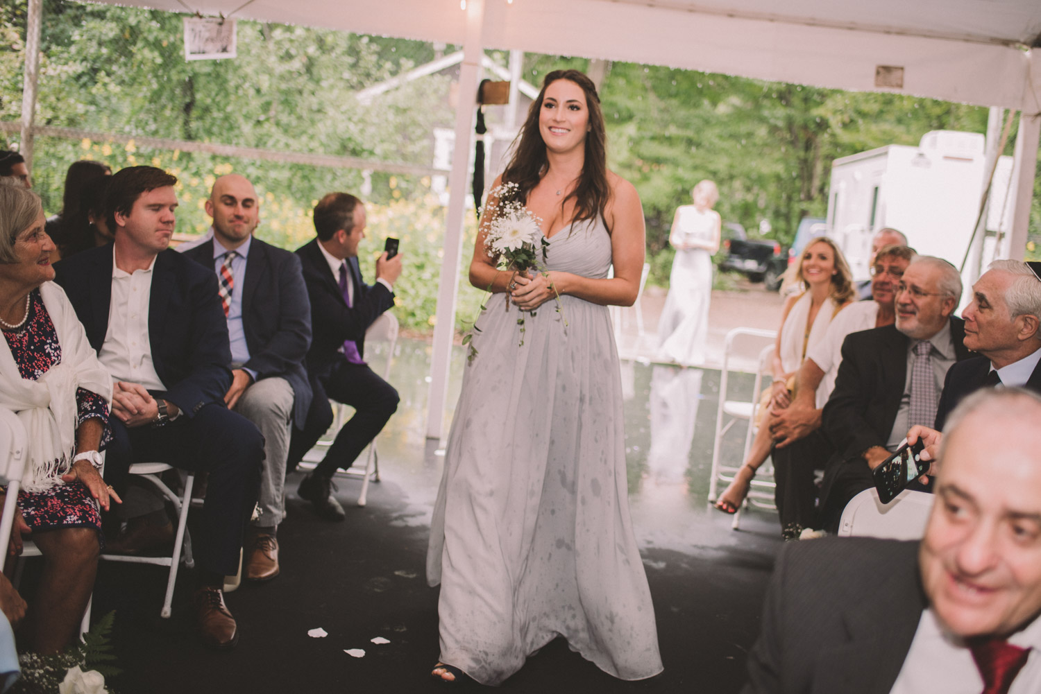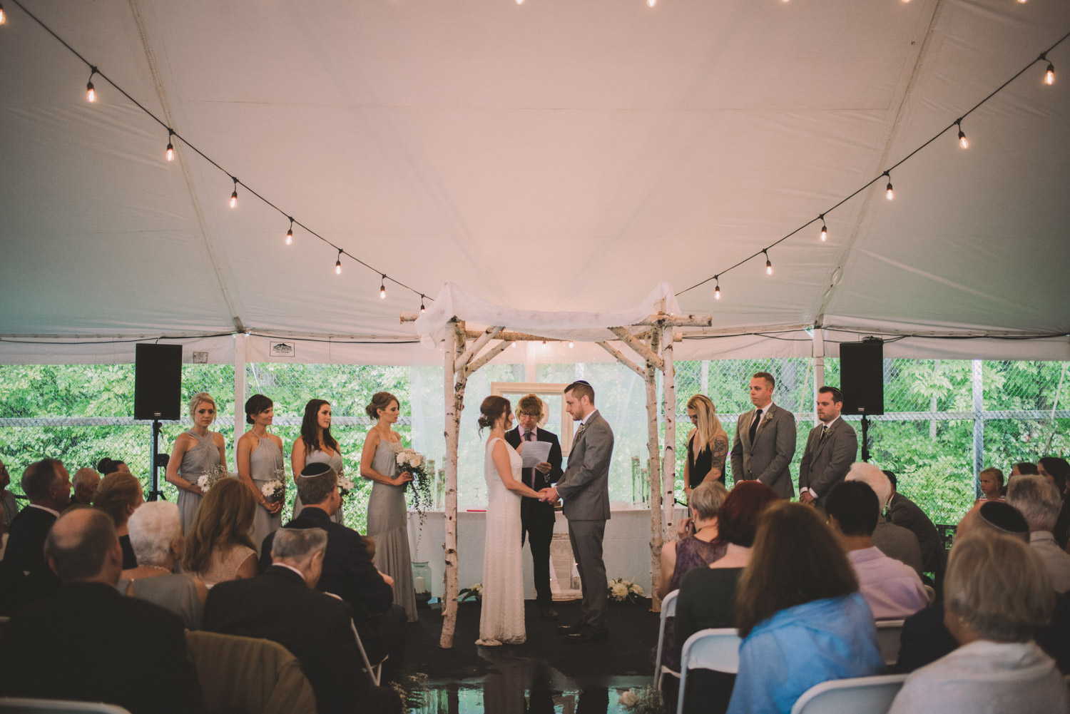 As we wrapped our first look photos the rain began to fall again, and heavily, so the ceremony was moved to the reception tent. It was quite romantic with the string lights and rain pitter-pattering above us! As their emotional ceremony wrapped up, so did the rain, and we were able to capture some beautiful family photos and bridal party photos.