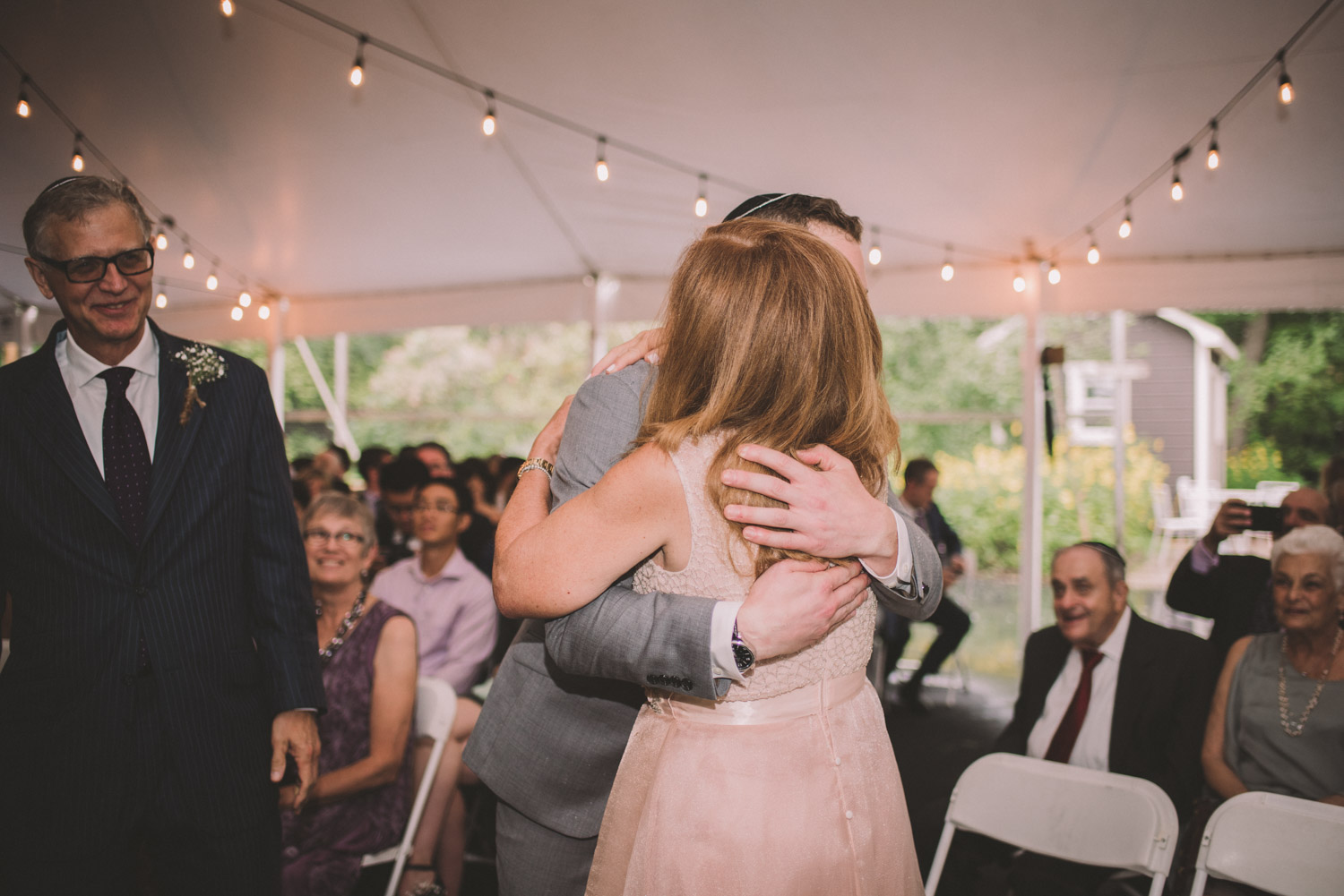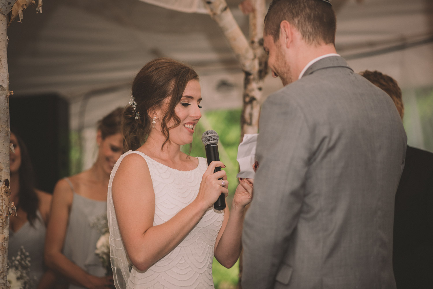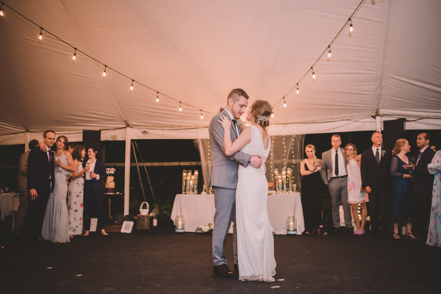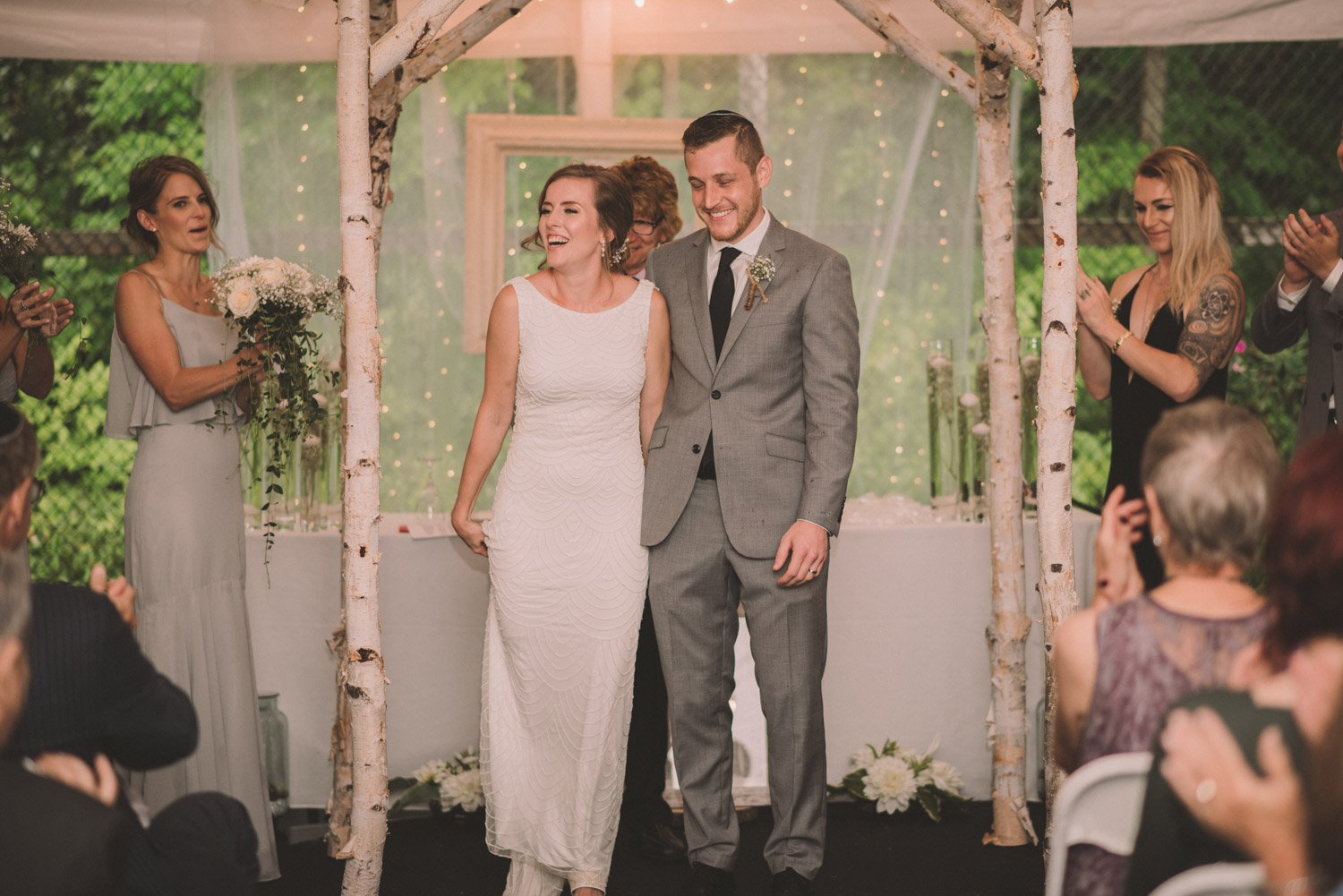 As we wrapped our first look photos the rain began to fall again, and heavily, so the ceremony was moved to the reception tent. It was quite romantic with the string lights and rain pitter-pattering above us! As their emotional ceremony wrapped up, so did the rain, and we were able to capture some beautiful family photos and bridal party photos.