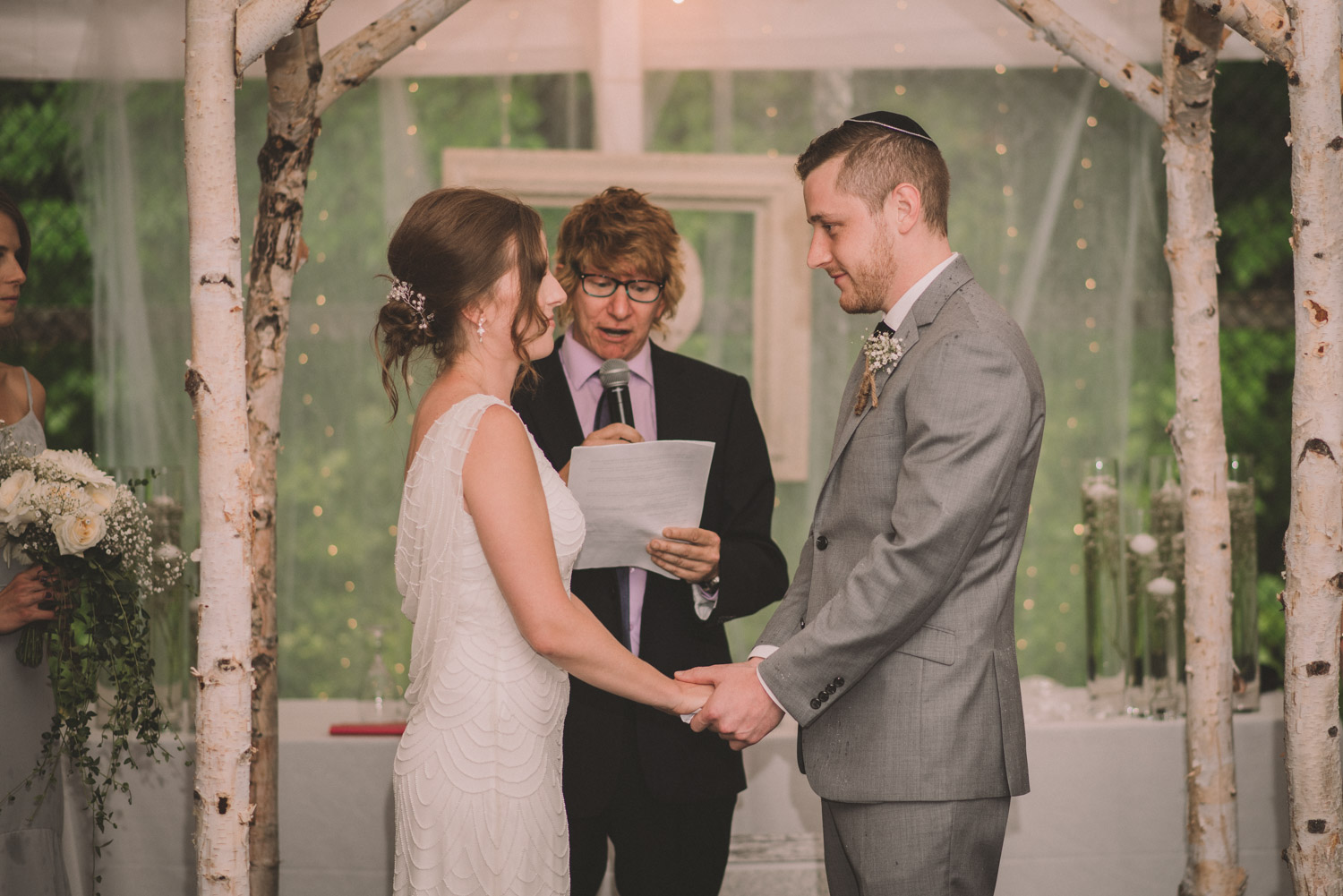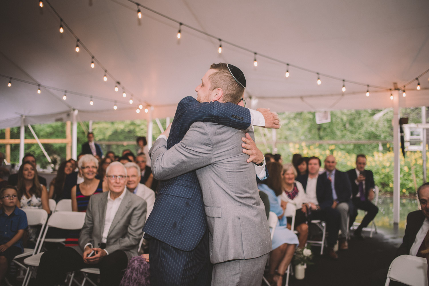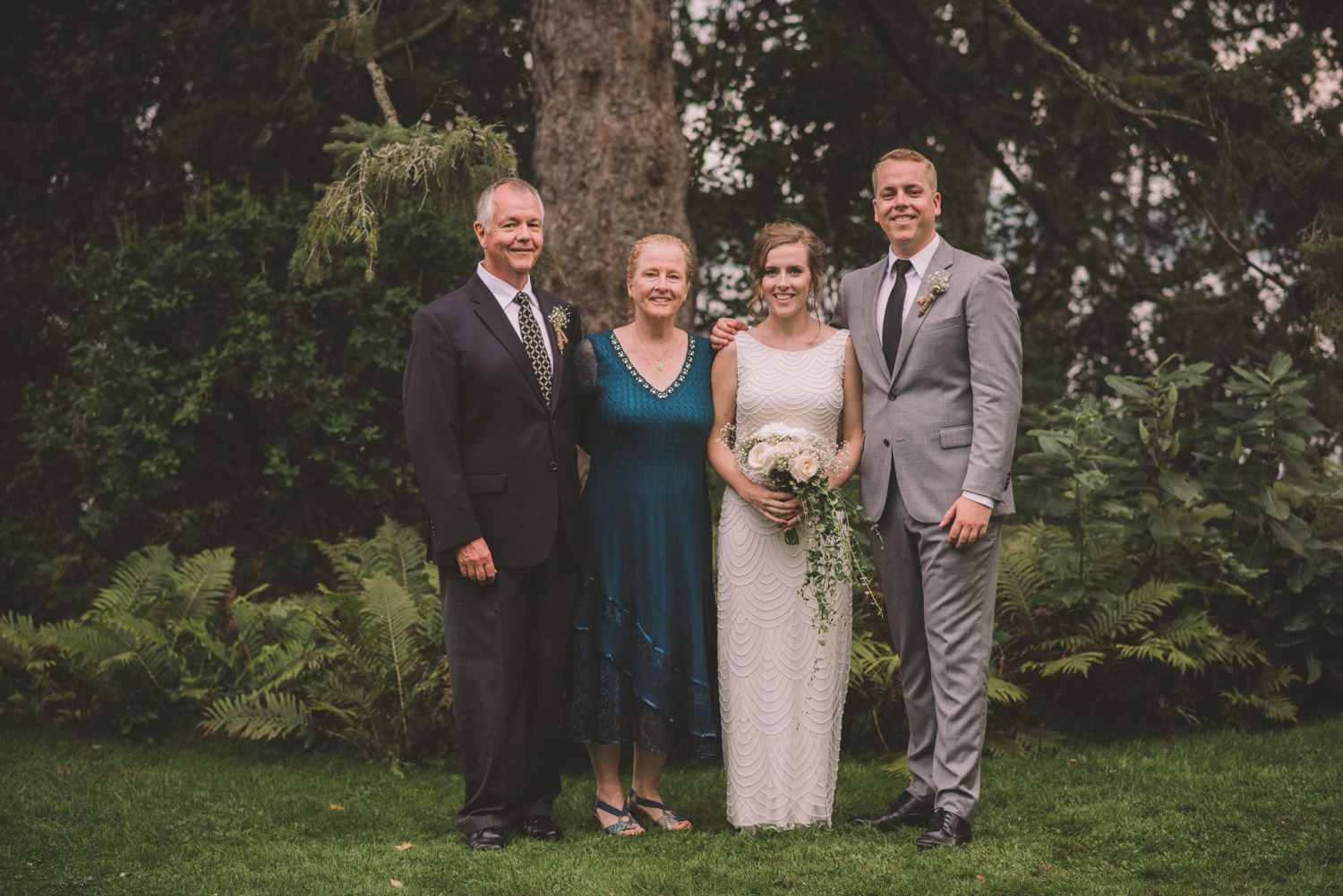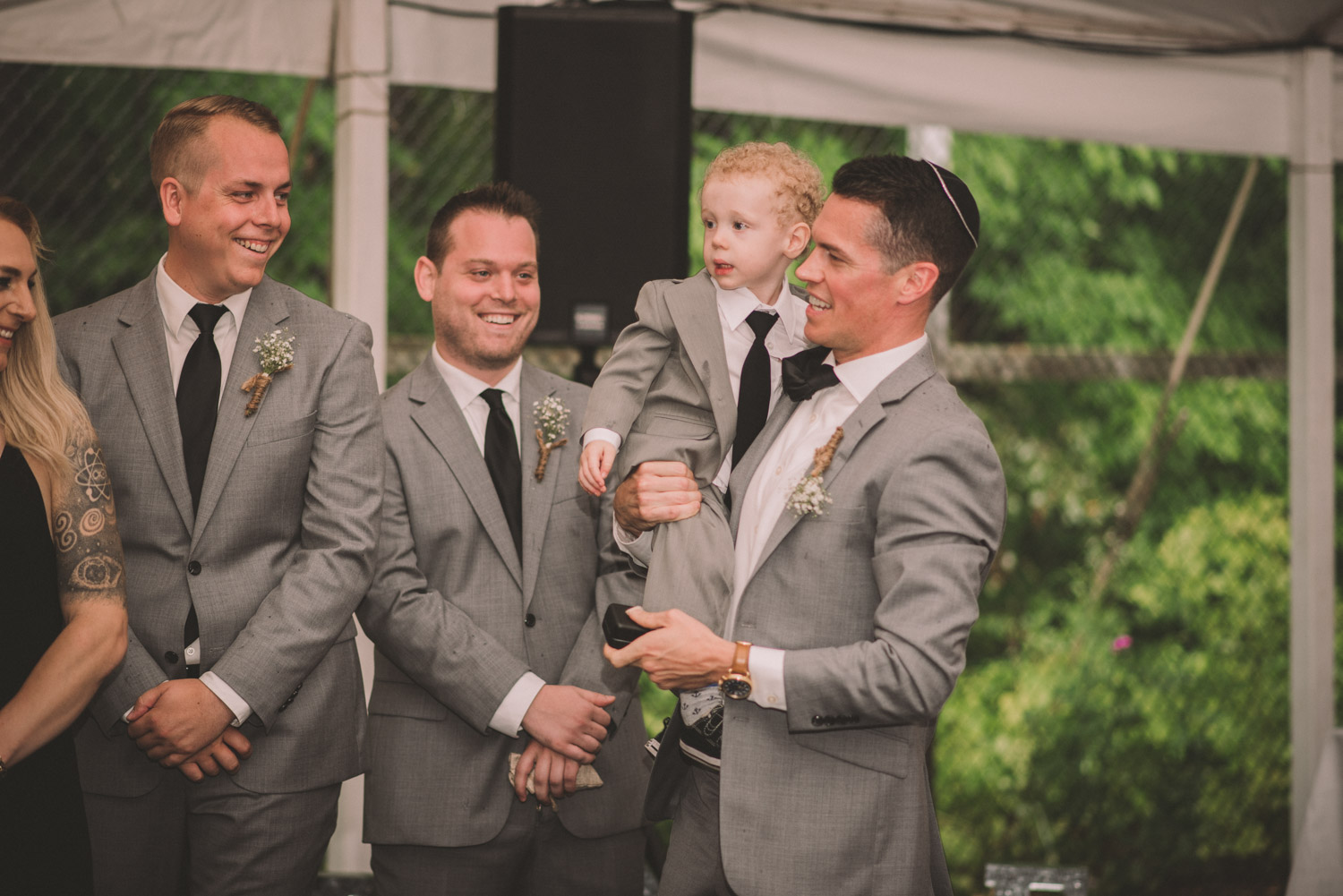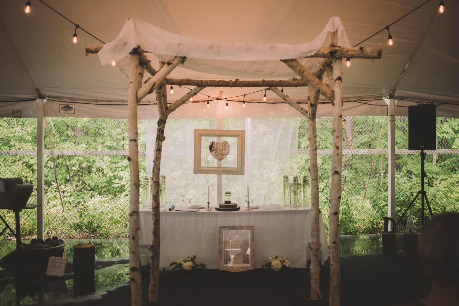 As we wrapped our first look photos the rain began to fall again, and heavily, so the ceremony was moved to the reception tent. It was quite romantic with the string lights and rain pitter-pattering above us! As their emotional ceremony wrapped up, so did the rain, and we were able to capture some beautiful family photos and bridal party photos.
