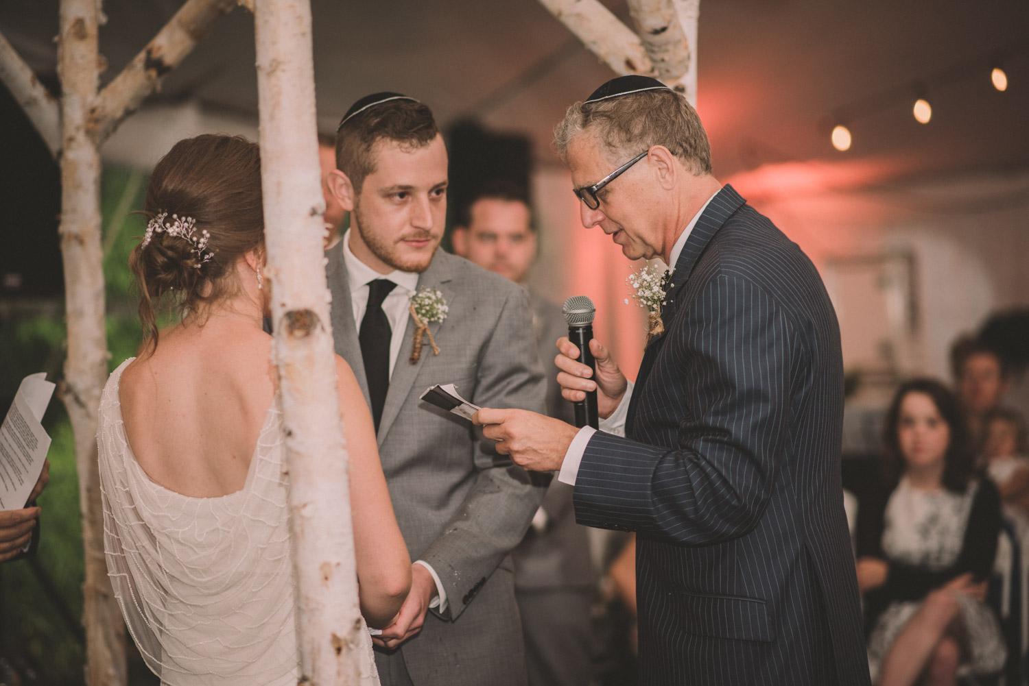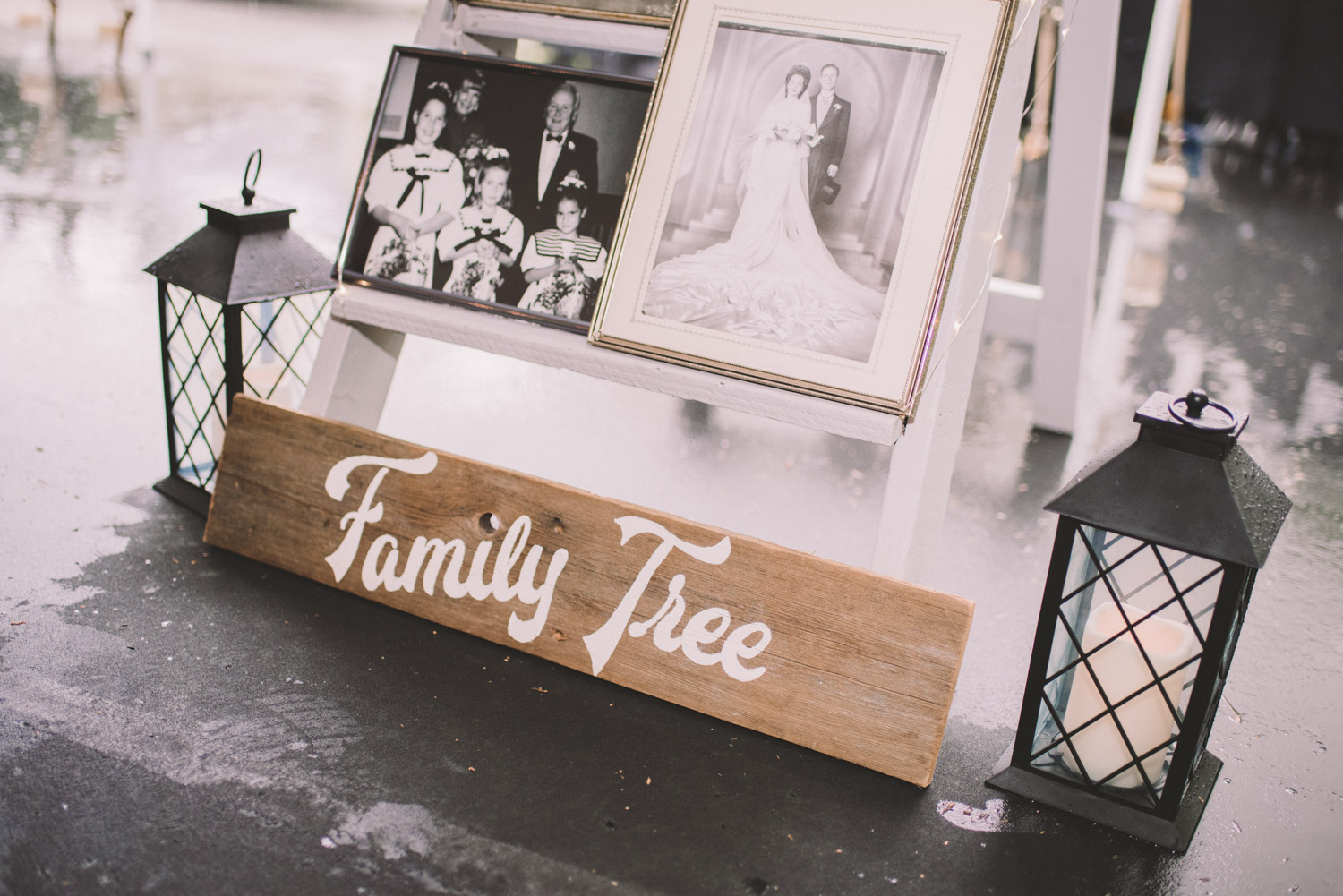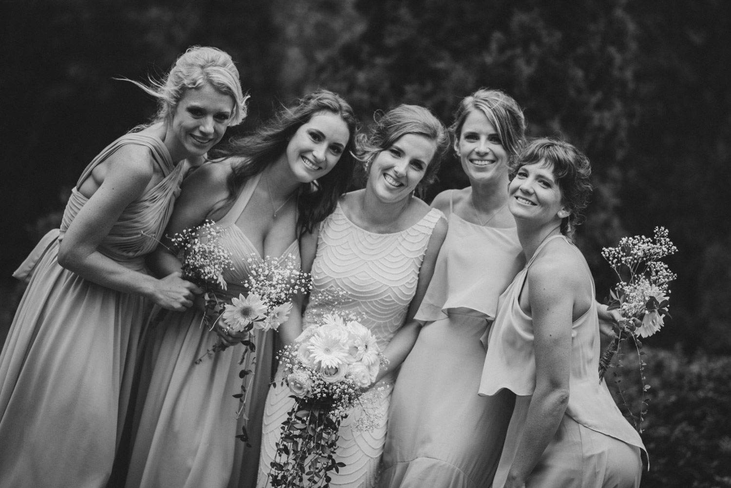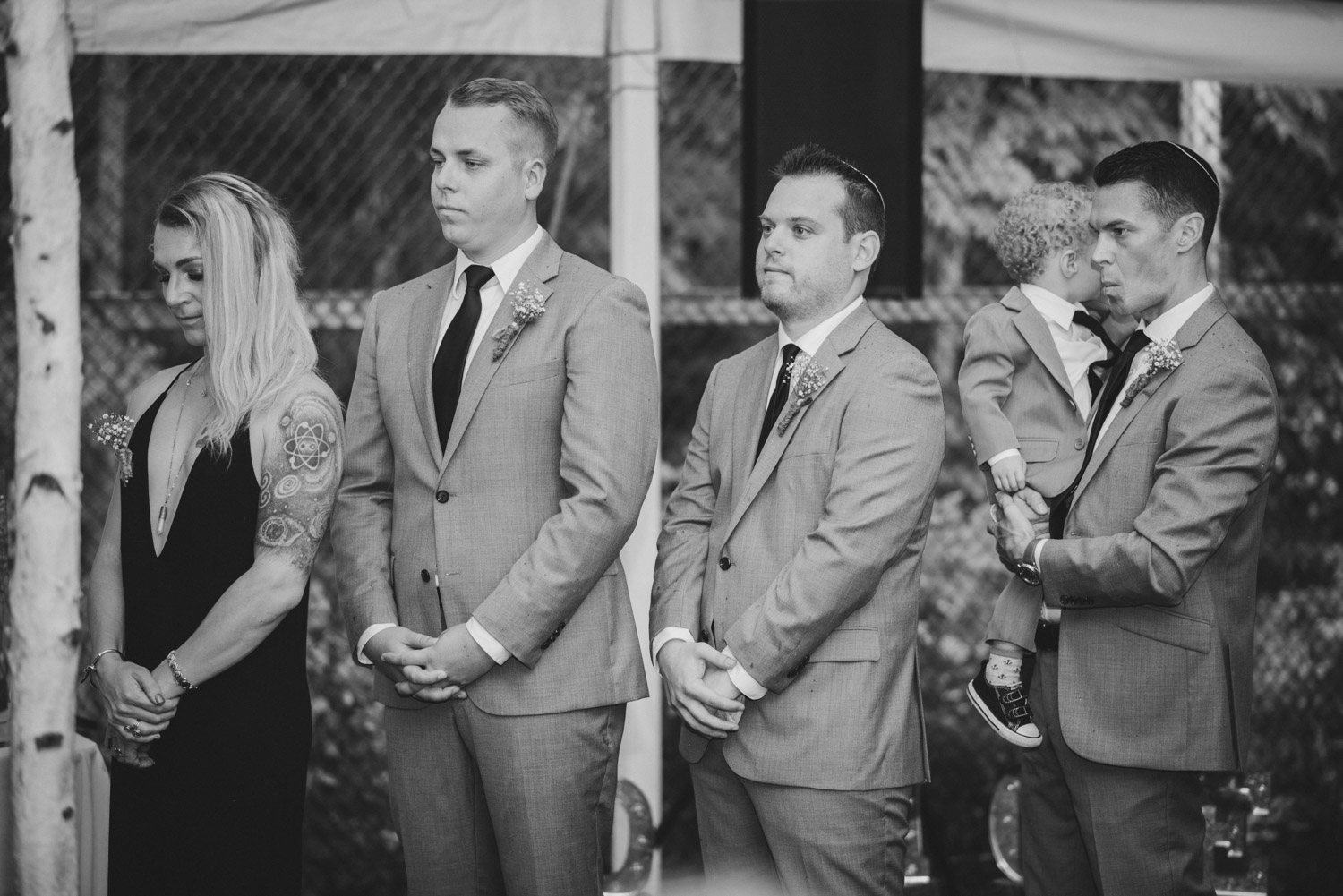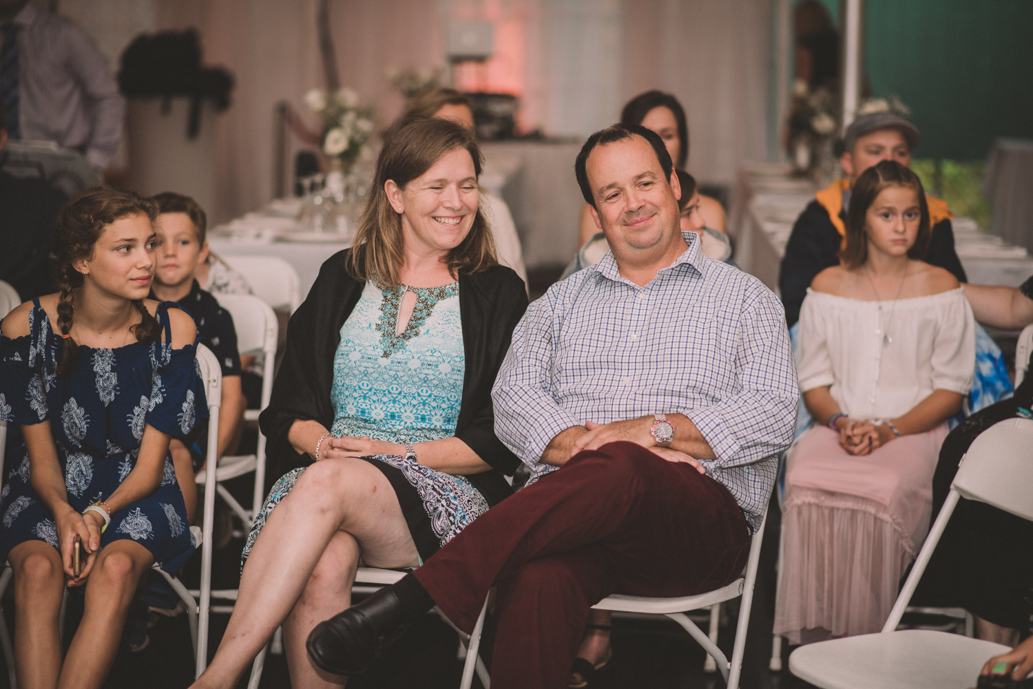 As we wrapped our first look photos the rain began to fall again, and heavily, so the ceremony was moved to the reception tent. It was quite romantic with the string lights and rain pitter-pattering above us! As their emotional ceremony wrapped up, so did the rain, and we were able to capture some beautiful family photos and bridal party photos.