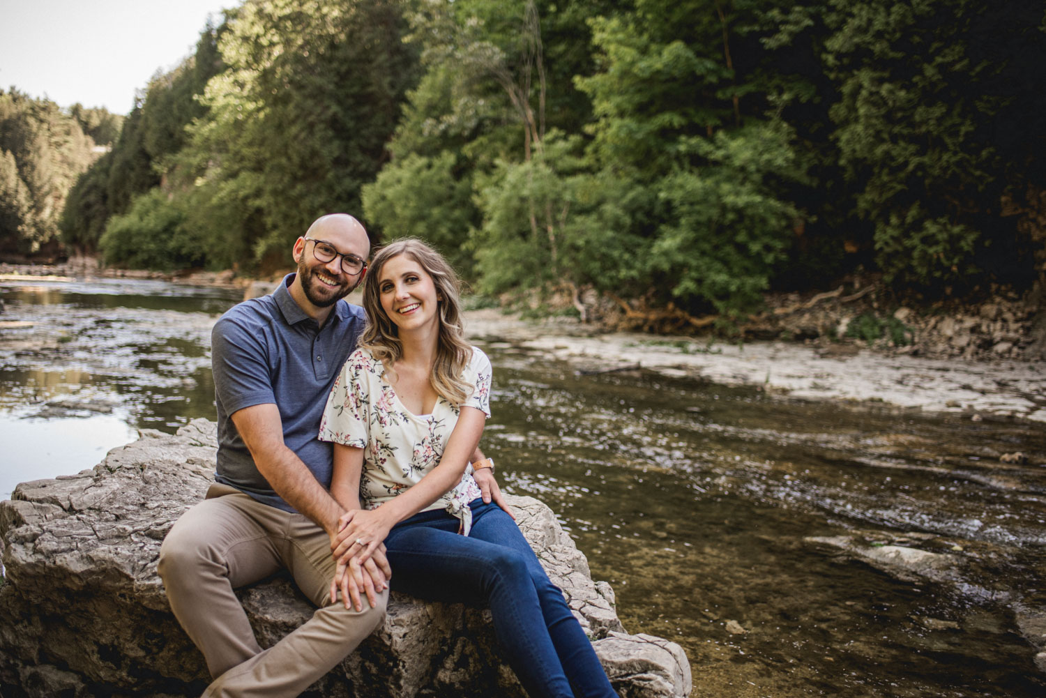 I recently met up with the lovely Laura and David for photography in Victoria Park in Elora, as well as down in the river area. In the Park, we found a lovely patch of little white daisies where Laura and David did not balk at my request to have them lay down on the ground for some adorable head-to-head photos. We then proceeded down the steep steps and into the gorge. It was a beautiful day. The low water level in the river meant that I could get right in the cool water to photograph Laura and David up on the various rocks! We had a great time and lots of laughs as always. I can’t wait for their beautiful upcoming wedding day!