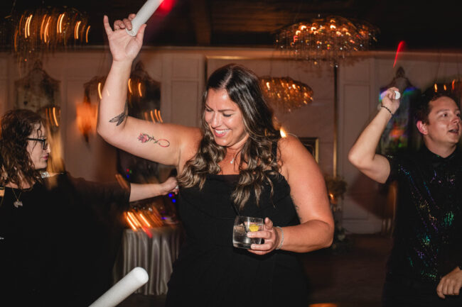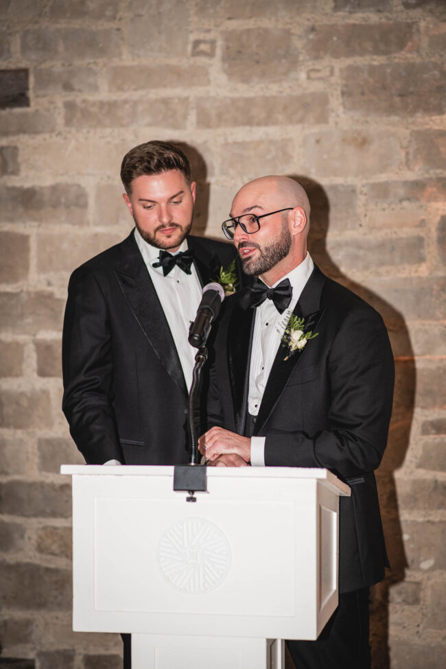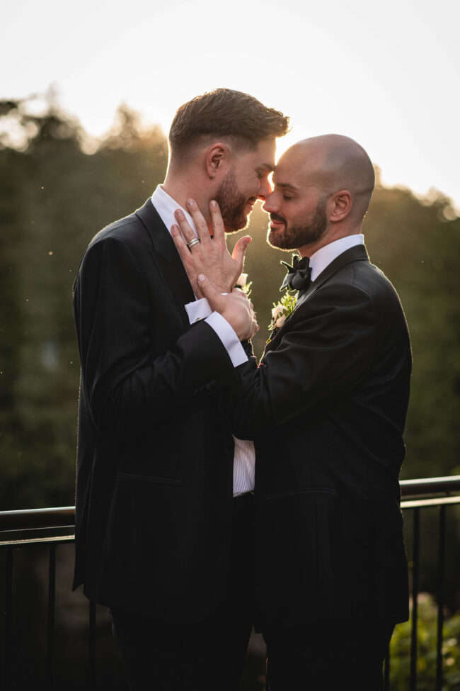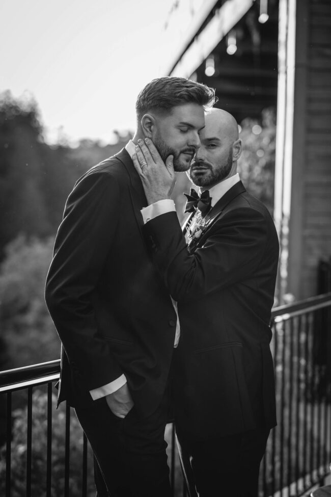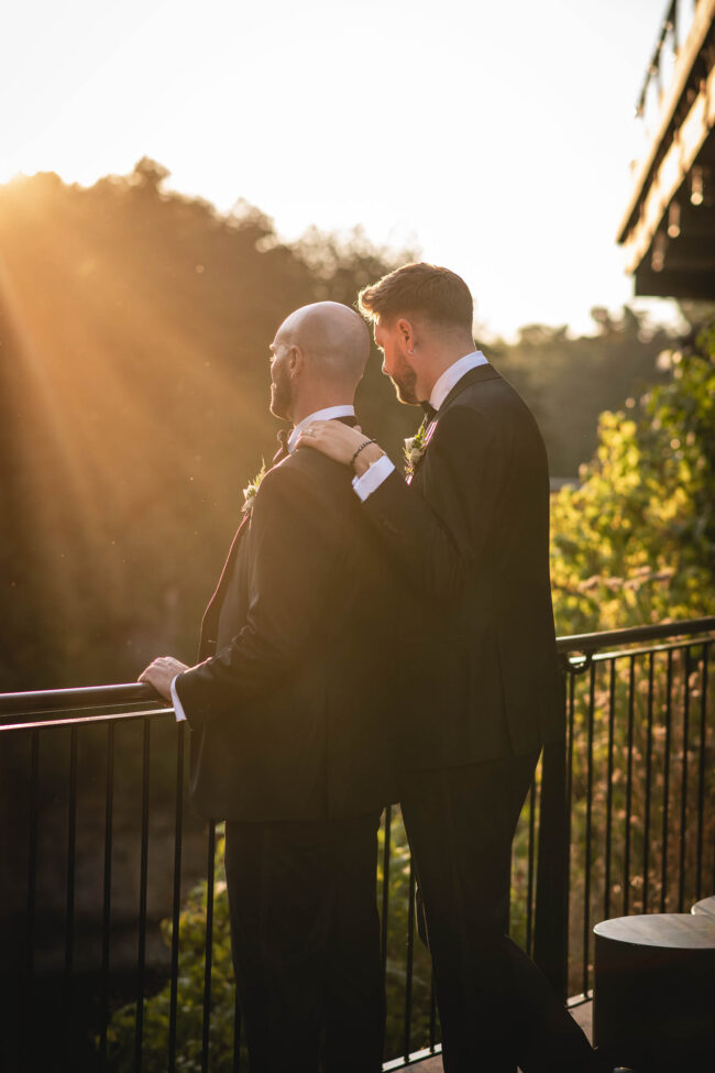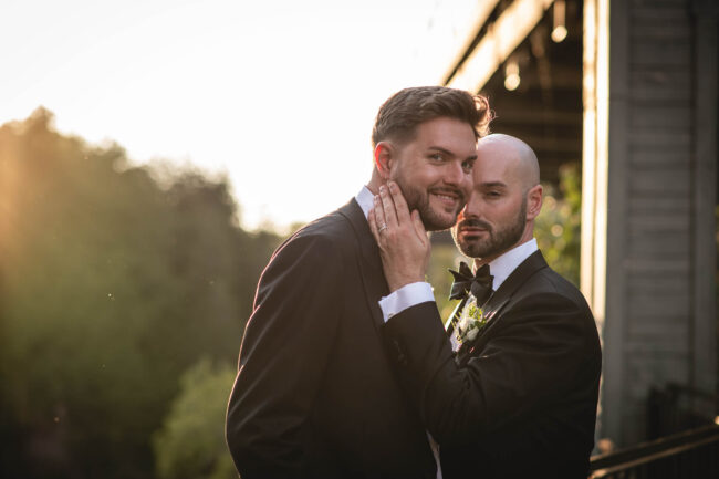 After the ceremony, we moved seamlessly into wedding party/friend photos both inside the Foundry and outdoors in the beautiful surroundings. Their groom-and-groom photo session was full of laughter, connection, and all the natural chemistry they share. Tyson and Gordon wanted to get a sneak peek of their reception decor and shared a private (and very sweet) first dance in their reception hall before enjoying cocktail hour with friends and family – and a gorgeous champagne tower. We ended the evening with a formal reception, a fun dance party, and some dreamy sunset portraits by on the river lookout that wrapped the day up perfectly.