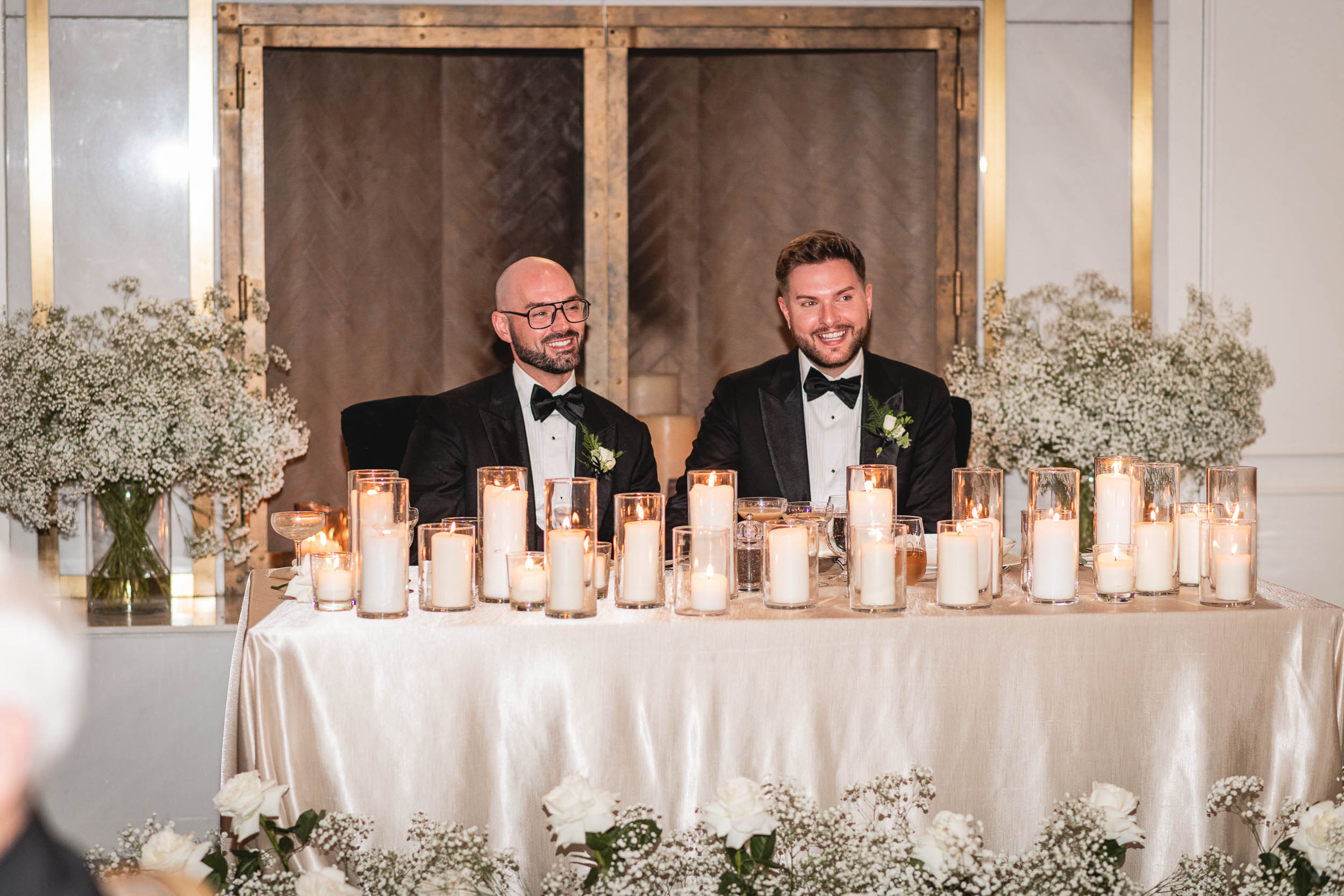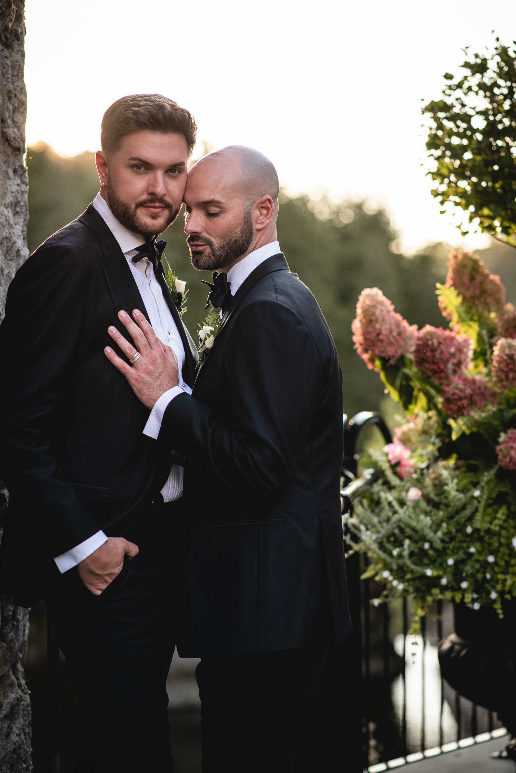After the ceremony, we moved seamlessly into wedding party/friend photos both inside the Foundry and outdoors in the beautiful surroundings. Their groom-and-groom photo session was full of laughter, connection, and all the natural chemistry they share. Tyson and Gordon wanted to get a sneak peek of their reception decor and shared a private (and very sweet) first dance in their reception hall before enjoying cocktail hour with friends and family – and a gorgeous champagne tower. We ended the evening with a formal reception, a fun dance party, and some dreamy sunset portraits by on the river lookout that wrapped the day up perfectly.