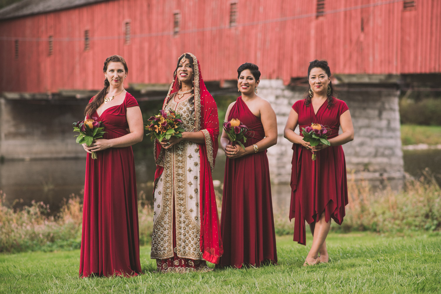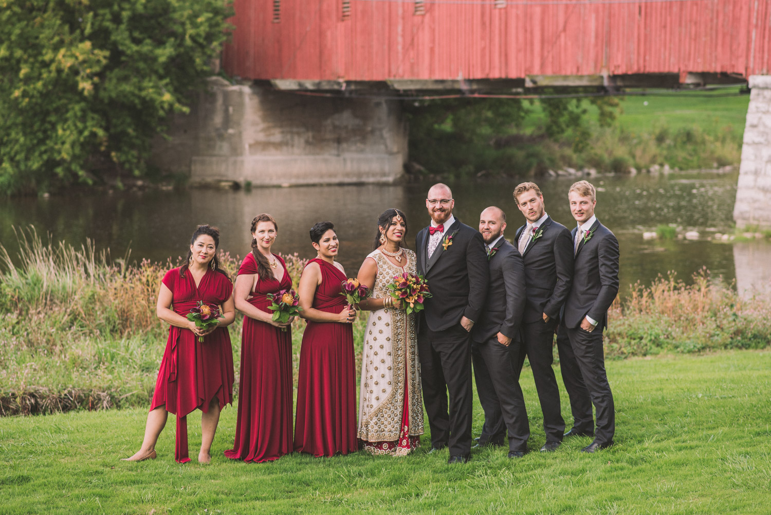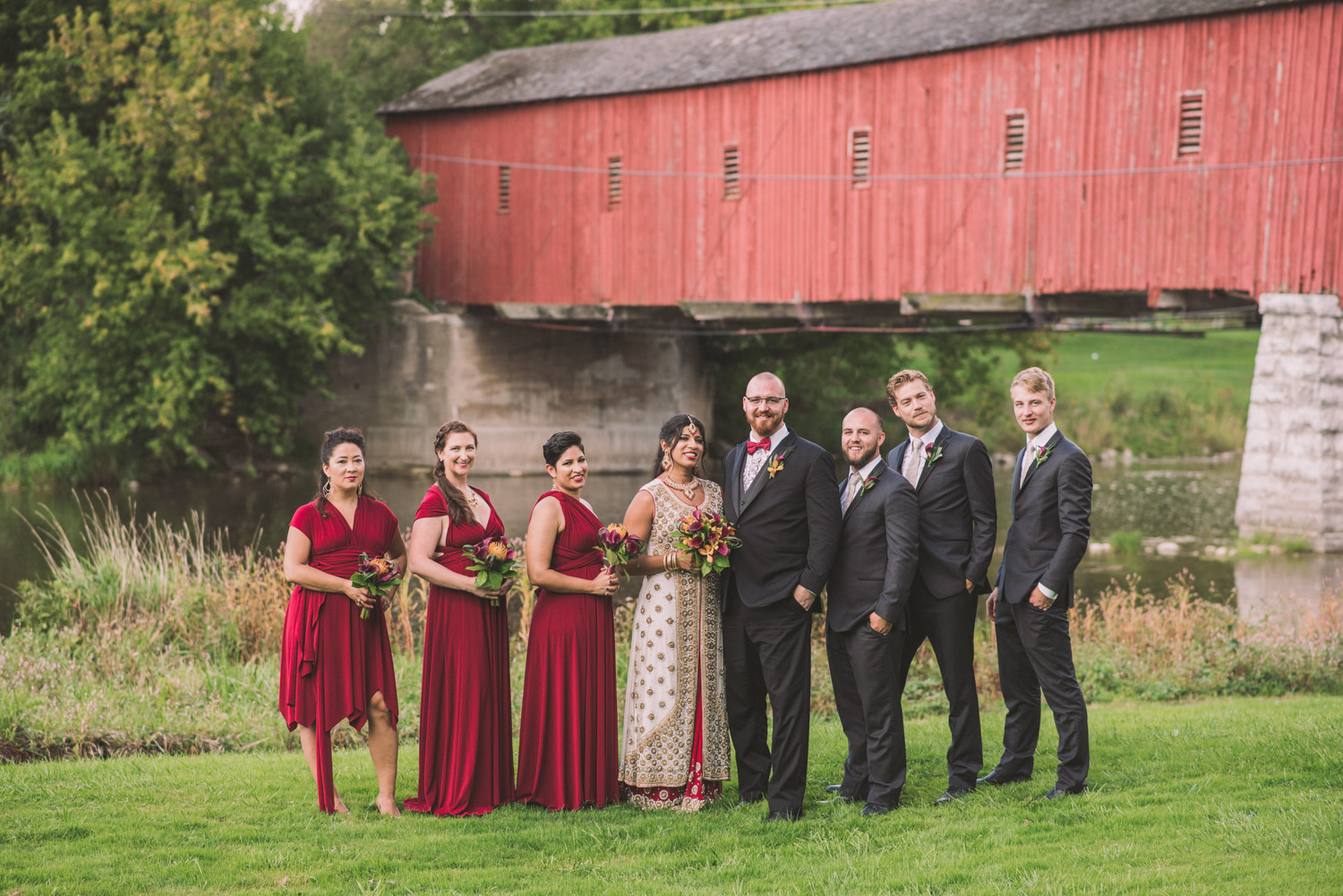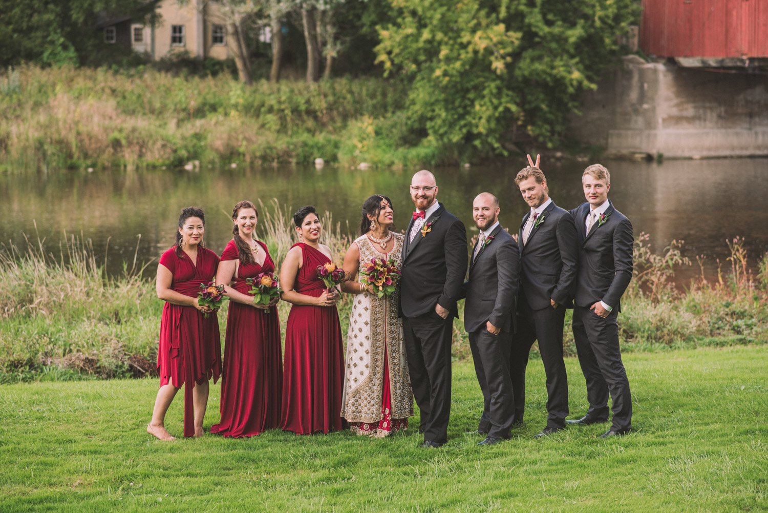 Irim and Tyler’s wedding took place in Elora, on Tyler’s family’s beautiful property. We started the day with preparation photos of both the boys and girls – I LOVED Irim’s intricate and beautiful jewellery and dress! Irim and Tyler’s emotional ceremony took place in front of his family’s home surrounded by family and friends. We then headed to the historic West Montrose Covered Bridge nearby for family photos and bridal party photography. This bridal party was HILARIOUS! I was in stitches as we captured their antics. So much fun!