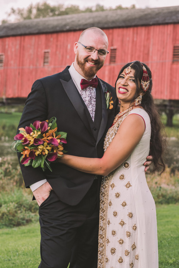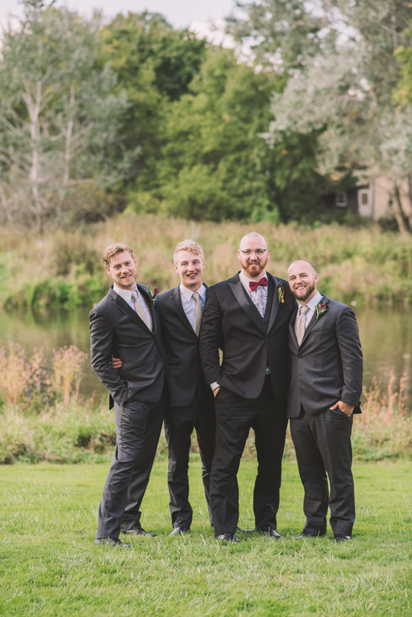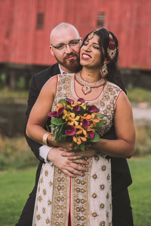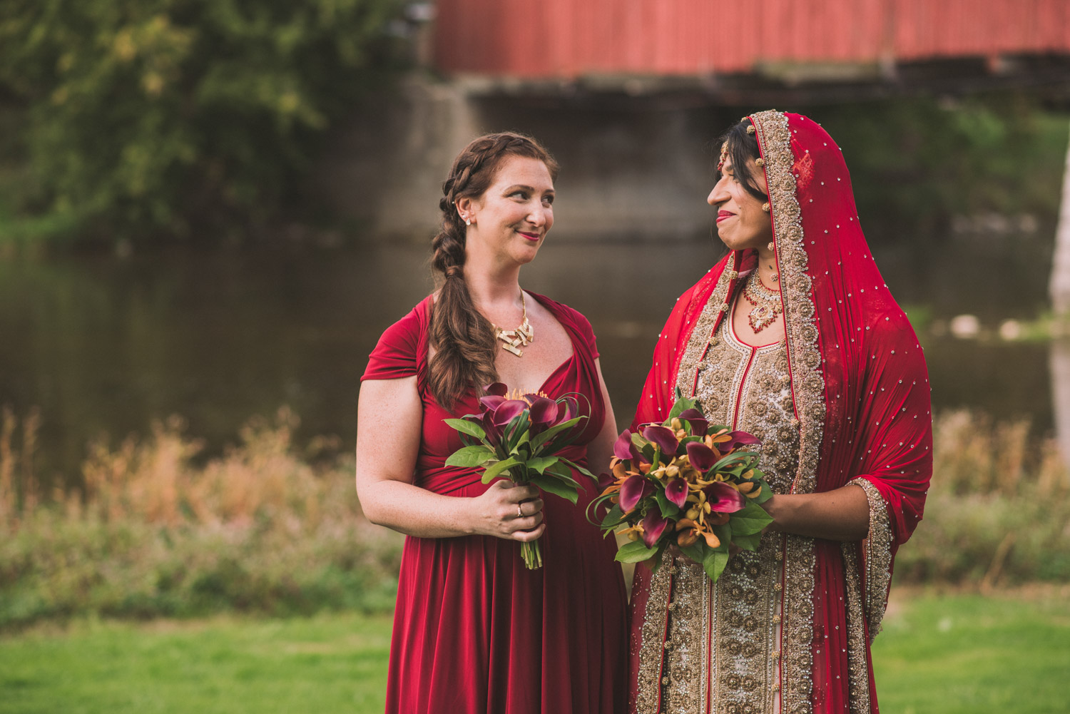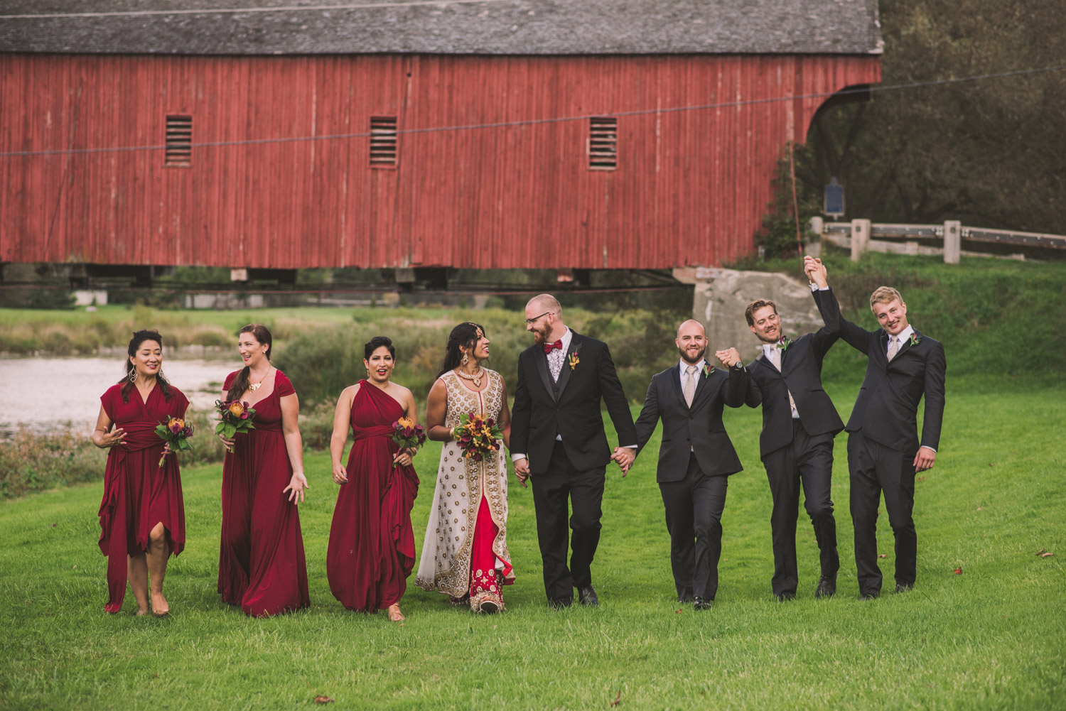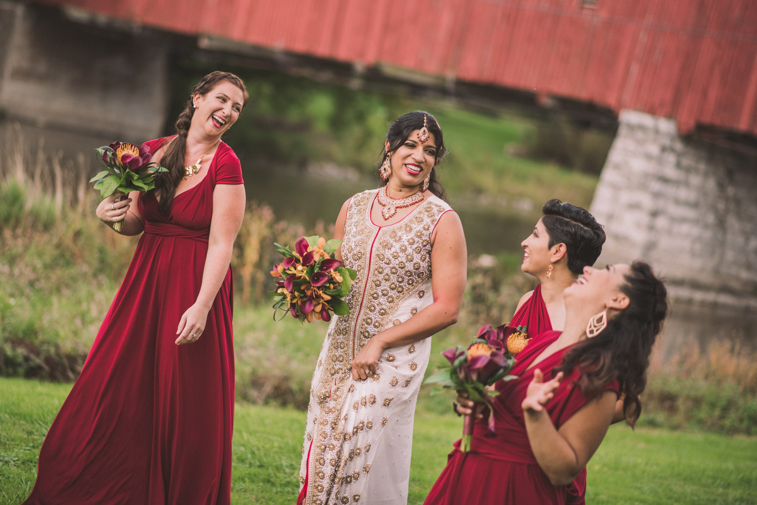 Irim and Tyler’s wedding took place in Elora, on Tyler’s family’s beautiful property. We started the day with preparation photos of both the boys and girls – I LOVED Irim’s intricate and beautiful jewellery and dress! Irim and Tyler’s emotional ceremony took place in front of his family’s home surrounded by family and friends. We then headed to the historic West Montrose Covered Bridge nearby for family photos and bridal party photography. This bridal party was HILARIOUS! I was in stitches as we captured their antics. So much fun!