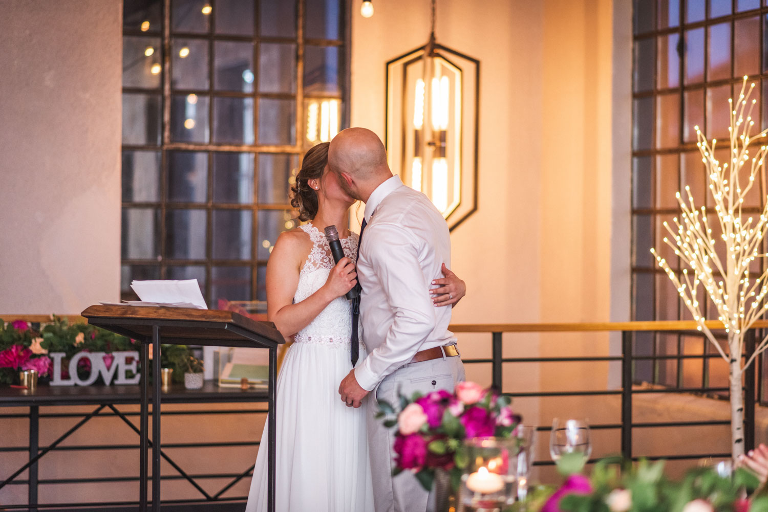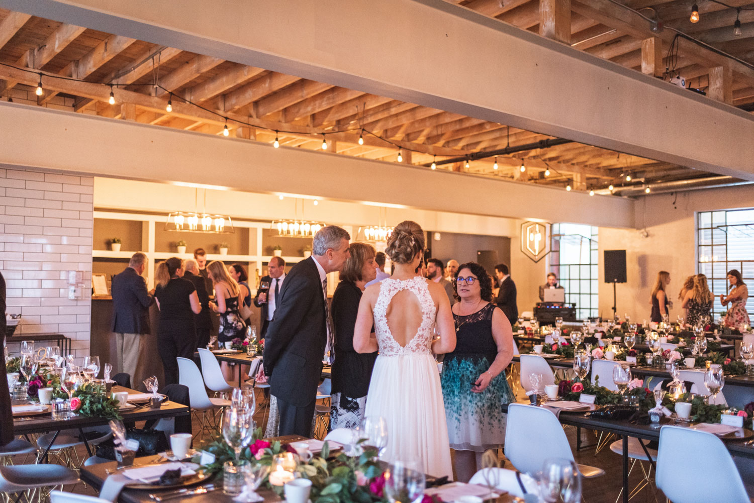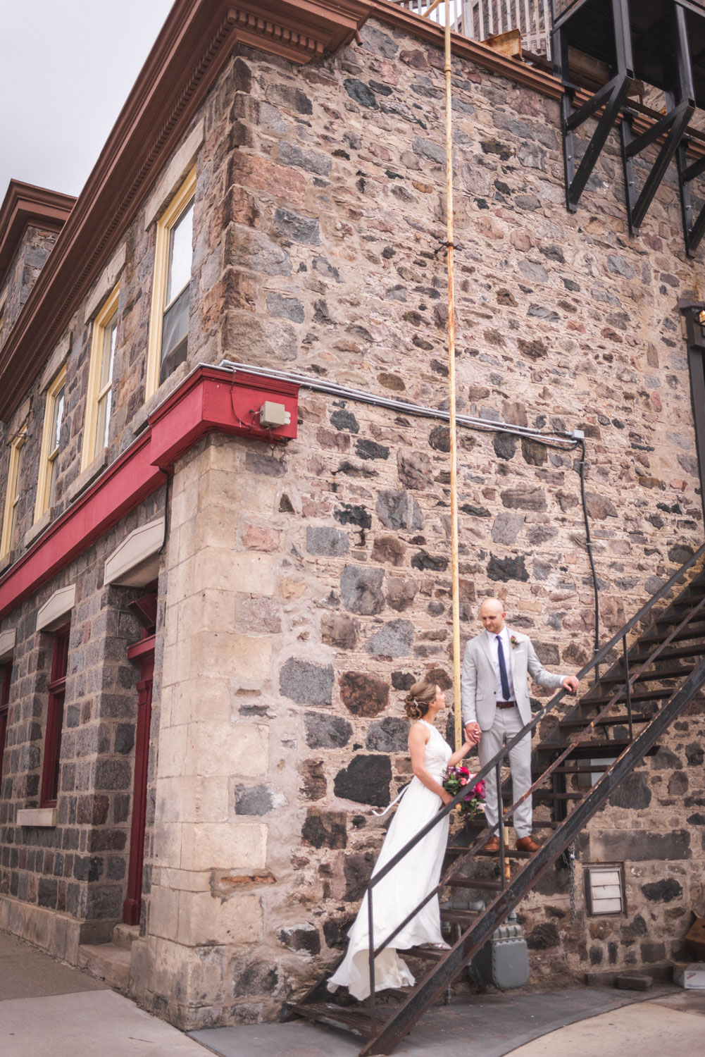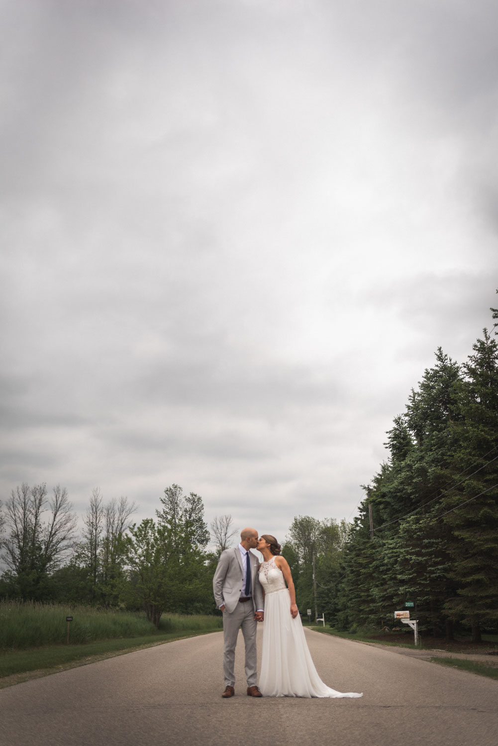 Almost a full year later, their wedding day rolled around! We met during the early summer blossoms at their family property in Cambridge, where I began photography with Karine putting on her dress, followed by a touching first look with Brian in the spacious backyard. We had a lovely photoshoot around the property, and across the road in a gorgeous field! It was then time for their ceremony, in (believe it or not) a highly polished and stylish garage building on the property. We then proceeded to Cambridge, where we captured some gorgeous photos around the lovely limestone buildings and bridge in the downtown area, and inside EVO Kitchen, where their stylish reception took place.