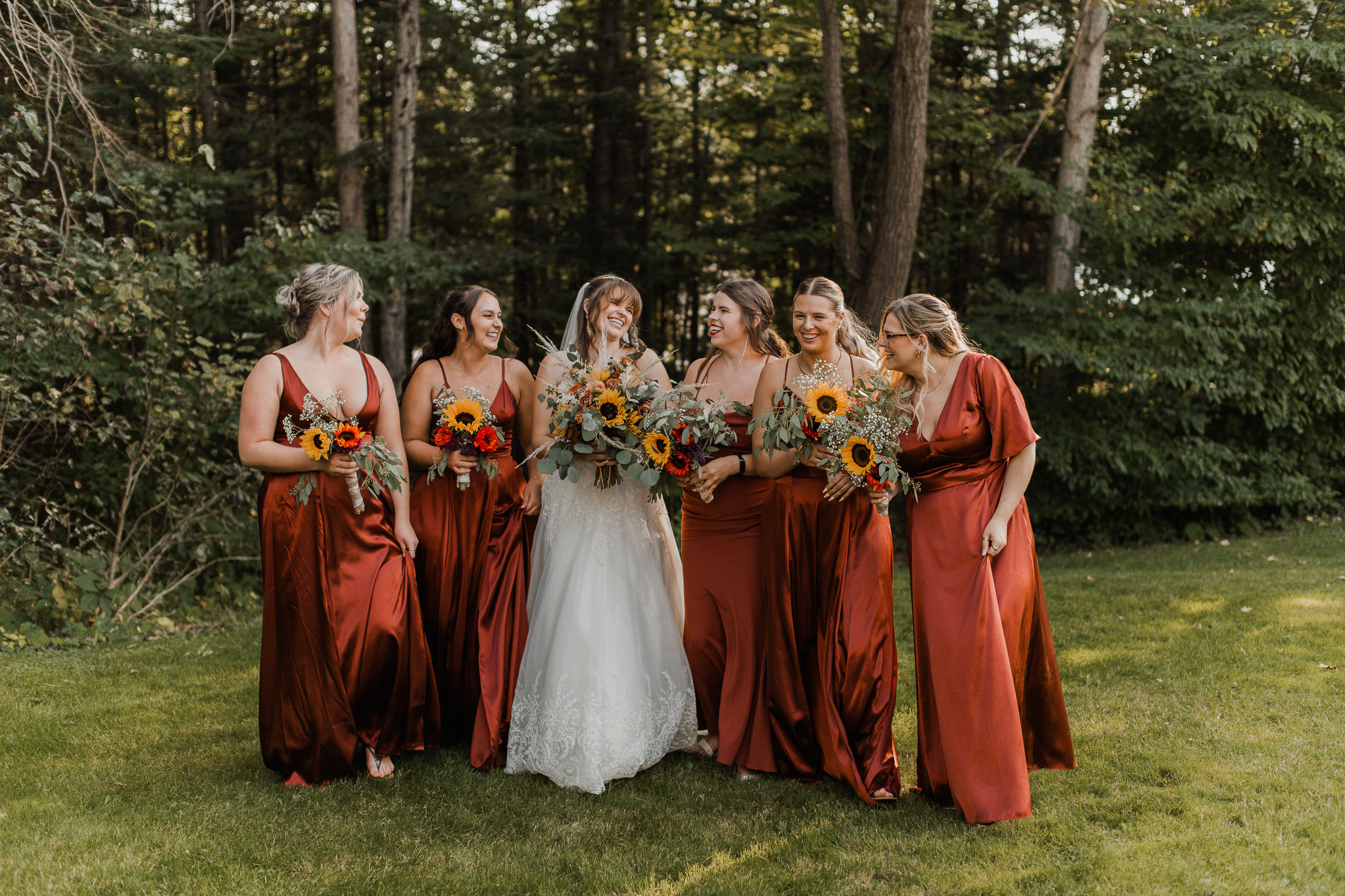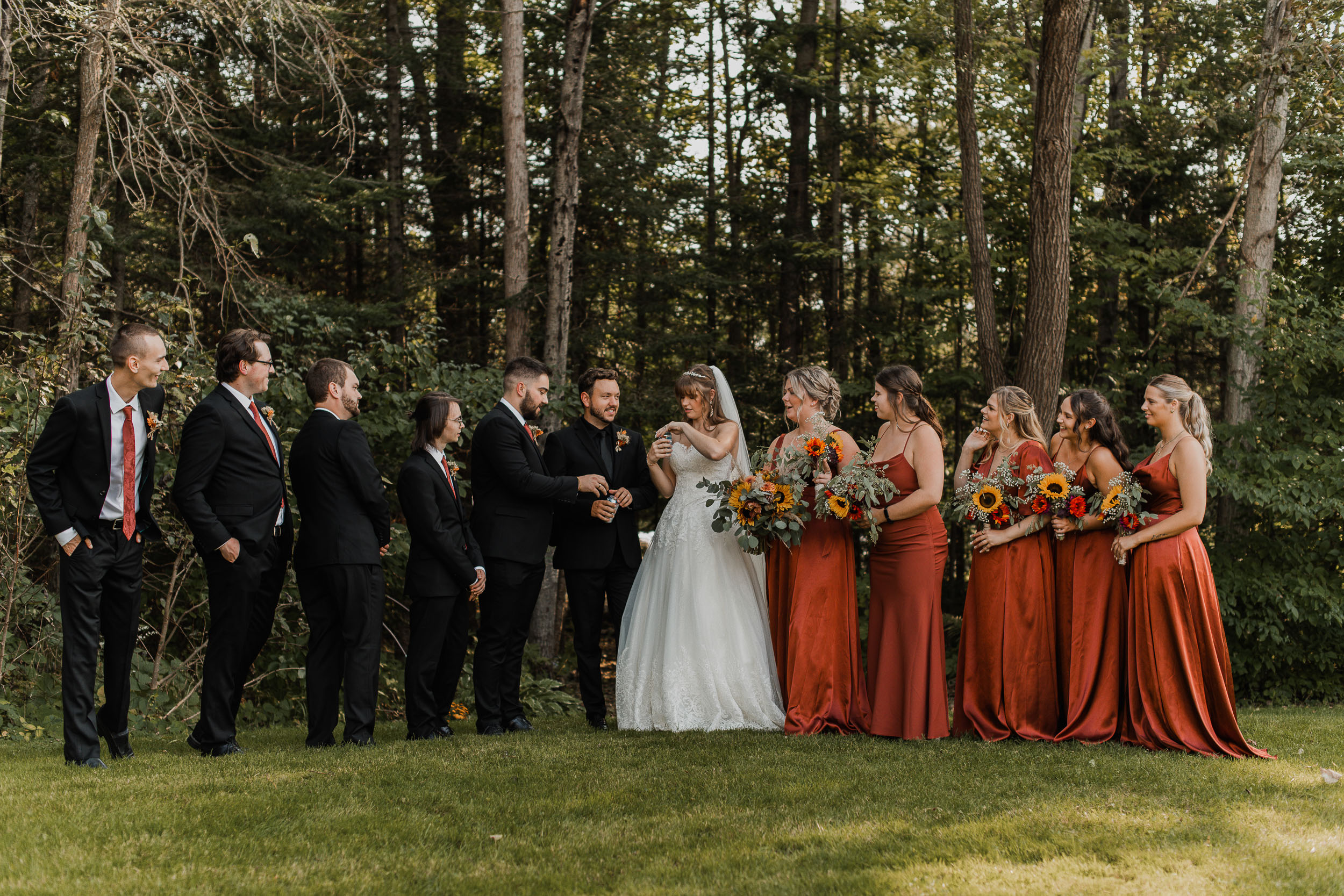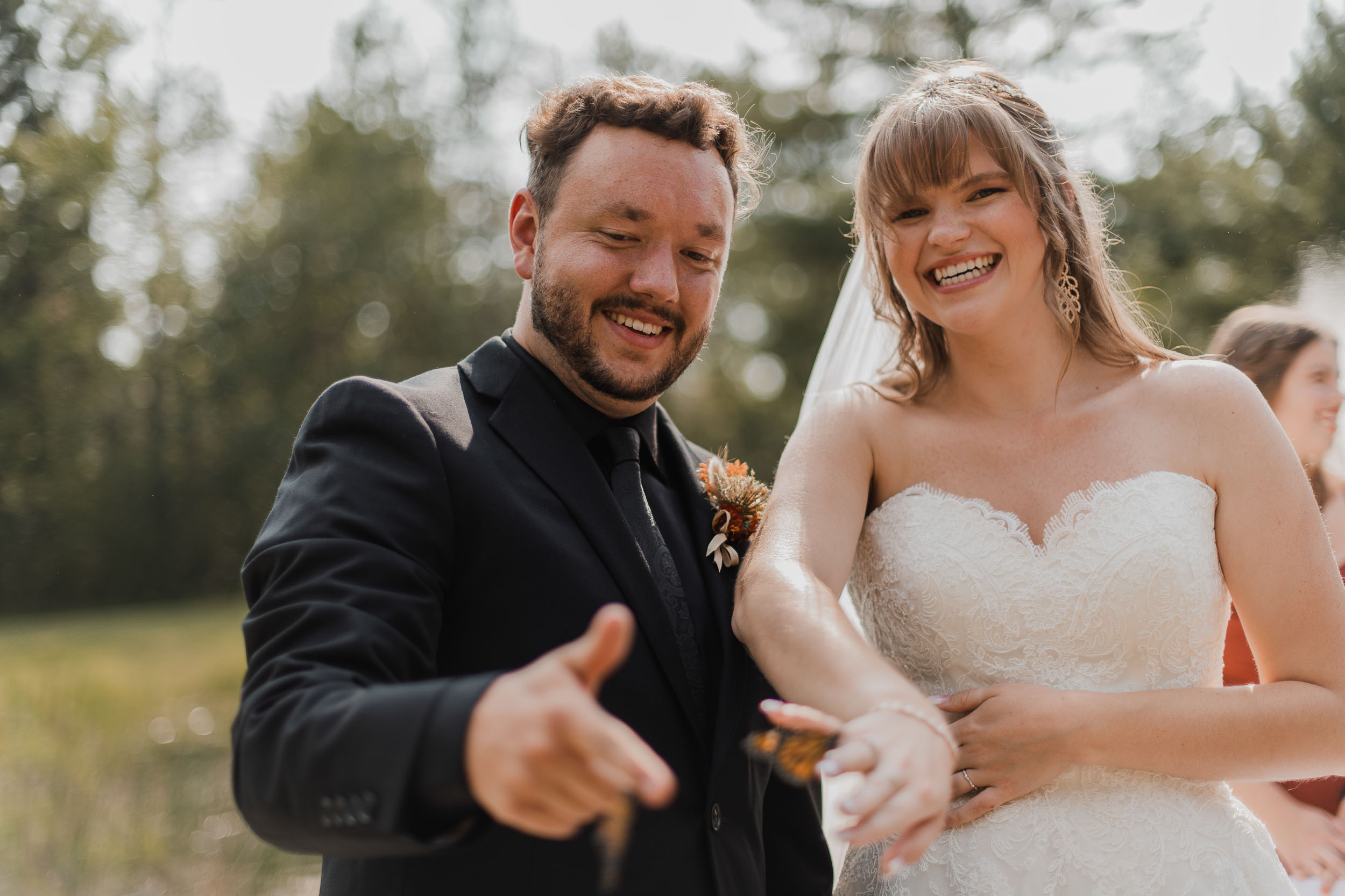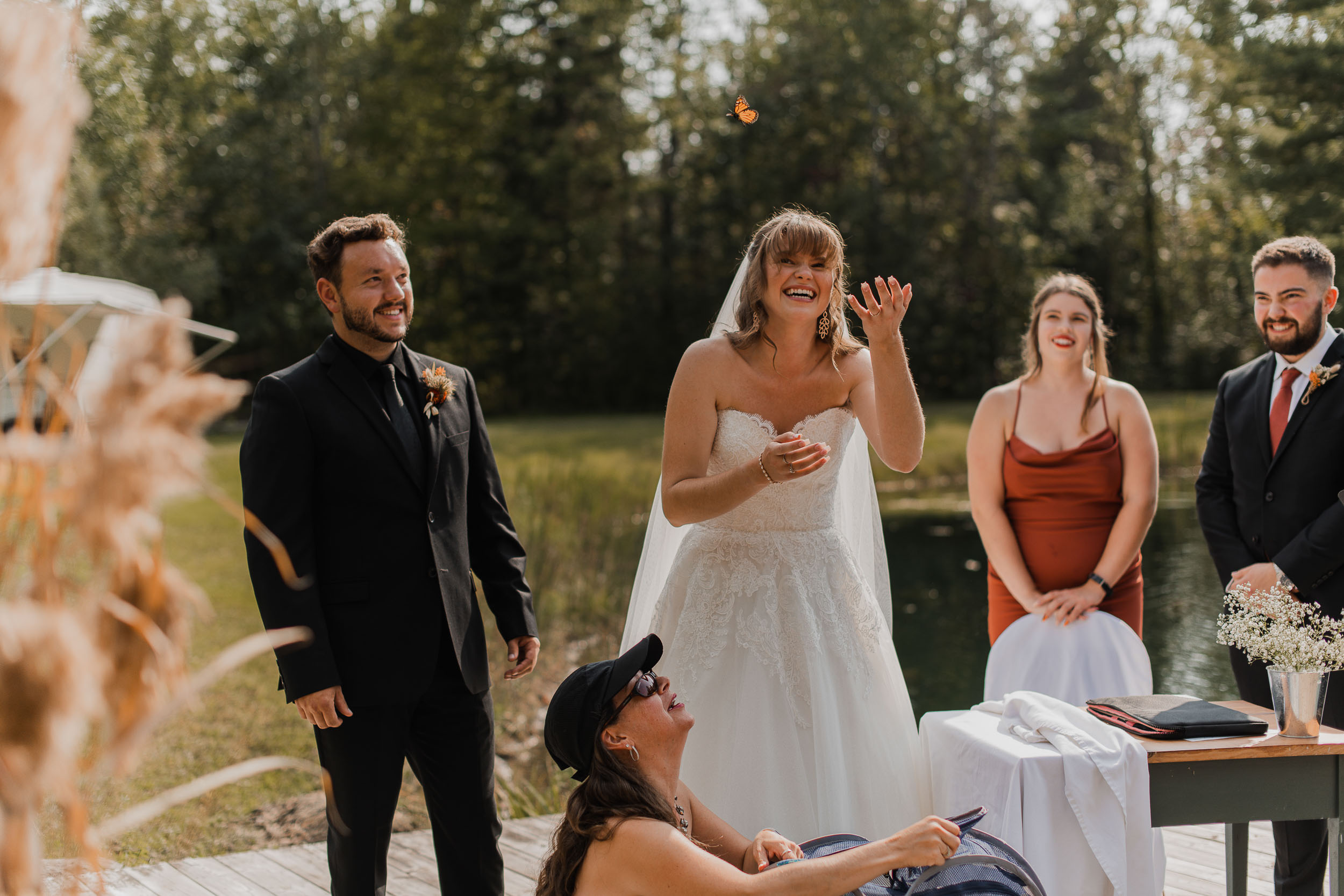 With the final touches applied and the dress put on, Victoria had an emotional first look with her bridesmaids and then with her father behind the house, while Derek and the groomsmen started the ceremony proceedings outside, on the opposite side of the home past a wooded area. The ceremony took place with the lovely late afternoon sun, and overlooked a beautiful little lake and fountain. Uniquely, in my 15+ years of wedding photography, this was the first time I had seen a ceremony which featured a butterfly release! The monarch butterflies seemed more eager to stay put on their fingers than fly away, which was pretty darn cute 🙂