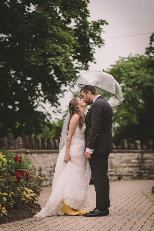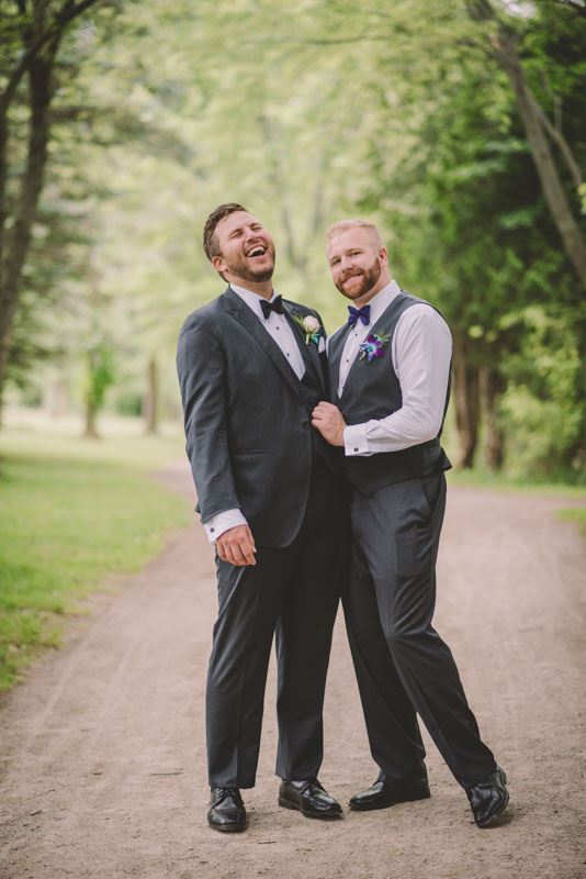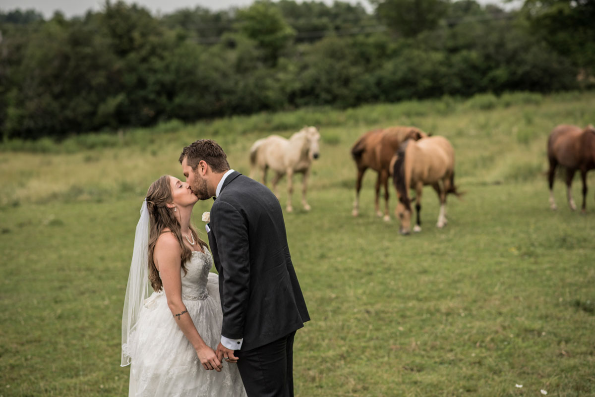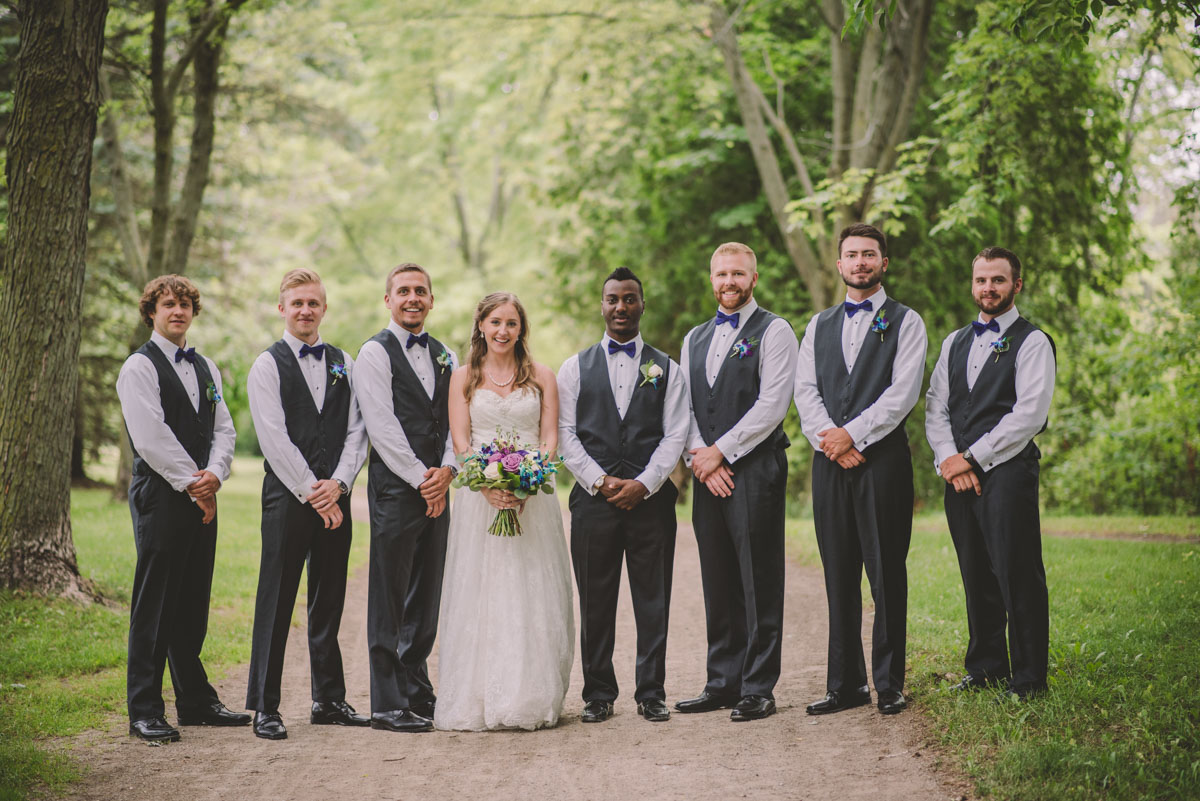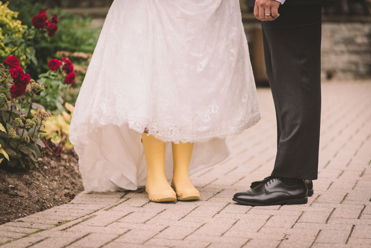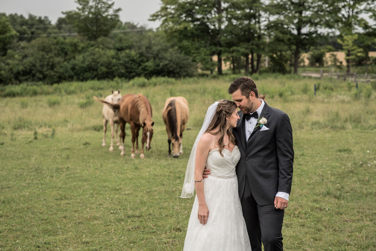 This past July, Ray and Billy’s big day finally arrived! We met at Templin Gardens in Fergus, where I positioned Billy by the water to wait for Rachel’s arrival.  The first look was followed by their formal photos at the Gardens, and at nearby property of one of their bridal party members.  This beautiful farm had horses — so in her yellow rain boots, Ray and Billy had a photoshoot with them, too!