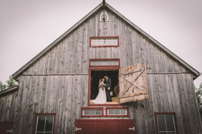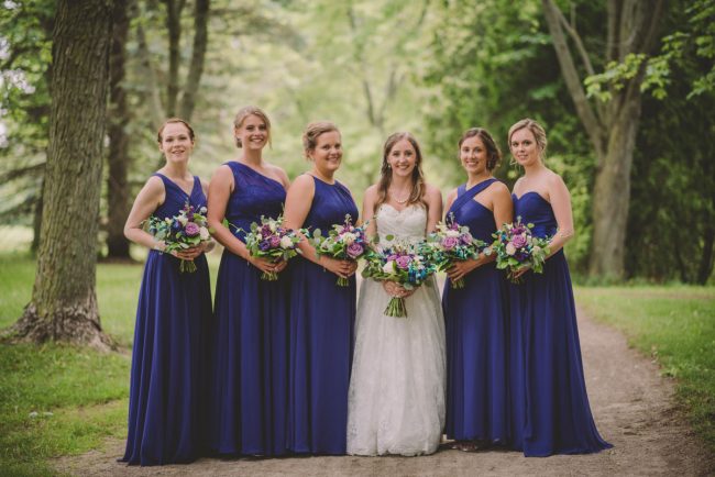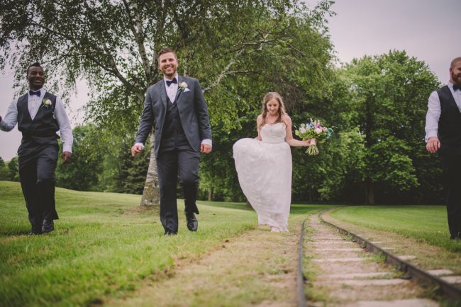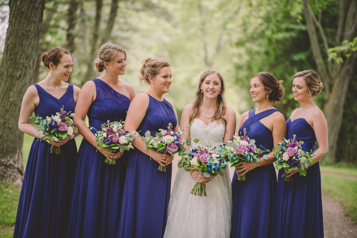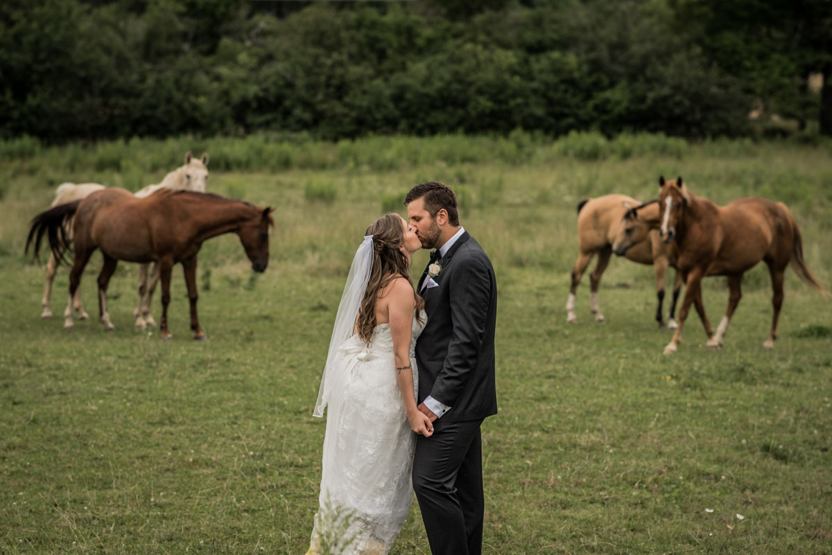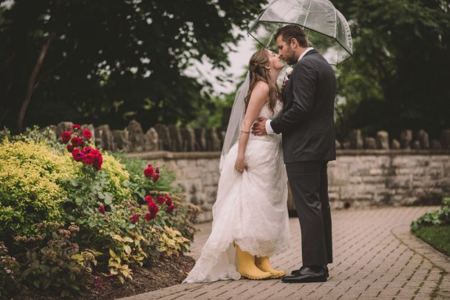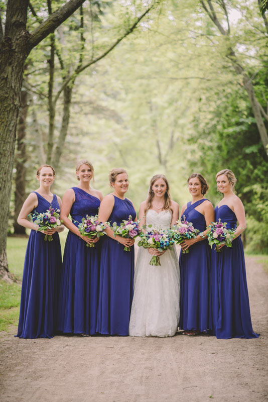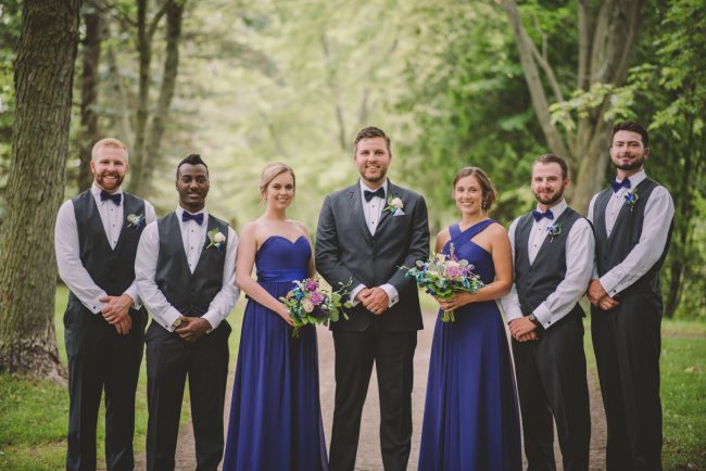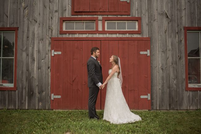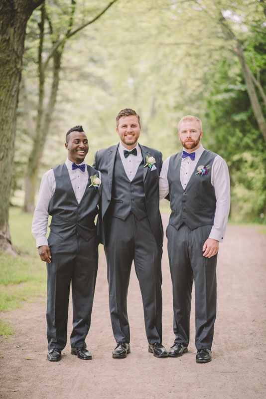 This past July, Ray and Billy’s big day finally arrived! We met at Templin Gardens in Fergus, where I positioned Billy by the water to wait for Rachel’s arrival.  The first look was followed by their formal photos at the Gardens, and at nearby property of one of their bridal party members.  This beautiful farm had horses — so in her yellow rain boots, Ray and Billy had a photoshoot with them, too!