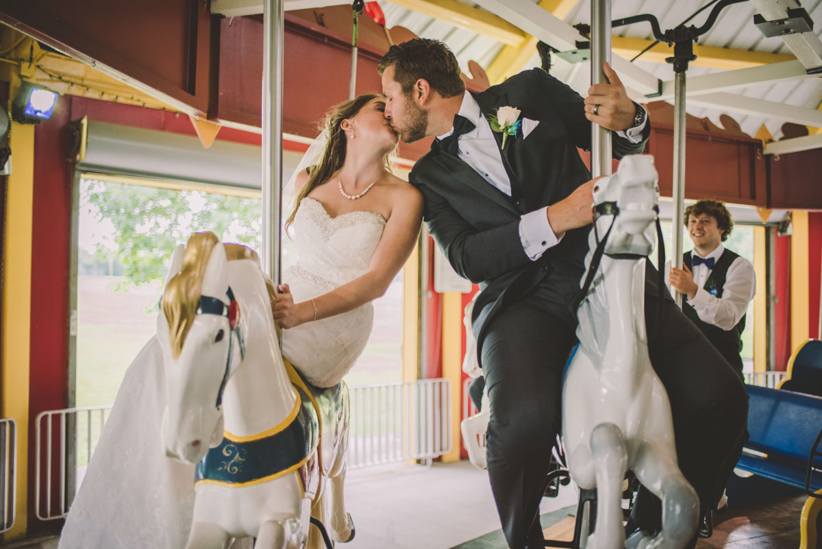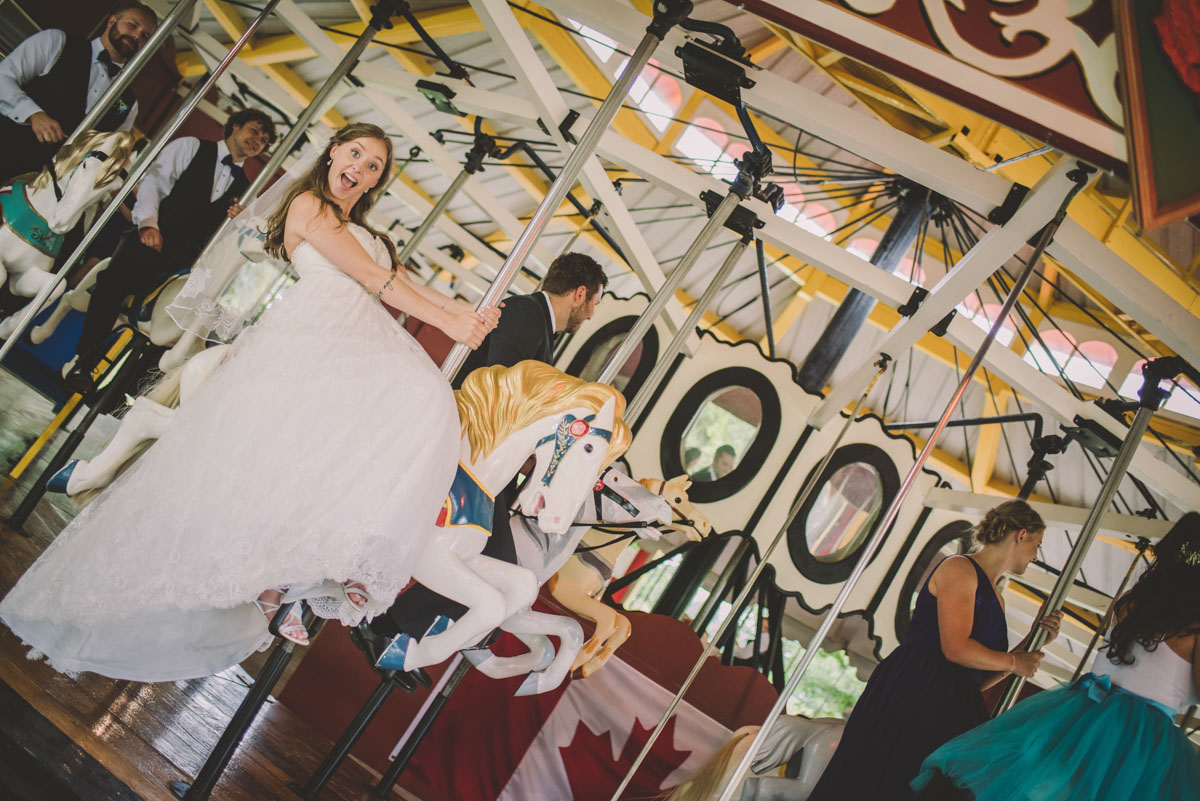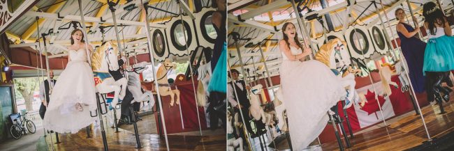 The ceremony took place at Lakeside Downtown in Guelph , followed by a few quick family photos. Bridal party photography took place at Riverside Park, where the entire bridal party boarded the carousel for a ride!