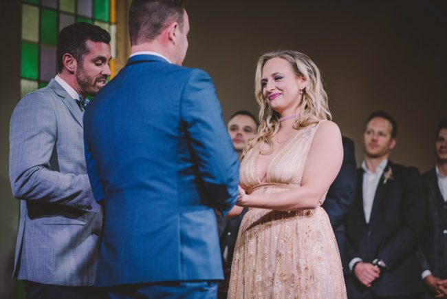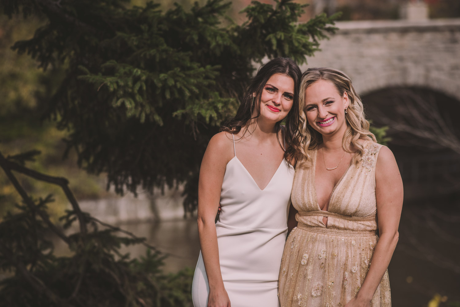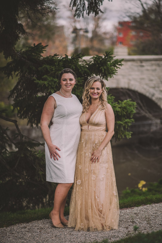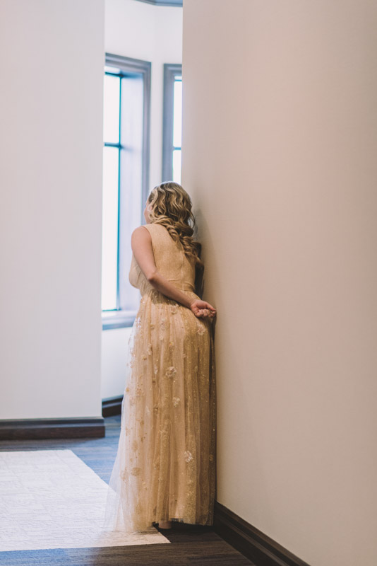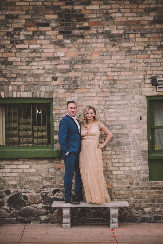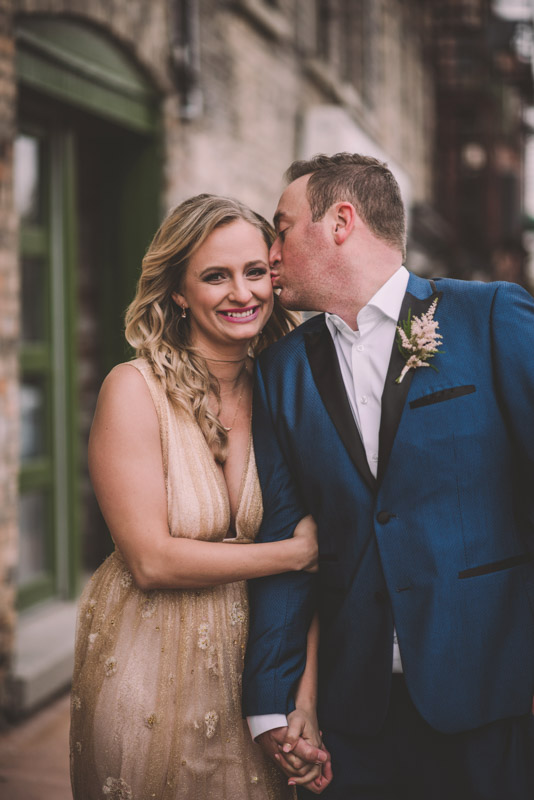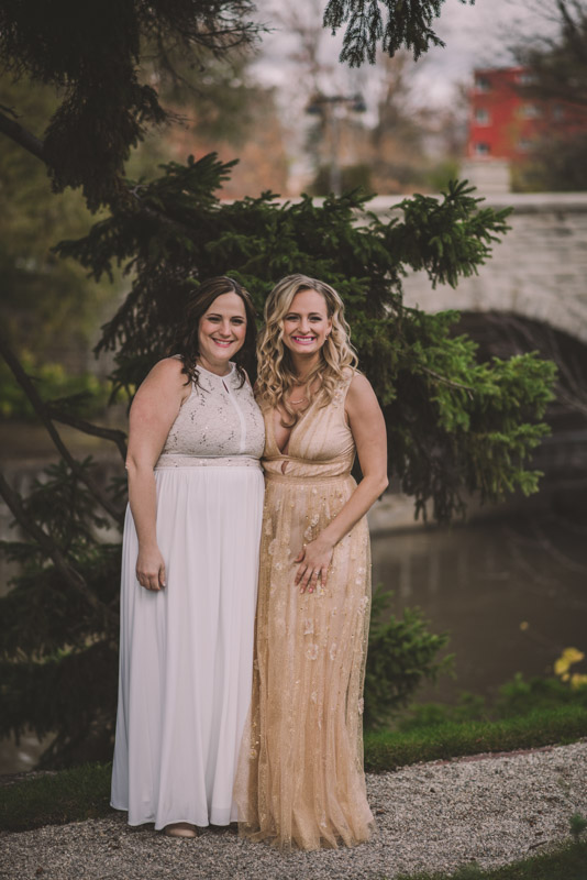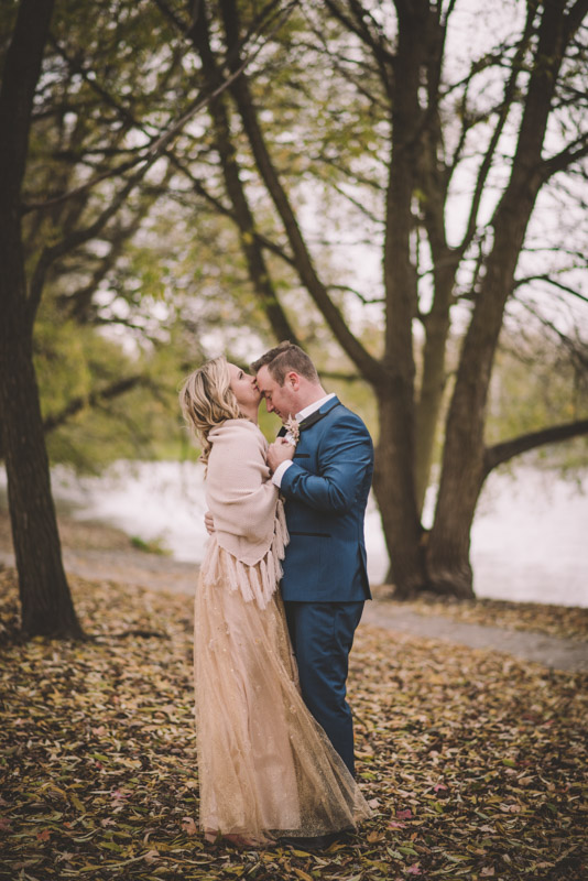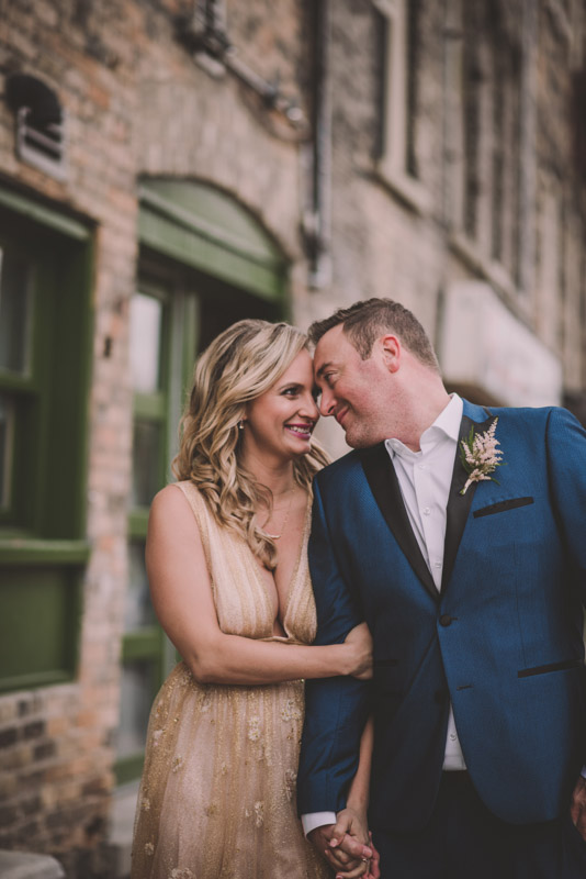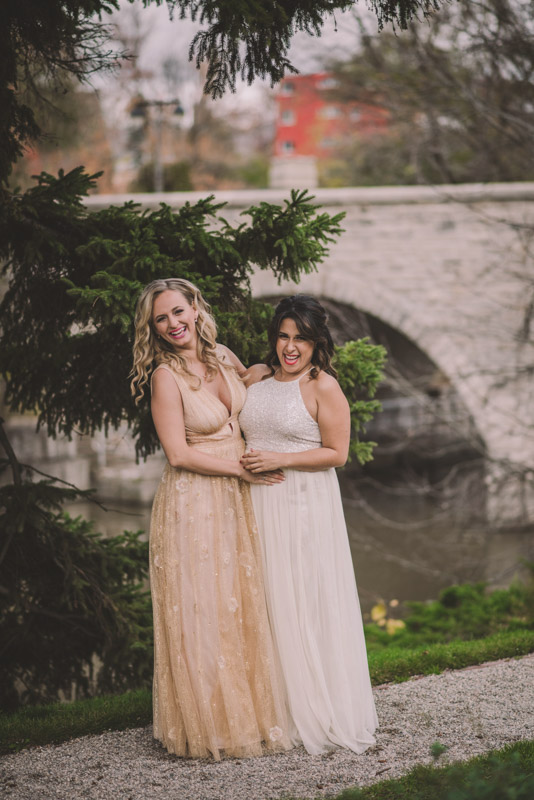 Michelle and Scott’s November wedding took place in picturesque Stratford. We started the day at the lovely Bruce Hotel which was a perfect backdrop for their preparation and first look photos. Michelle is a deeply creative person – her classic Hollywood glam wedding look featured a soft pink dress with a gold overlay that she had embroidered herself! It was stunning! To contrast this, all of Michelle’s bridesmaids were in white dresses – I love how they turned the tables on the ‘traditional’ wedding look.