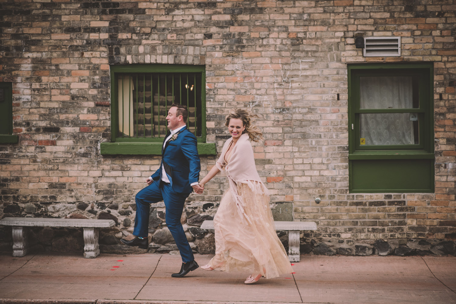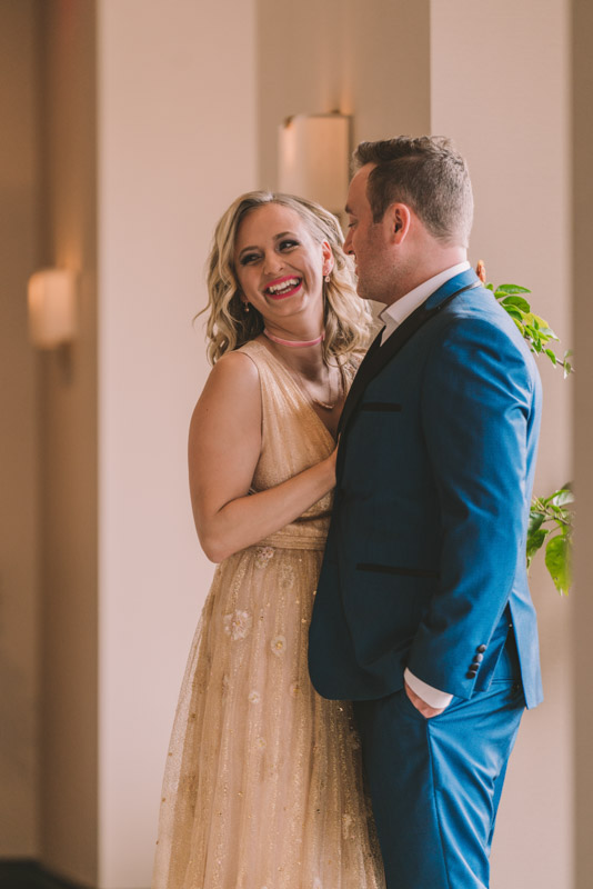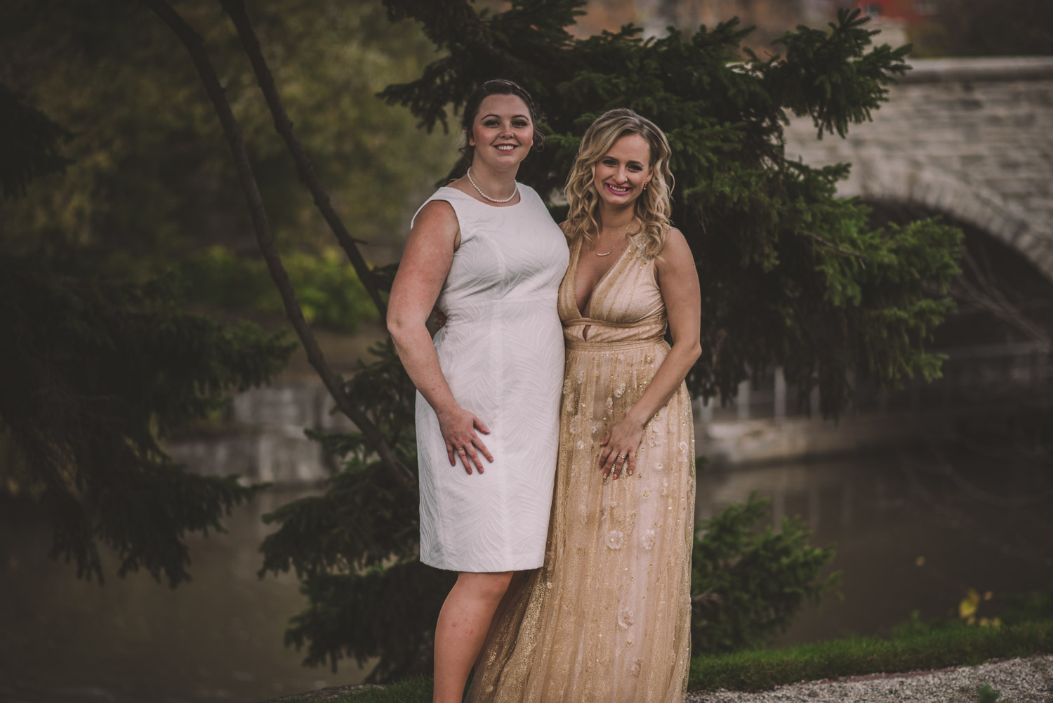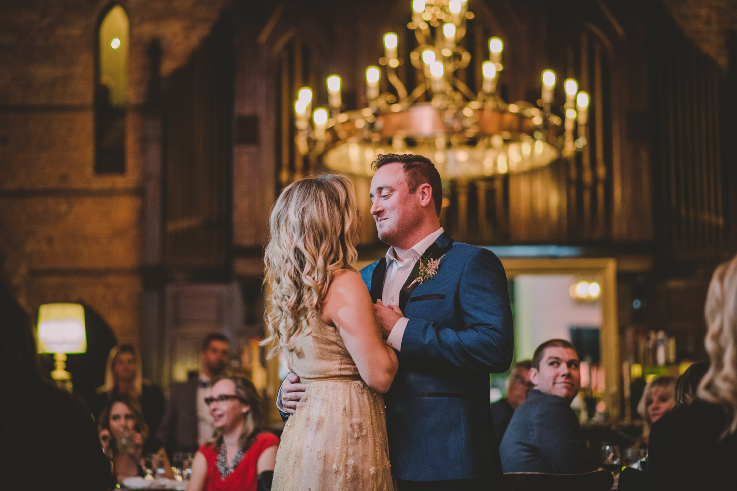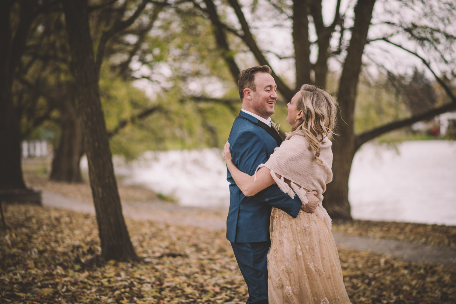 Michelle and Scott’s November wedding took place in picturesque Stratford. We started the day at the lovely Bruce Hotel which was a perfect backdrop for their preparation and first look photos. Michelle is a deeply creative person – her classic Hollywood glam wedding look featured a soft pink dress with a gold overlay that she had embroidered herself! It was stunning! To contrast this, all of Michelle’s bridesmaids were in white dresses – I love how they turned the tables on the ‘traditional’ wedding look.