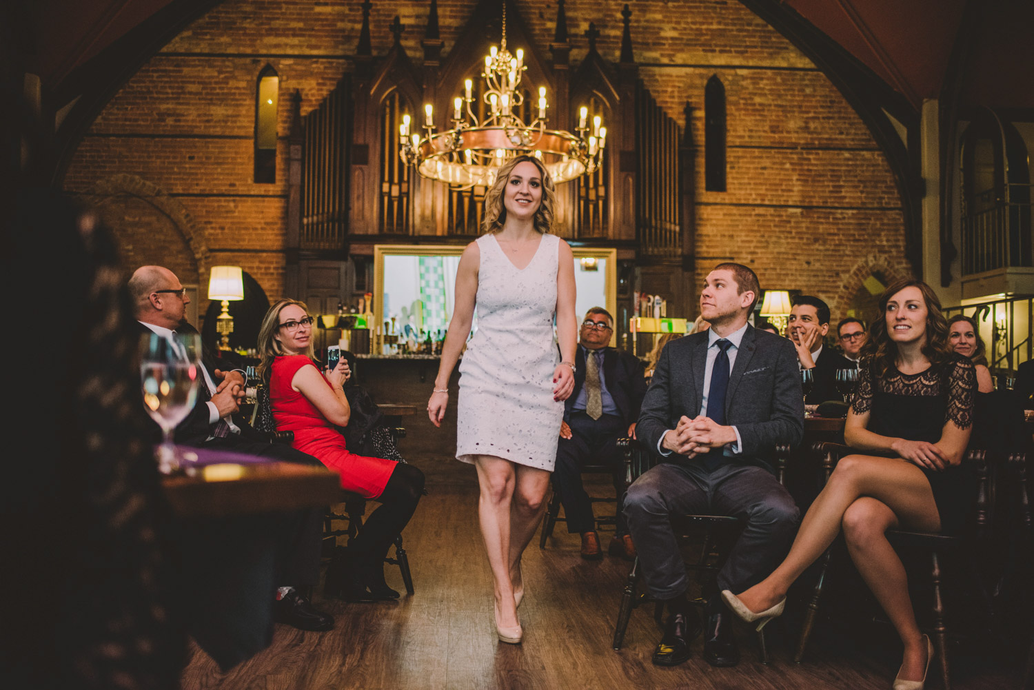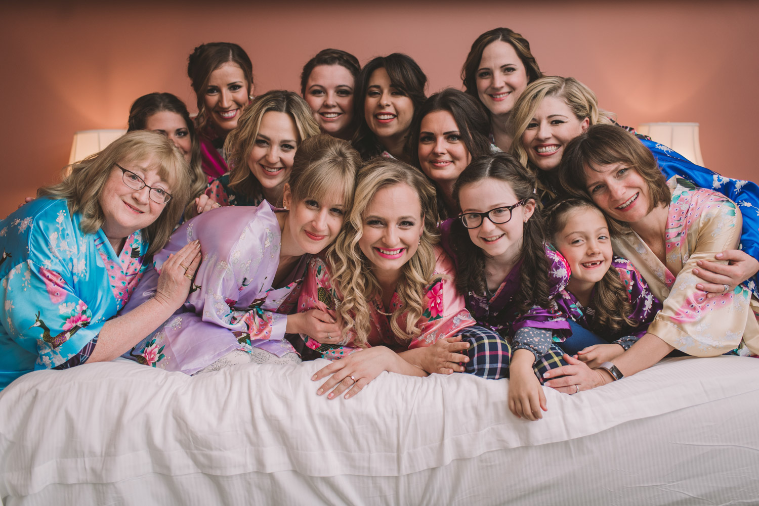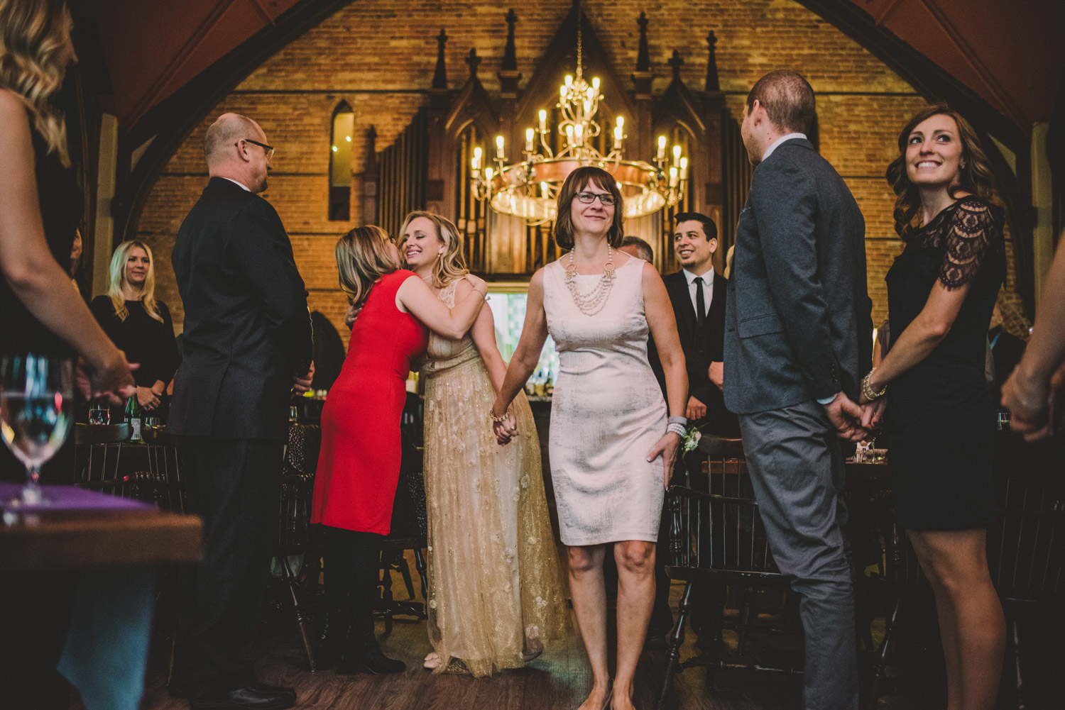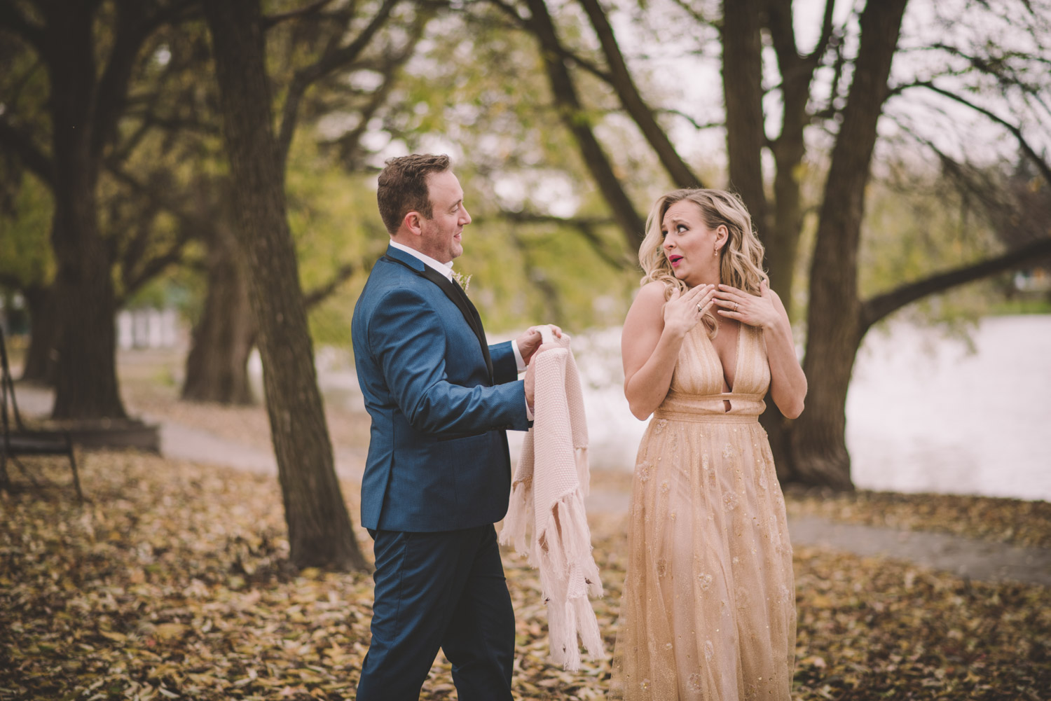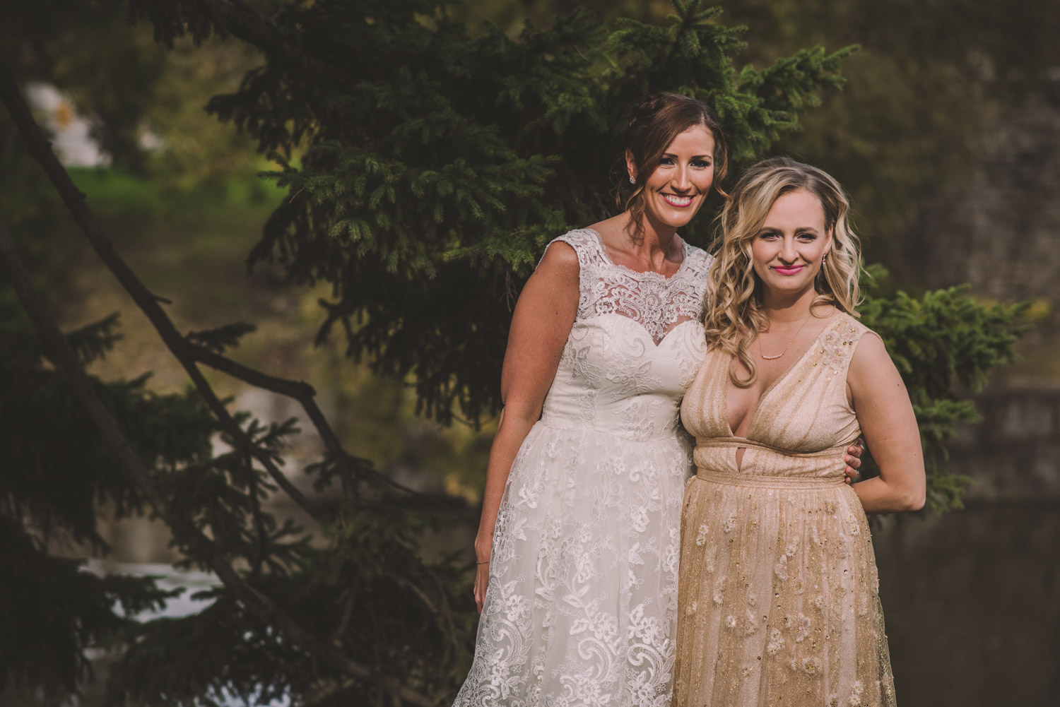 Michelle and Scott’s November wedding took place in picturesque Stratford. We started the day at the lovely Bruce Hotel which was a perfect backdrop for their preparation and first look photos. Michelle is a deeply creative person – her classic Hollywood glam wedding look featured a soft pink dress with a gold overlay that she had embroidered herself! It was stunning! To contrast this, all of Michelle’s bridesmaids were in white dresses – I love how they turned the tables on the ‘traditional’ wedding look.