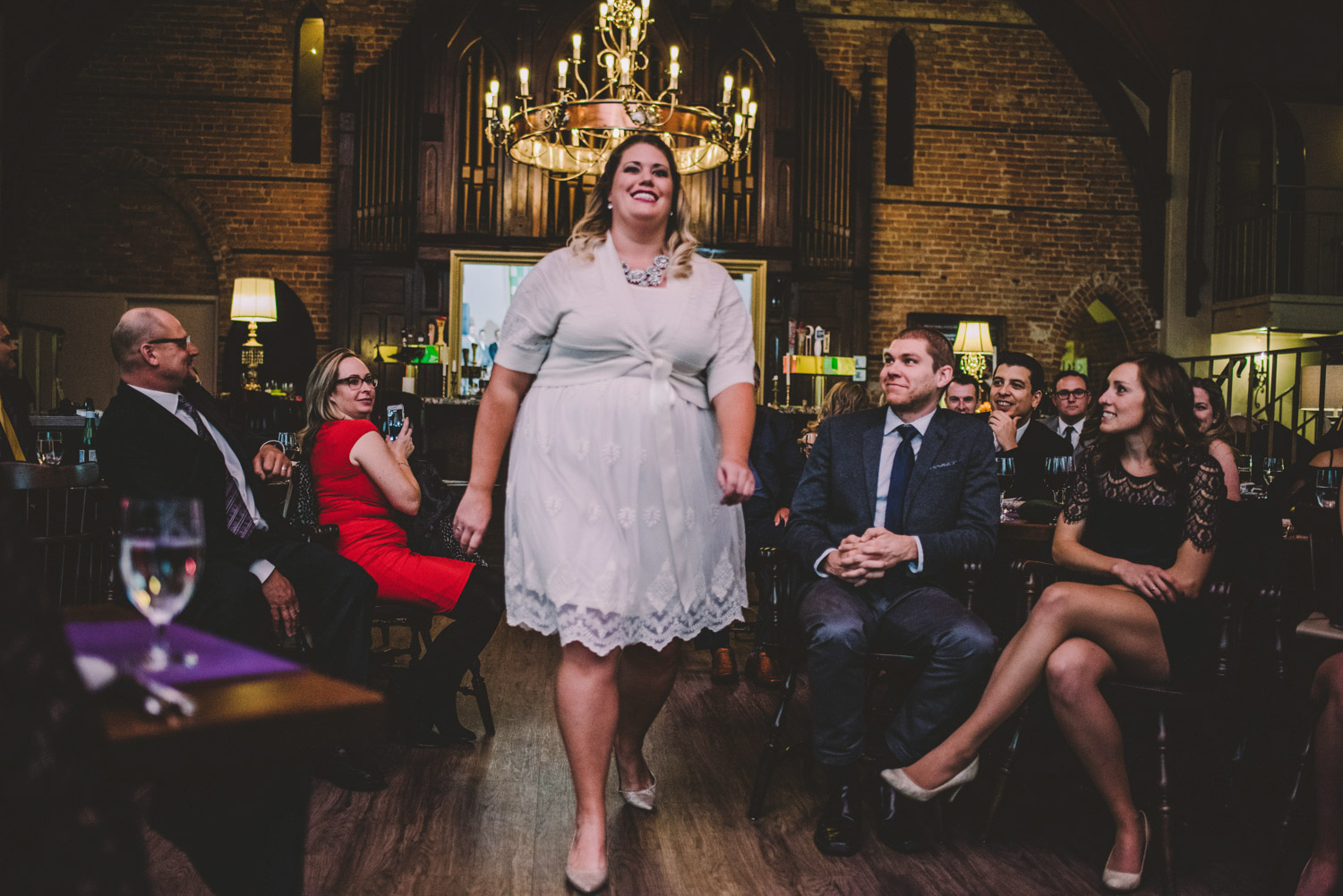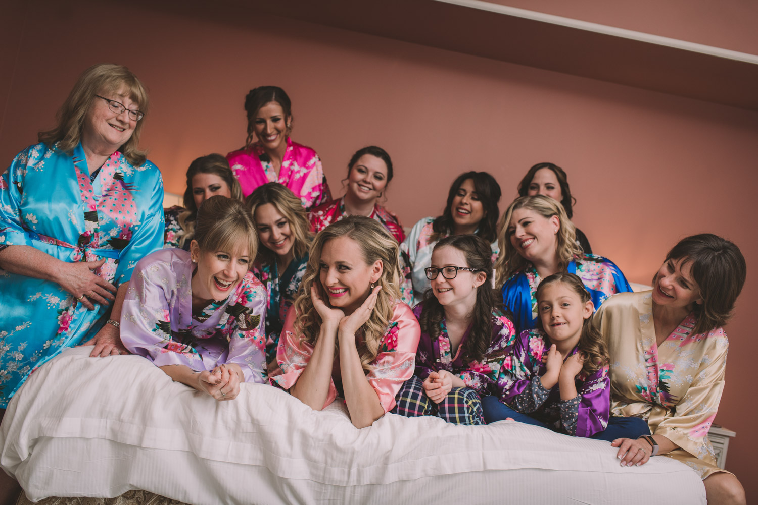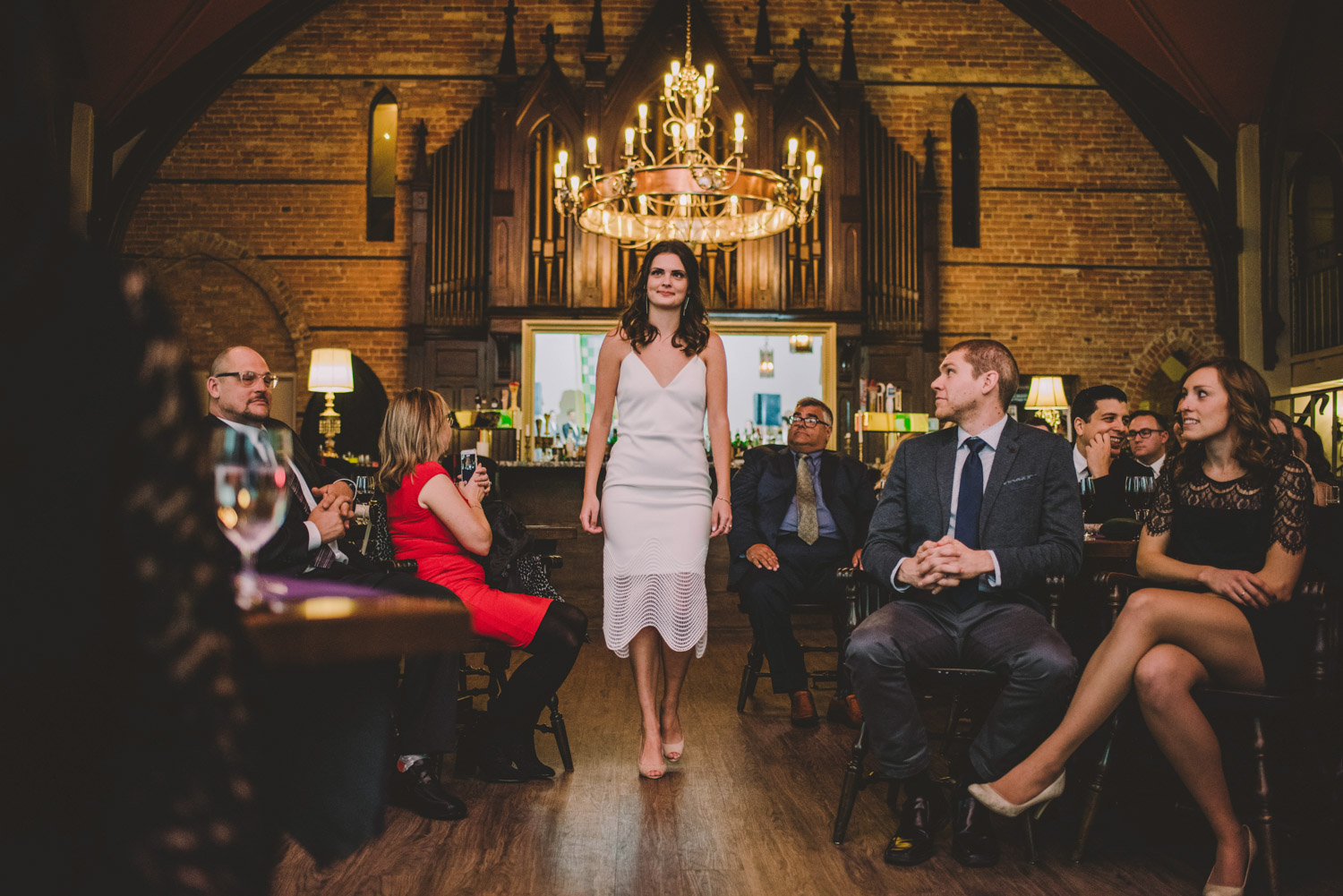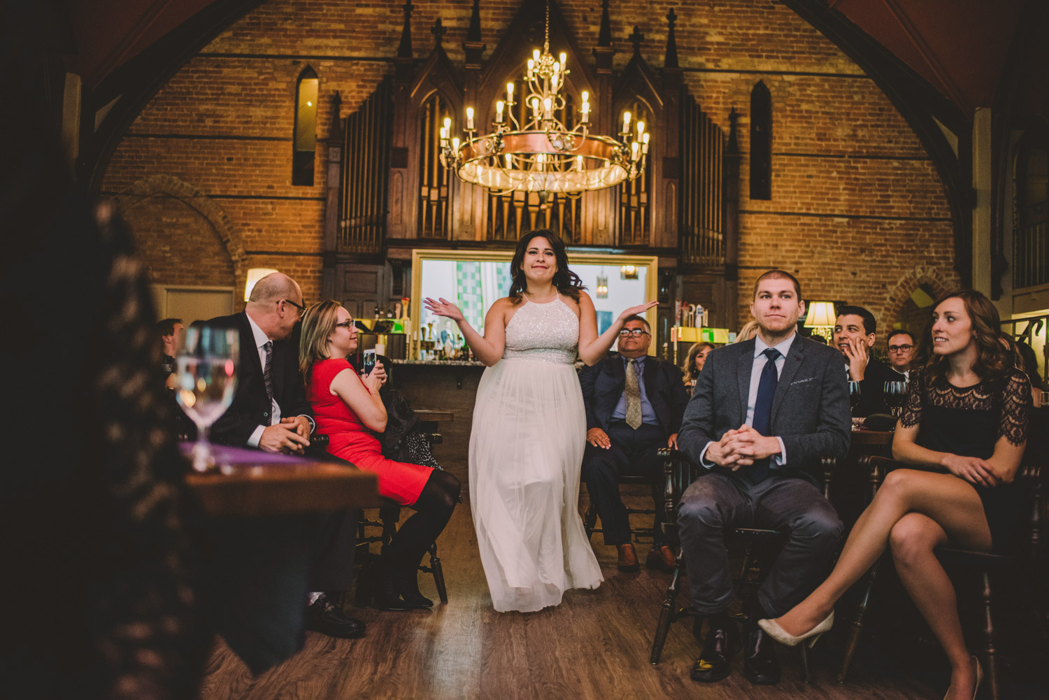Michelle and Scott’s November wedding took place in picturesque Stratford. We started the day at the lovely Bruce Hotel which was a perfect backdrop for their preparation and first look photos. Michelle is a deeply creative person – her classic Hollywood glam wedding look featured a soft pink dress with a gold overlay that she had embroidered herself! It was stunning! To contrast this, all of Michelle’s bridesmaids were in white dresses – I love how they turned the tables on the ‘traditional’ wedding look.