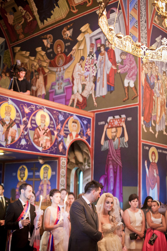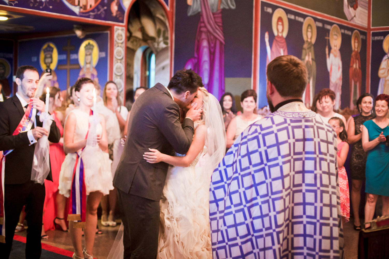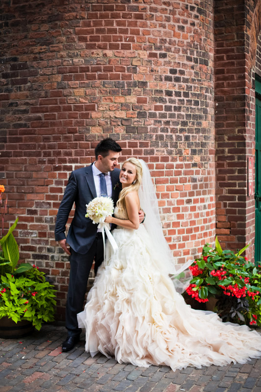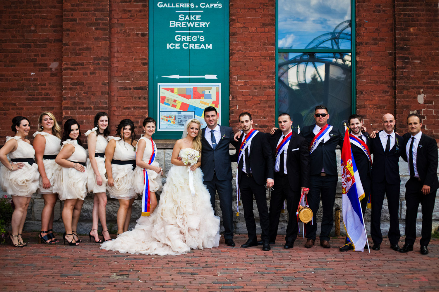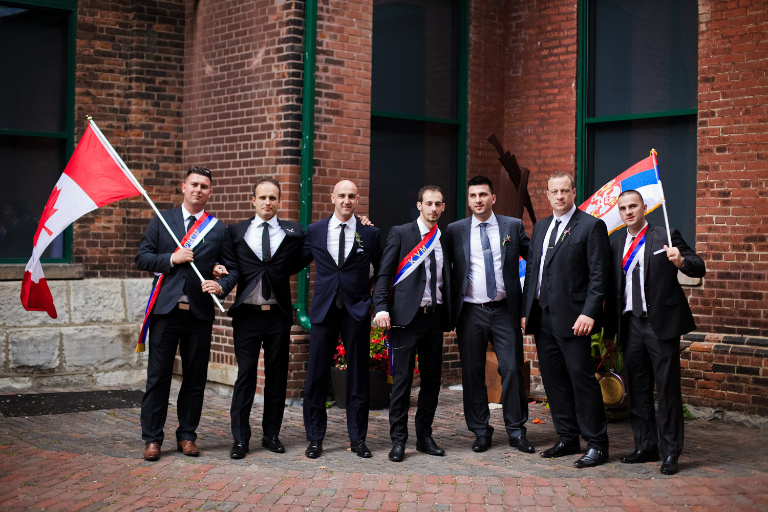 Danijela and Bozidar’s wedding was to take place in a few different cities – with the boys getting ready in Kitchener, and the girls getting ready in Cambridge.  This would be followed by a trip to the Holy Transfiguration Monastery in Milton for the traditional Serbian Orthodox ceremony.  For the bridal party photography, we travelled to Toronto’s iconic and busy Distillery District, followed by Polson Pier where we enjoyed an incredible view of the Toronto skyline.  The reception took place at the incredible One King West Hotel in the absolutely jaw-dropping Great Banking Hall.